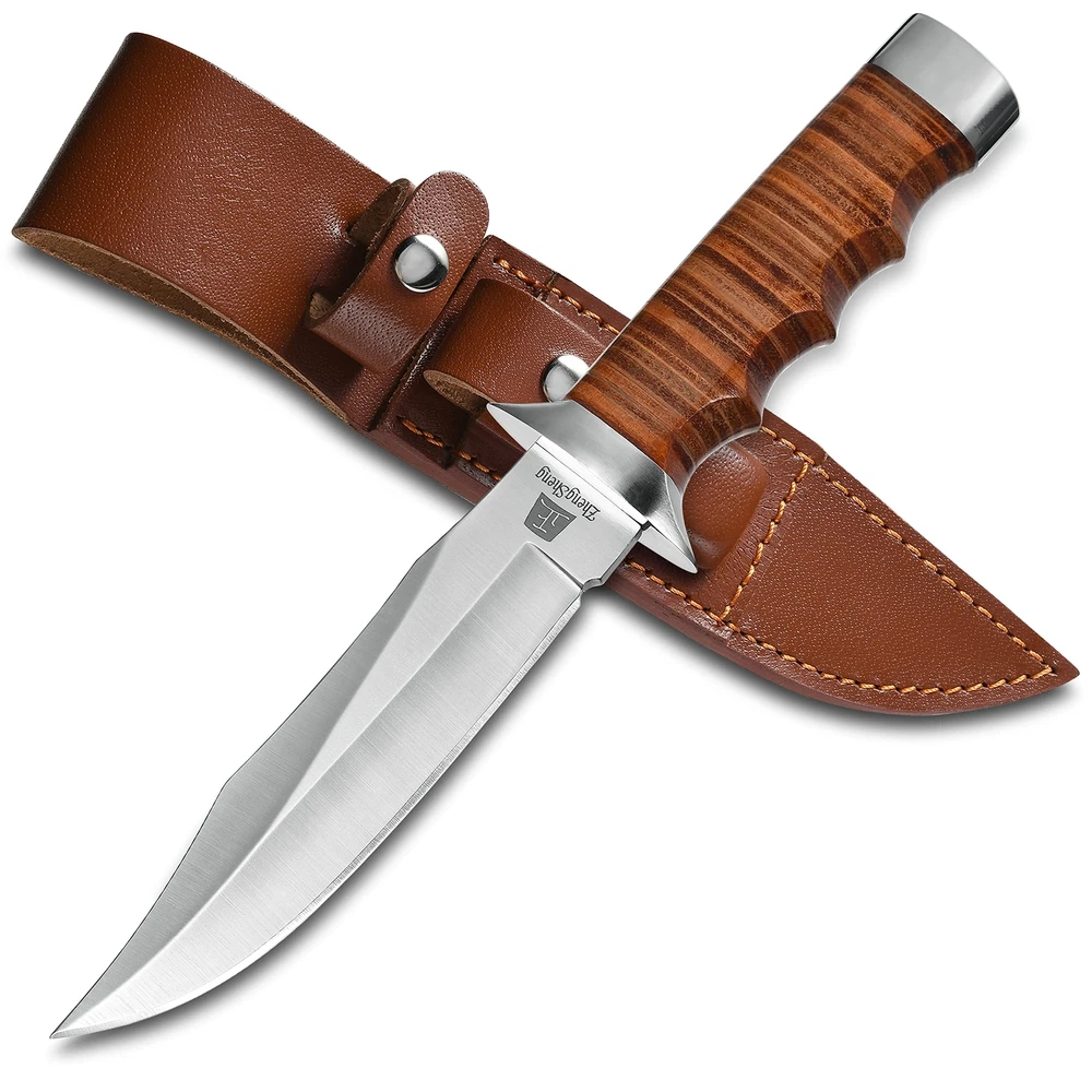 Knife Dimensions - Overall Length: 10.43 inch (265 mm); Blade Length: 5.83 inch (148 mm); Handle Length: 4.60 inch (117 mm); Blade thickness: 4.8 mm; Weight: 250 g Leather Handle: Classic design handle made of high-quality leather, ergonomically styled handle provides comfortable grip and balance. Includes pommel to guard your fingers. Genuine Leather Sheath:This fixed blade knife comes with a elegantly crafted leather sheath which made using high-quality and genuine leather that will not deteriorate and protective the blade safe. High quality protective sheath with integrated belt loop for secure carry and safely on your belt with easy access High Quality Blade: Made from premium quality materials. 420HC satin finish stainless steel blade provides an excellent balance of hardness and corrosion resistance. Excellent strength and edge retention for lasting durability Durable and Multi Use - This hunting knife is carefully hand-hammered, withstand even the toughest conditions and can retain sharp blade for long. Great for hunting, camping, bush crafting, fishing, hiking, and overlanding.