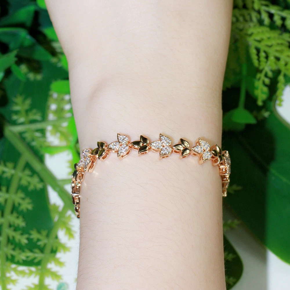 585 Rose Gold Plated Cubic Zirconia CZ Leaf Tennis Chain Link Bracelet Jewelry Specifications: 1. Condition: New 2. Material : Cubic Zirconia 3. Bracelet Size : 18.6 cm Features: 1. Cubic Zirconia High Quality Material - Diamond-like Brilliance , Prong Setting and CZ Stone are stable. 2. A Perfect Jewelry Gift for Women , Girls , Mother , Wife , Lover , Fiancee , Friends . 3. Suitable for Various Occasions: Ideal for Wedding, Prom, Pageant, Parties, Homecoming, Black Tie Formal Affairs, Holidays , Birthday , Christmas , Valentine's Day , Anniversary and Special Occasions. Package Includes: 1Pc Bracelet Payment Delivery details Terms of sales & Feedbacks About us & Contact us Our commitment Payment 1. We only ship item to your Ebay verified address . Please Make sure all address are the same 2.Please leave note in ebay when making the payment if you have any special request (colors/size). Delivery details We only send items to the registered eBay address.Items will be shipped within 2 business days from the date payment is received (not include public holiday and weekend) . As per eBay regulations, import duties, taxes, and customs charges are the buyer's responsibility. Please check with your country's customs office to determine what these additional costs may be prior to bidding or buying. Terms of sales & Feedbacks After-Sale Please contact us to request a return/replace/refund authorization .It will be best if you use ebay message to contact me. 1, Return and replacement request is available only the requests within 30 days after parcel received. 2, Returning the item as the same condition as received. Situation and solution Defectives ---Please contact us and provide a photo of the defective part. After situation confirmed,we will offer you refund/return/replacement according to the situation Not as Described ---Please contact us and provide a photo of the wrong part. After situation confirmed,we will offer you refund/return/replacement according to the situation Not Received ---Please undersatnding shipping on the way was out of our control ,because of the busy shipping season,holidays,bad weather or force majeure etc. It may be delay for days. But if it took too much time and not deliveried, Please message me, I will offer you solution for it. Feedbacks 1. If you are satisfied with our service, please leave us a + Good feedback and rate the details of the transaction (DSR) with a. . When you rate the shipping time part please take international transit into consideration.] Your recognition will make us more confident to develop business and serve you better. 2. Please contact us first if you have any problem with the items,we will solve it in time ! 3. Please do not leave Neutral or Negative Feedback before you contact us, Thanks For Your Business ! About us & Contact us Working time: Chinese time(Eastern eight zones):Monday to Friday ,9:00 am to 6:00 pm. We do not work on chinese legal holiday. Message reply: We will reply all messages within 24 hours of business time. Please contact us via ebay message, it was the best way for both you and us to solve problems. Any questions or anything you need, please feel free to contact us. Our commitment 1.Wholesale price will be offered to you if you need in bulk ! 2.About Size