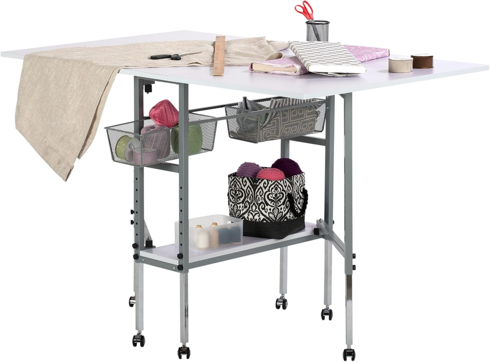 Store New Arrivals Add to Favorite View Feedback Contact Hobby and Cutting Table - 58.75" W X 36.5" D White Arts and Crafts Table with 2 Mesh Storage Drawers, Silver/White Description Item model number 13374.0 Item Weight 58 Pounds Minimum Height 30.25 Inches Assembly Required Yes Color Silver/White Finish Type Polished Material wire mesh and metal Country of Origin China Global Trade Identification Number 00017342133747 Product Dimensions 36"D x 58.75"W x 39.25"H Base Type Casters Frame Material Alloy Steel Is Discontinued By Manufacturer No Maximum Height 39.25 Inches HOBBY & CUTTING TABLE: Stylish design features a 58.75" wide and 36.5" deep tabletop when fully extended; Perfect for spreading out and diving into a variety of creative projects, including sewing, writing, crafting, and cutting fabric OFFERS STORAGE SPACE: Includes two slide-out, metal mesh storage drawers and a lower shelf, so you can store fabric, art supplies, and more without the clutter; Allows you to organize supplies and keep them close while working ADJUSTABLE TABLETOP HEIGHT: Tabletop height can be adjusted from 29.75 inches to 38.75 inches; Provides back relief on longer art projects and creates a versatile workspace no matter the project; Knob adjusts height in 1.5" increments SUSTAINABLE DESIGN: The powder-coated frame and thick tabletop make this sewing table with drawers durable and ready for years of use; Includes six floor casters for mobility and four lock for stability DIMENSIONS: OVERALL: 58.75" W x 36.5" D x 29.75" - 38.75" H (easily folds to 12.25" W); CENTER TOP: 10.75" W x 36.5" D; FOLDING PANELS: 24" W x 36.5" D; DRAWERS: 7.75" W x 14" D x 4.5" H; BOTTOM SHELF: 7.75" W x 29.5" D The Sew Ready Hobby and Cutting Table makes finding a place to create easier than ever. Designed with a 58.75" wide and 36.5" deep tabletop when fully extended, this cutting and hobby desk creates the perfect space for spreading out art supplies as you create, sew, cut fabric, adjust patterns, and work on different hobbies. Organize your sewing supplies and keep them handy with the two mesh fabric storage drawers and convenient lower shelf. This crafts table adjusts heights to help provide back relief and comfort while working on longer artistic projects. Make your space your own with the Sew Ready Hobby and Cutting Table. Overall Dimensions: 58.75" W x 36.5" D x 29.75" - 38.75" H (easily folds to 12.25" W) Center Top Dimensions: 10.75" W x 36.5" D Folding Panels Dimensions: 23.75" W x 36.5" D Two Slide-Out Wire Mesh Drawers Dimensions: 7.75" W x 14" D x 4.5" H Bottom Shelf for Storage Dimensions: 7.75" W x 29.5" D ABOUT US We offer the best prices around on high quality products. Our E-store includes media such as books, movies, music and games while offering electronics, toys, sporting apparel, clothing, tools, general home, garden items and more. SHIPPING We are always working hard to ensure your package arrives as soon as possible. Please understand that some factors like weather, high postal traffic, and the performance of shipping companies are outside of our control. We offer free shipping to the lower 48 states and ship within 2 business days of payment, usually sooner. We do not accept P.O. Boxes. Please provide a physical address. For shipping outside of the continental USA, we only use eBay's Global Shipping Program.The item is shipped to KY and then sent to the rest of the world. International customers are responsible for all duties and taxes. Continue to check out in order to calculate costs for shipping the item to your country. Messages regarding eBay's Global Shipping Program MUST be directed at eBay EXCLUSIVELY. RETURNS We offer a 30-Day Return Policy on items which you are not completely satisfied with. You have the option for a full-refund or an exchange of the item. No returns are available on items shipped outside of the USA. PAYMENT We accept PayPal. CONTACT US This page content is yet to come Please ad us to your favorite seller and visit again later Thank You CUSTOMER SATISFACTION We try our very best to make sure every customer is completely satisfied. If there's a problem, message us! We're happy to help. WE ACCEPT Copyright © 2021 AutoDS. | All Rights Reserved