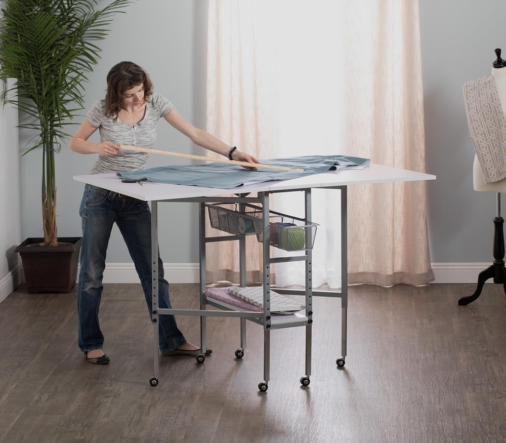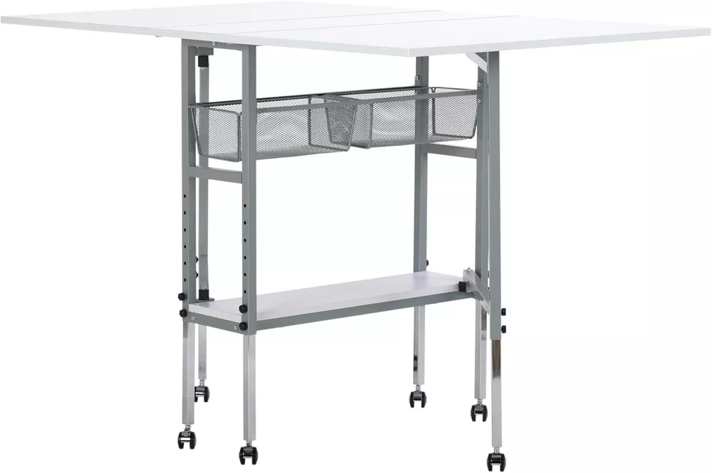 Hobby and Cutting Table - " W x " D White Arts and Crafts Table with 2 Mesh Storage Drawers, Silver/White HOBBY & CUTTING TABLE: Stylish design features a " wide and " deep tabletop when fully extended; Perfect for spreading out and diving into a variety of creative projects, including sewing, writing, crafting, and cutting fabric OFFERS STORAGE SPACE: Includes two slide-out, metal mesh storage drawers and a lower shelf, so you can store fabric, art supplies, and more without the clutter; Allows you to organize supplies and keep them close while working ADJUSTABLE TABLETOP HEIGHT: Tabletop height can be adjusted from inches to inches; Provides back relief on longer art projects and creates a versatile workspace no matter the project; Knob adjusts height in " increments SUSTAINABLE DESIGN: The powder-coated frame and thick tabletop make this sewing table with drawers durable and ready for s of use; Includes six floor casters for mobility and four lock for stability DIMENSIONS: OVERALL: " W x " D x " - " H (easily folds to " W); CENTER TOP: " W x " D; FOLDING PANELS: 24" W x " D; DRAWERS: " W x 14" D x " H; BOTTOM SHELF: " W x " D The Hobby and Cutting Table makes finding a place to create easier than ever. Designed with a " wide and " deep tabletop when fully extended, this cutting and hobby desk creates the perfect space for spreading out art supplies as you create, sew, cut fabric, adjust patterns, and work on different hobbies. Organize your sewing supplies and keep them handy with the two mesh fabric storage drawers and convenient lower shelf. This crafts table adjusts heights to help provide back relief and comfort while working on longer artistic projects. Make your space your own with the Hobby and Cutting Table. Overall Dimensions: " W x " D x " - " H (easily folds to " W) Center Top Dimensions: " W x " D Folding Panels Dimensions: " W x " D Two Slide-Out Wire Mesh Drawers Dimensions: " W x 14" D x " H Bottom Shelf for Storage Dimensions: " W x " D