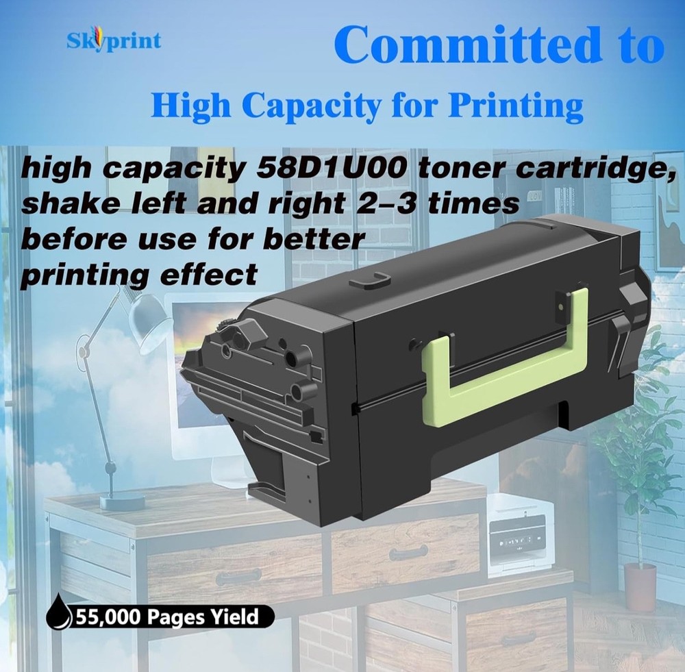 #2456 58D1U00 Black Ultra High Yield Toner Cartridge Campatible Lexmark 58D1U00 58D1U0E Black Toner Cartridge Work for Lexmark MS823 MS725 MS825 MS826 MX722 MX725 MX822 Printer Brand SkyPrint Color Black Compatibility Options Compatible MS725dvn, MS823dn. MS823n, MS824de, MS825dn, MS826de, MX722ade, MX722adhe, MX725dvn, MX822ade, MX822adxe, MX824ade, MX824adxe, MX826ade, MX826adxe Page Yield 55000 Manufacturer SkyPrint Product Quantity:1-pack 58D1U00 Black Toner Cartridge 58D1U00 Ultra High Yield Toner Compatible With Printers:Lexmark MS725dvn, MS823dn. MS823n, MS824de, MS825dn, MS826de, MX722ade, MX722adhe, MX725dvn, MX822ade, MX822adxe, MX824ade, MX824adxe, MX826ade, MX826adxe Printer High Page Yield:up to 55,000 pages per 58D1U00 black toner at 5% coverage of A4 Letter SkyPrint 58D1U00 toner cartridges come with intelligent chips that automatically recognize and provide printing, Not damaging the machine,Shake the toner cartridge horizontally 2-3 times before use to evenly distribute the toner When purchasing 58D1U00 toner cartridge, please confirm if your printer model meets the requirements