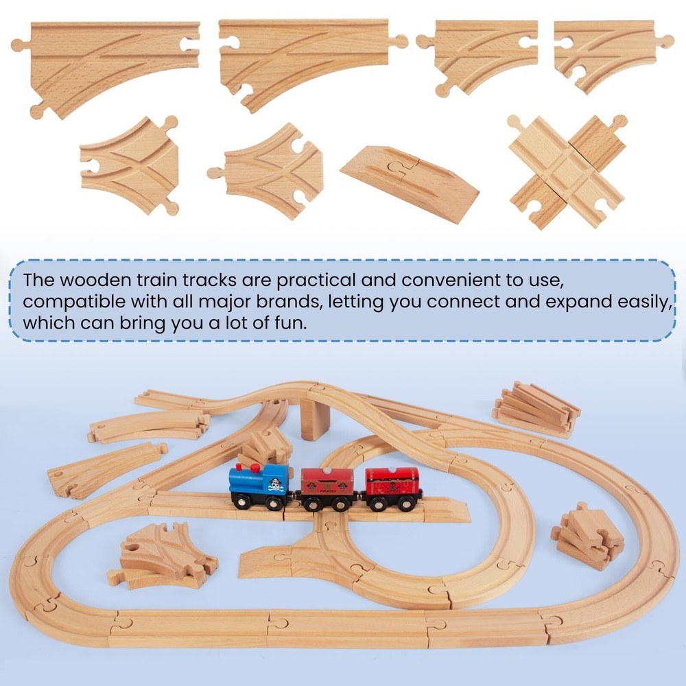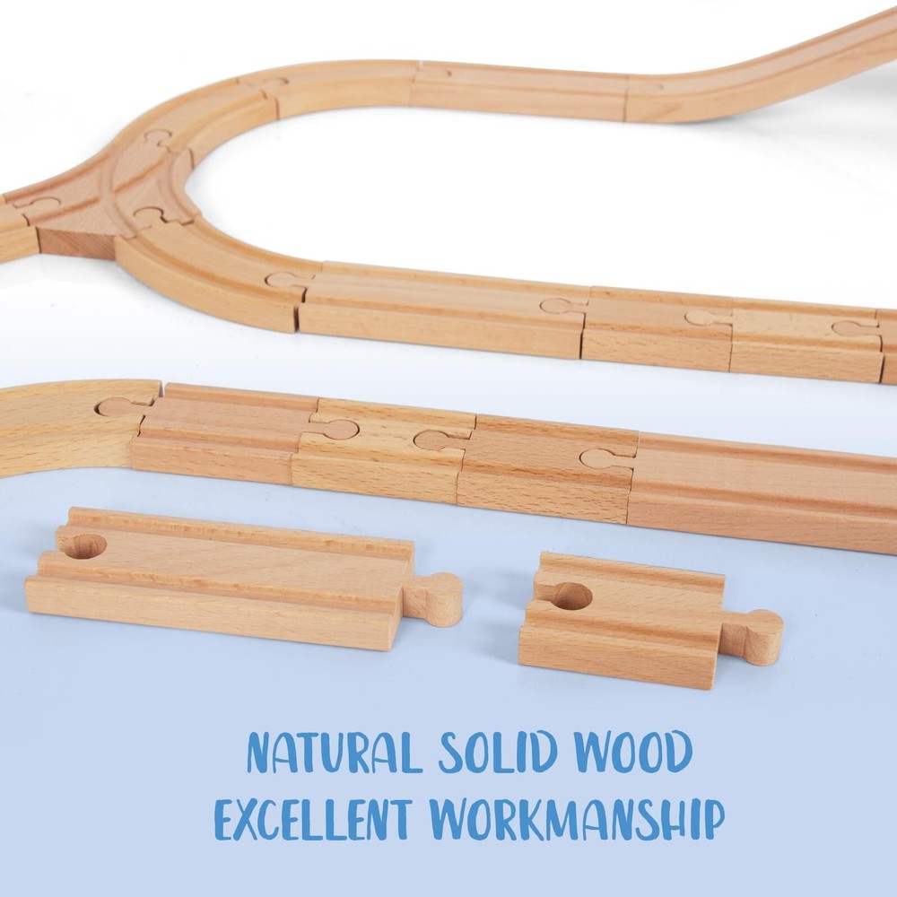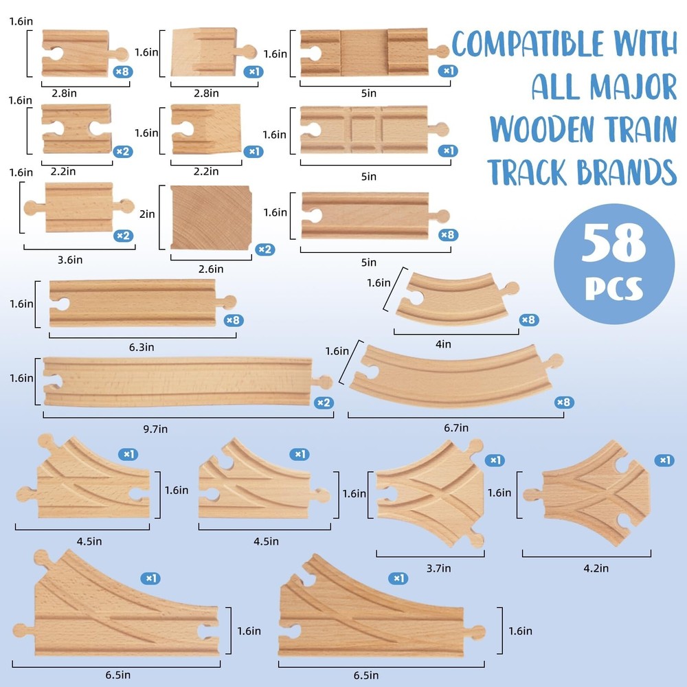 Wooden Train Tracks 58 Piece Set, Track Expansion and 9 Distinct Pieces - 100% Compatible with All Major Brands Including Thomas Wooden Railway System Product Details Style: 58 Pcs Brand: WoodenEdu MPN: 42007-RL-42008 UPC: 741654624661 EAN: 0741654624661 Product Dimensions: 10 x 5 x 3 inches Item Weight: 4.71 pounds Country of Origin: China Manufacturer recommended age: 3 years and up Manufacturer: WoodenEdu 58 Pieces of Premium Wood Train Tracks Work with All Major Brands of Trains and Track The Easiest Way to Expand Your Train Track Collection Includes Straight Track, Curved Track, and Curved Switch Track Premium Wood Craftsmanship: With a smooth edge and non-toxic water-based paint, all wood of the kid's train expansion set is made of 100% beech wood from Australia.