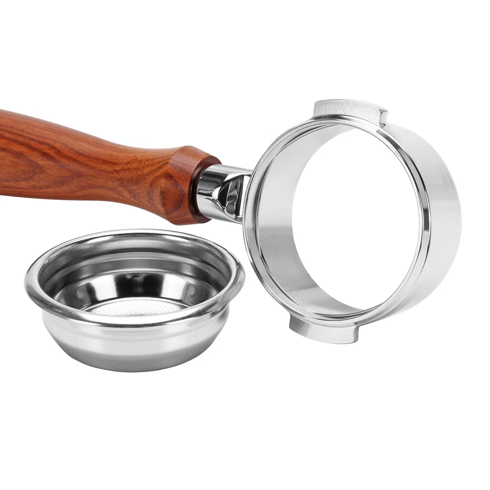58mm Bottomless Portafilter For Breville BES900XL BES920XL BES920BSXL BES920CB XL Description: --FITS MODEL: Compatible with Breville Dual Boiler Espresso Machine BES920CBXL BES920BSXL BES920XL BES900XL , please confirm your espresso machine model before order. --BENEFITS OF USING A BOTTOMLESS PORTAFILTER: This naked bottomless portafilter gives an unobstructed view of your extraction , helping you to see if any mistakes right away , allow you to monitor your shots. It is a critical tool for a barista, and especially in dealing in a new bean or learning how to brew espresso. --CHECK WHETHER THE COFFEE GRINDER IS EVENLY DISTRIBUTED OR PRESS TAMPED: Without a spout obstructing your view, you can see the coffee pass through the puck and detect any non-uniformities that might be causing an uneven extraction. --CLEAR VIEW OF THE ESPRESSO'COLOR AND TEXTURE: The bottomless portafilter is that the clear view lets you examine your espresso’s color and texture as it brews. --EASY TO CLEAN: Cleaning a bottomless portafilter is also significantly easier than one with a regular bottom. Bottomless portafilters have fewer places for grounds to get stuck and it’s much easier to rinse them knowing you didn't leave any stragglers behind Specifiction: Type: 58mm Portafilter Material: Stainless Steel+ Solid Wood Handle Color: Silver Size: 58mm Package: 1 Pc 58mm Portafilter