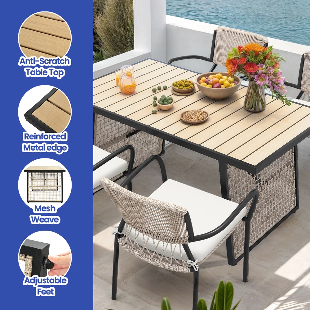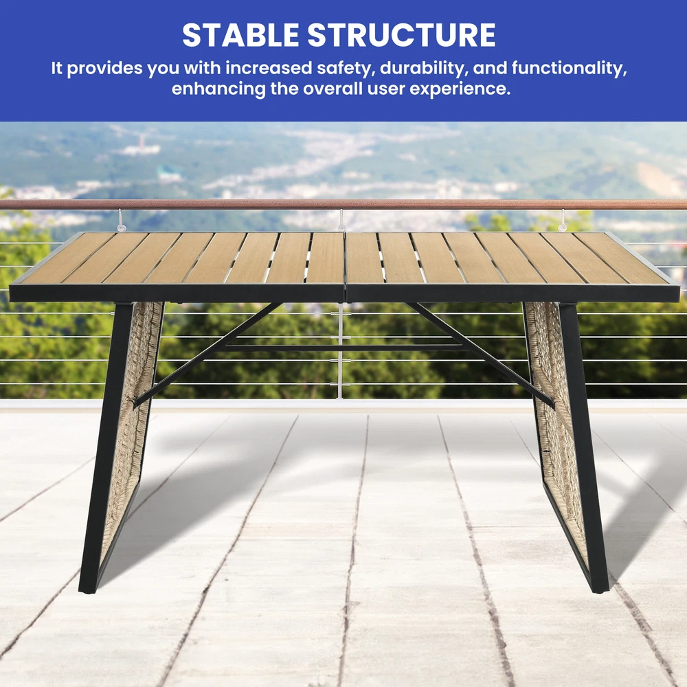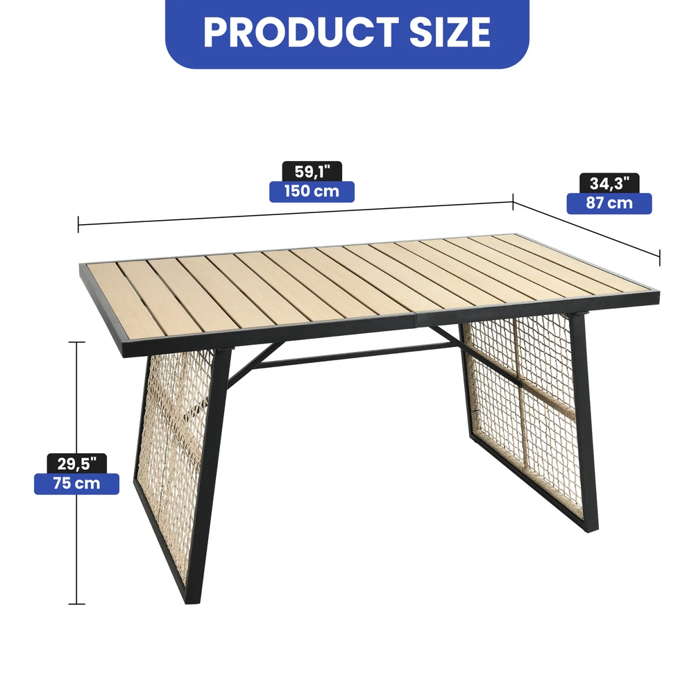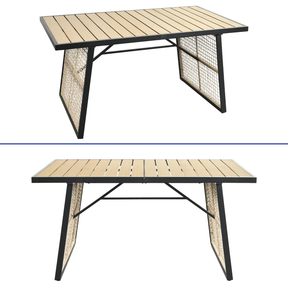 59" Dinner Table 6 People Dining Room Faux Wood Kitchen Patio Porch Gathering Product Description NOTE: This Product Only Include The Table & Do Not Include The Chairs, Professional Installation would be Highly Recommended. Description: 1. Color: Brown; 2. Table Material: Iron + Faux Wood + Mesh Weave; 3. Features: Anti-Scratch Tabletop, Easy to Clean, Adjustable Feet for Stability, Durable Construction with Iron + Faux Wood + Mesh Weave, Weather-Resistant (Fade, Mold, Mildew, Rust, UV), Versatile for Backyard, Patio, Garden & Poolside, Supports 250 lbs 5. Recomended Uses: Backyard, Balcony, Lawn, Garden, Outdoor Patio, and Swimming Poolside. Features: 1. Stylish Indoor/Outdoor Dining Experience – Elevate Your Space : Transform your outdoor/indoor gatherings with this brown dining table that brings a touch of modern elegance to any setting. Its sleek design and rustic wood grain accents offer a sophisticated look, making it perfect for your backyard, patio, or garden. Enjoy memorable meals and lively conversations around a table that blends style with functionality. 2. Robust Construction – Engineered for Durability : Crafted from a premium blend of iron , faux wood , and mesh weave , this table is built to withstand the elements. The sturdy frame and well-constructed tabletop ensure a stable , long-lasting performance. With quality materials that resist scratches and maintain their finish over time, this dining table is designed to support up to 250 lbs with ease. 3. Weather-Resistant – Ready for Any Outdoor Condition : Designed specifically for outdoor use, the table features a waterproof and UV-resistant finish that protects against fading, mold, mildew, and rust. Whether you’re enjoying a sunny day or a light drizzle, this table retains its pristine appearance and functionality, ensuring a reliable performance season after season. 4. Adjustable Feet – Adaptable to Uneven Surfaces : Equipped with adjustable feet , this dining table effortlessly adapts to various outdoor surfaces, from grassy lawns to tiled patios. This feature guarantees a level, stable setup wherever you place it, making it ideal for any outdoor environment. The design ensures that your table remains secure and comfortable, no matter the terrain. Dimensions: 1. Weight Capacity: 250 lb 2. Overall Item Weight: 63.9 lb 3. Dining Table Dimensions: 59.1" L x 34.3" W x 29.5" H Package Included: 1. 1x Dining Table 2. 1x Instruction Manual 3. 1x Accessory Kit Shipping 1. Normally the item will be dipatched within 1 business day if payment is cleared before 12pm PST. 2. Please verify the correct shipping address in your PayPal account before making the payment. We only dispatch the item to the address that is sent to us at the time of checkout. 3. We don't ship to Hawaii, Alaska, Puerto Rico, APO/FPO/PO Boxes. 4. We don't provide local pick-up service. 5. Normally we will use USPS, UPS, FedEx & LTL to dispatch items. Payment 1. We accept PayPal and credit card. 2. We will ship to the confirmed Paypal shipping address that is provided with the payment only. Return 1. 30 days Money Back Guarantee. 2. Please contact our customer service to receive a RMA form first if want to return the item. 3. All returned items MUST in new condition with the original package. Contact If has any problem, please contact us by sending an ebay message. Our customer service will resolve the problem as soon as possible.