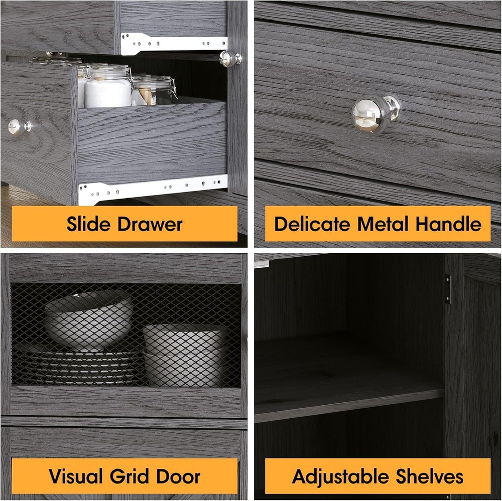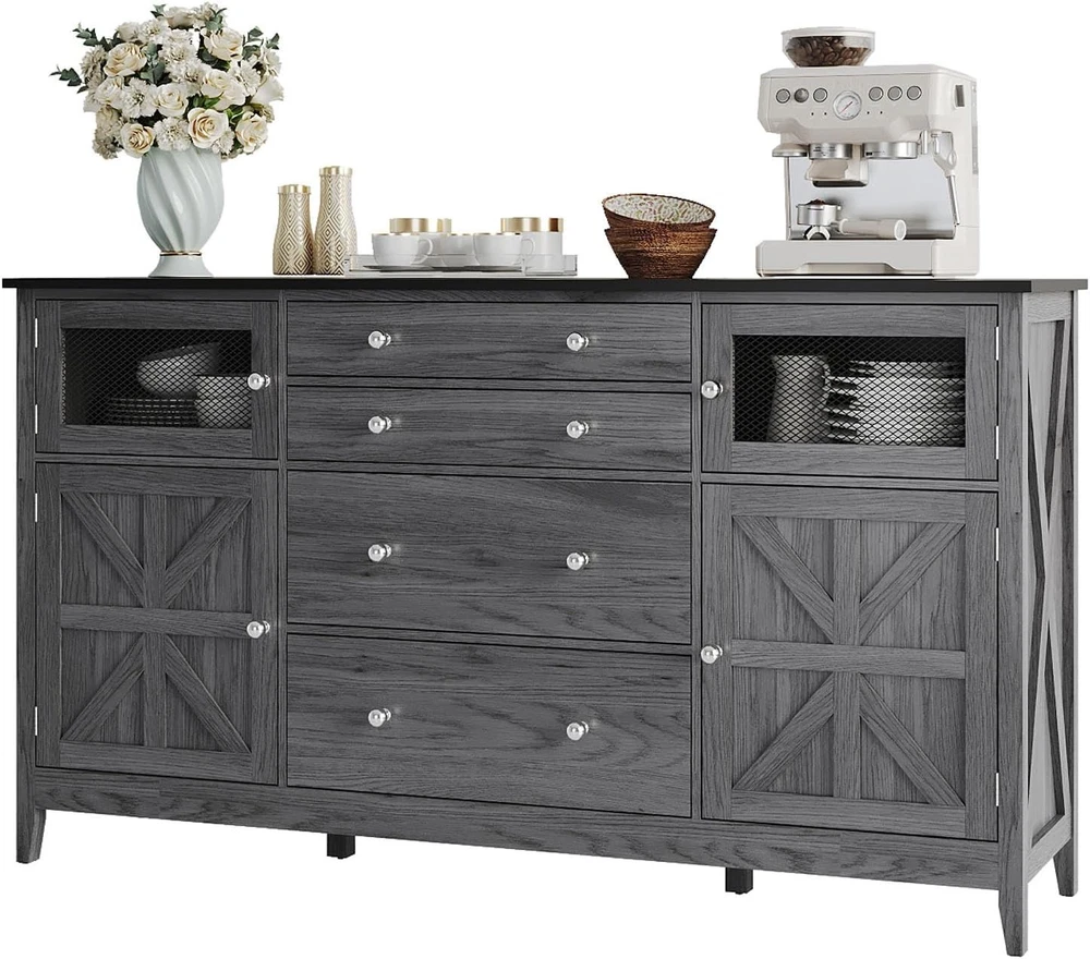 59" Farmhouse Buffet Cabinet with Storage,Sideboard Buffet Table with 6 Drawers & 2 Barn Door,Coffee Bar Cabinet with Adjustable Shelf for Kitchen,Living Room (Dark Grey, L59*W15.7*H33.5in) Product Description About this item Buffet cabinet With Spacious Space:This storage cabinet amazes with its large capacity. There are 2 visible drawers to keep frequently used cooking utensils and ingredients at a glance. There are also 2 different sizes of drawers and 2 Storage cabinet with doors, which in turn keeps less frequently used items well hidden and maintains a tidy look in the kitchen. Farmhouse Buffet Cabint:The Classic Farmhouse style sideboard seamlessly combines functionality,aesthetics, and space utilization.Both practical storage tool,but also for the kitchen to add retro style decorative goodies,so that you are cooking as if in a leisurely American country life,enjoy that unique warmth and comfort. Multi-purpose Storage Cabinet:This 59-inch large buffet,it seamlessly transforms into a dining room sideboard, kitchen or hallway storage cabinet. Great Quality & Excellent Workmanship: This buffet sideboard is made of HIGH-QUALITY materials, which are finely treated to ensure both strength and good texture. Moreover, it is full of details that show the quality, exquisite pull handles and iron mesh drawers, each of which adds to your experience. Easy to Assemble:This sideboard table comes with detailed Installation Instructions, all parts and accessories are easily identified with numbered stickers for easy recognition and.We will do a good check before delivery,please don't hesitate if you meet any problems with our products,we will provide you with a satisfactory solution. American country kitchen storage cabinets are both practical storage tools and decorative goodies that add a vintage touch to the kitchen. Sideboard Buffet Cabinet With Different Size drawers In order to separate the different sizes of cutlery, the drawers of this storage cabinet are divided into 2 sizes, the top 2 drawers for cutlery and the bottom one for larger dishes, jars. Product Features Side Cabinet With Door Adjustable dividers allow you to store different sizes of kitchenware. Spacious tabletop Not only is there storage for a multitude of different functions, but the huge table top is big enough to hold all your kitchen supplies, or a huge TV. Visual Cabinet The wire mesh design is not only more rustic but you can see what you need at a glance. Round Metal Handle High-quality metal round handles, feel great in your hand, rounded shape won't get hurt Farmhouse Decor The rustic design of the side X is not only aesthetically pleasing, it makes the whole table more solid. Adjustable dividers The 2 storage cabinets on the top and bottom of the side can accommodate different sizes of kitchen supplies.