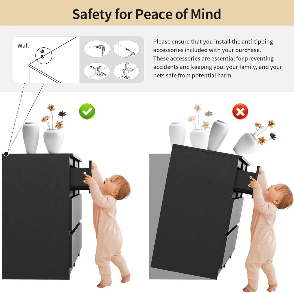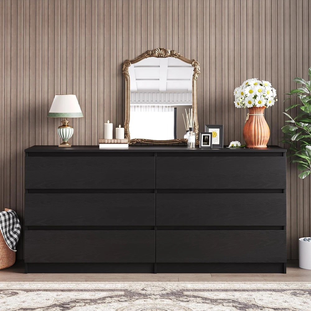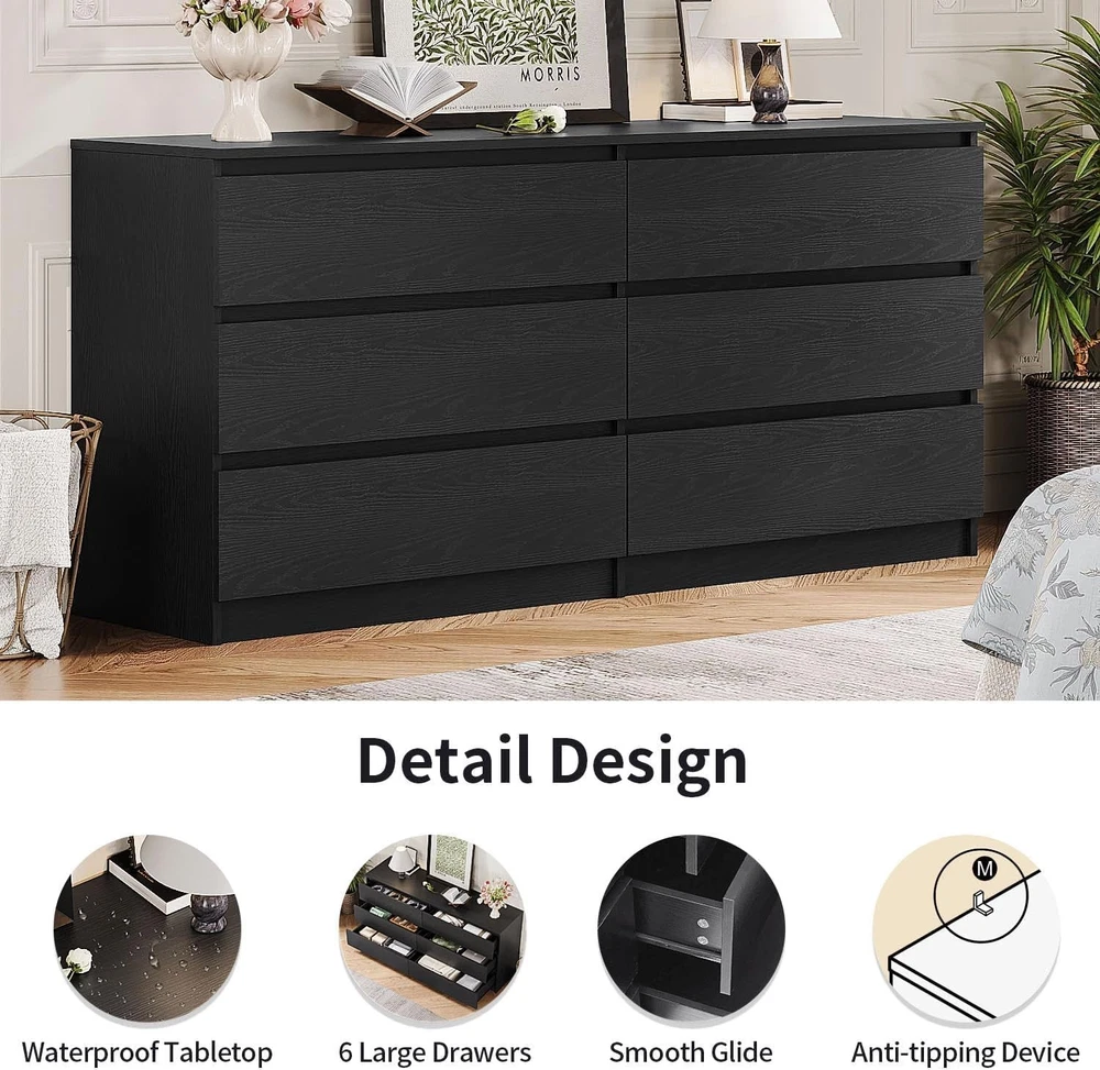 Product Description About this item 【Black Dresser】This 6 drawer dresser features a modern, minimalist design with a touch of sophistication. The clean wood panel finish, combined with its sleek, handle-free design, creates a refined and stylish appearance that complements any room. The simple yet elegant lines strike the perfect balance between contemporary style and timeless appeal, making it a standout piece in your home decor. 【Ample Storage Design】Designed to provide ample storage space, this black dresser includes 6 enlarged drawers that offer plenty of room for organizing clothes, or other household items. The dresser measures 59.05''W x 15.75''D x 27.95''H, making it a great choice for maximizing storage without taking up too much floor space. Each drawer is spacious enough to accommodate bulky items like sweaters, linens, or office supplies. 【Multifunctional Design】This black bedroom dresser's versatile design makes it a perfect fit for various rooms. In the bedroom, it serves as a clothing organizer, easily storing clothes, shoes, and accessories in its spacious drawers. In the living room, it can function as an accent storage cabinet, neatly holding books, electronics, or decorative items while enhancing the room's style. 【Solid Construction】Constructed from thick, high-quality MDF, this black wood dresser is designed for durability and long-term use. The material is not only sturdy but also water and scratch-resistant, ensuring it maintains its pristine look despite everyday wear. The robust build provides solid stability, so you can rely on this dresser for years of practical use and beauty. 【Assembly & Service】Assembly is simple and straightforward with the clear instructions included with the modern black dresser. If you encounter any issues or have questions during assembly, our dedicated customer service team is available to assist you and ensure you have a smooth experience. Furniture Black Dresser for Living Room The sleek black dresser combines contemporary style with functionality, featuring a minimalist design that complements any decor. It can be a tv dresser which holds tv up to 65". Modern Dresser for Bedroom Measuring 59''L x 15.75''W x 27.93''H, this bedroom dresser provides plenty of storage with its six spacious drawers. Perfect for storing clothes, linens, or other essentials. On Aug 6, 2025 at 23:22:36 PDT, seller added the following information: