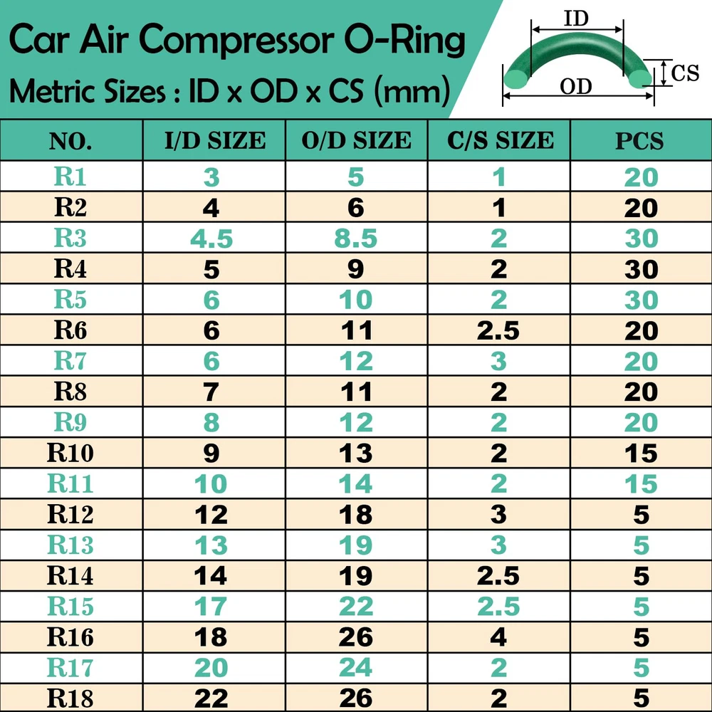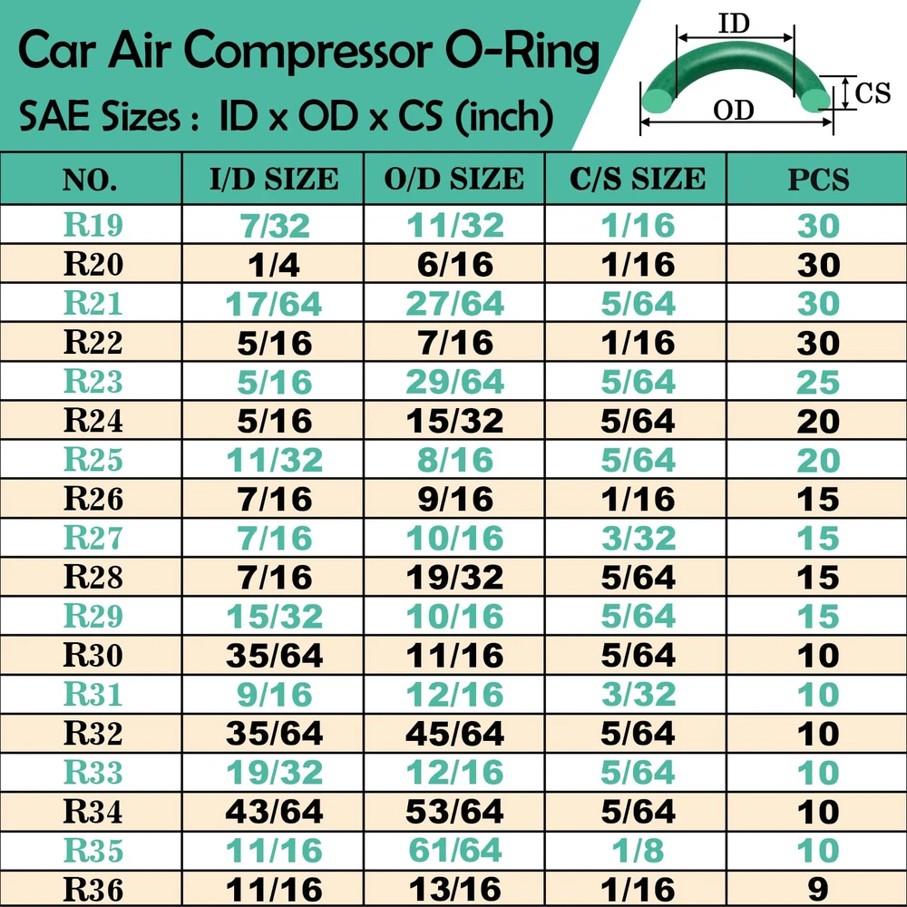 High-quality materials: air conditioner O-ring kits are made of Nitrile Rubber (NBR) 70, no corrosion, no contaminated media and no odor Advantages: good corrosion resistance, sealing, heat resistance, deformation, water resistance, abrasion resistance, especially gasoline and oil resistance, can prevent air, oil, gas and water leakage Wide application: NBR is widely used as O-ring material in the world. Widely used in a variety of water pumps, faucets, pressure washers, automotive air conditioning (A/C system), electronic appliances, workshop solenoid valves, mechanical bearings and other parts of the sealing DIY maintenance Multiple Sizes: Air Conditioner O-Ring Kits 36 different sizes of o-rings to meet almost all your different needs.The o-ring kits come in a plastic organizer box, which makes it easy to choose the size you need, very easy to use and find Air Conditioning O-Ring: Rubber O-Ring Automotive Air Conditioning Compressor Seal Repair Kit Quality Service: always provides quality , so you can buy with confidence. If you have any questions about Air Conditioner O-Ring Assortment Kit, please let us know and we will be happy to serve you