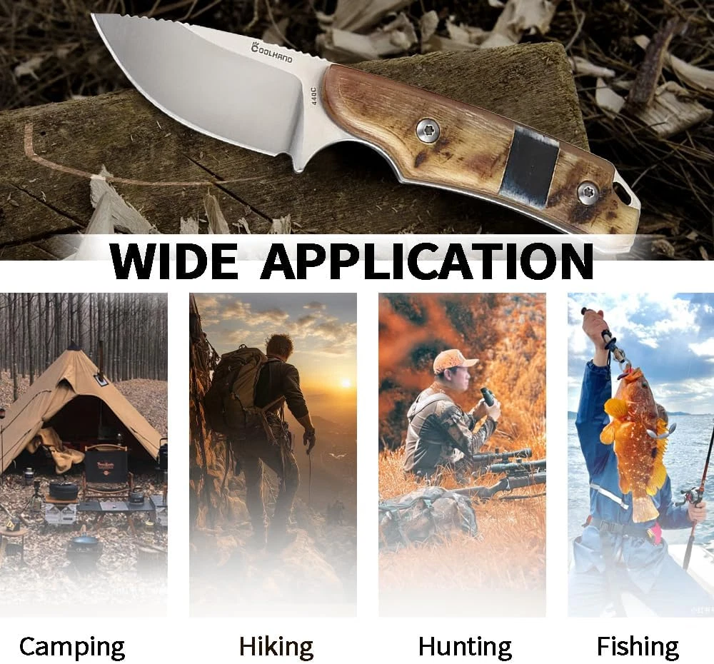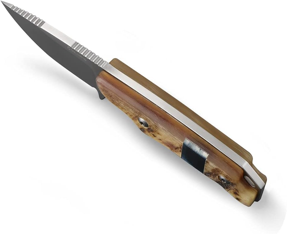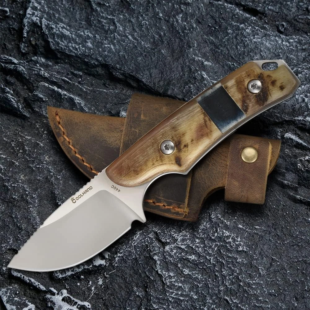 1.HUNTING SURVIVAL KNIFE: Simplicity and style meets unmatched function, no matter the application; An excellent hunting knife capable of countless tasks in the field. 2.440C STEEL FULL TANG: For first-rate edge retention and corrosion resistance; Drop-point with wide blade radius makes breaking down game a breeze. 3.NATURAL RAM HORN HANDLE: It's made from a cavel, Inlaid with black bone, each pair of handles is unique. 4.SUPERIOR TACTICAL USE: The full-tang, fixed blade construction provides enhanced stability when in use; Leather belt loop sheath for easy access; Lanyard hole for versatile carry options. 5.EVERYDAY CARRY: The perfect addition to your EDC collection, backpack, survival kit, tackle box, and more. Product Description HUNTING SURVIVAL KNIFE 440C STEEL FULL TANG Simplicity and style meets unmatched function, no matter the application NATURAL HANDLE Buffalo Horn Handle High Polished Wood Handle Ram Horn Handle Green Preal Handle LEATHER BELT LOOP SHEATH Unique crazy horse holster SUPERIOR TACTICAL USE EVERYDAY CARRY Description A full tang compact survival hunting knife, excellent hunting knife capable of countless tasks in the field. Leather belt loop sheath for easy access; Lanyard hole for versatile carry options. Each pair of handles is unique. The perfect addition to your EDC collection, backpack, survival kit, tackle box, and more. Mechanism : Fixed Action : Fixed Blade Blade Steel : 440C Steel Blade Length : 2.67" (6.78cm) Blade Thickness : 0.157" (4mm) Length : 5.98" (15.2cm) Length with Leather sheath : 6.69" (17cm) Handle Thickness : 0.58" (14.73mm) NOTE: Based on feedback from our customers, we have improved the tightness of the leather belt loop sheath. The product now has a very tight belt. It does not cause the knife blade to be exposed. The knife also maintains its balance when strapped to the belt.