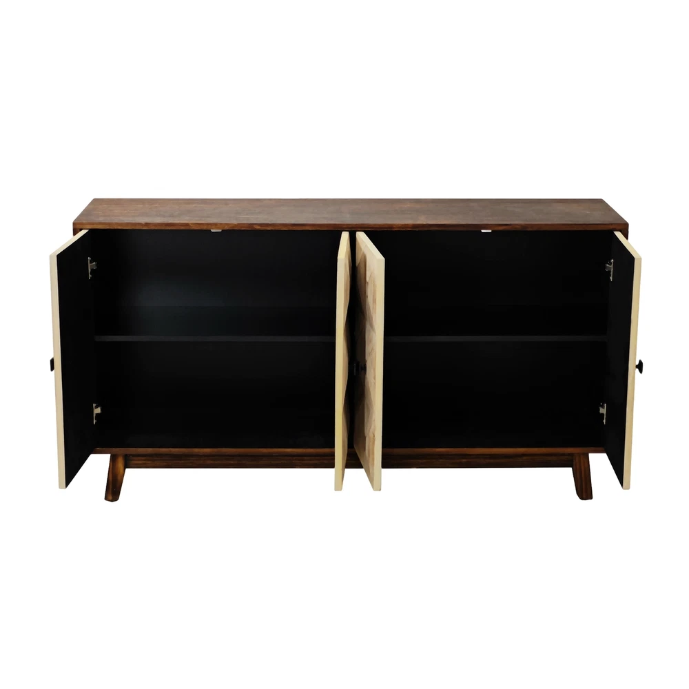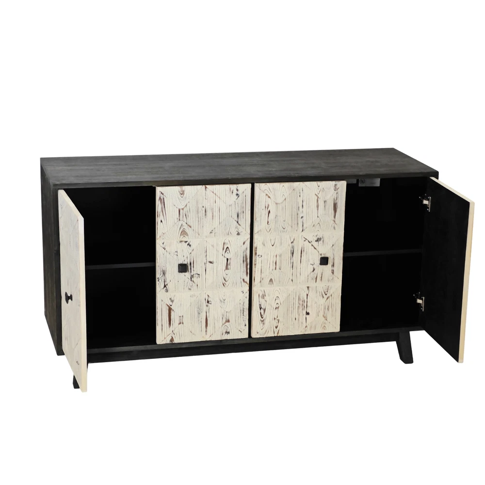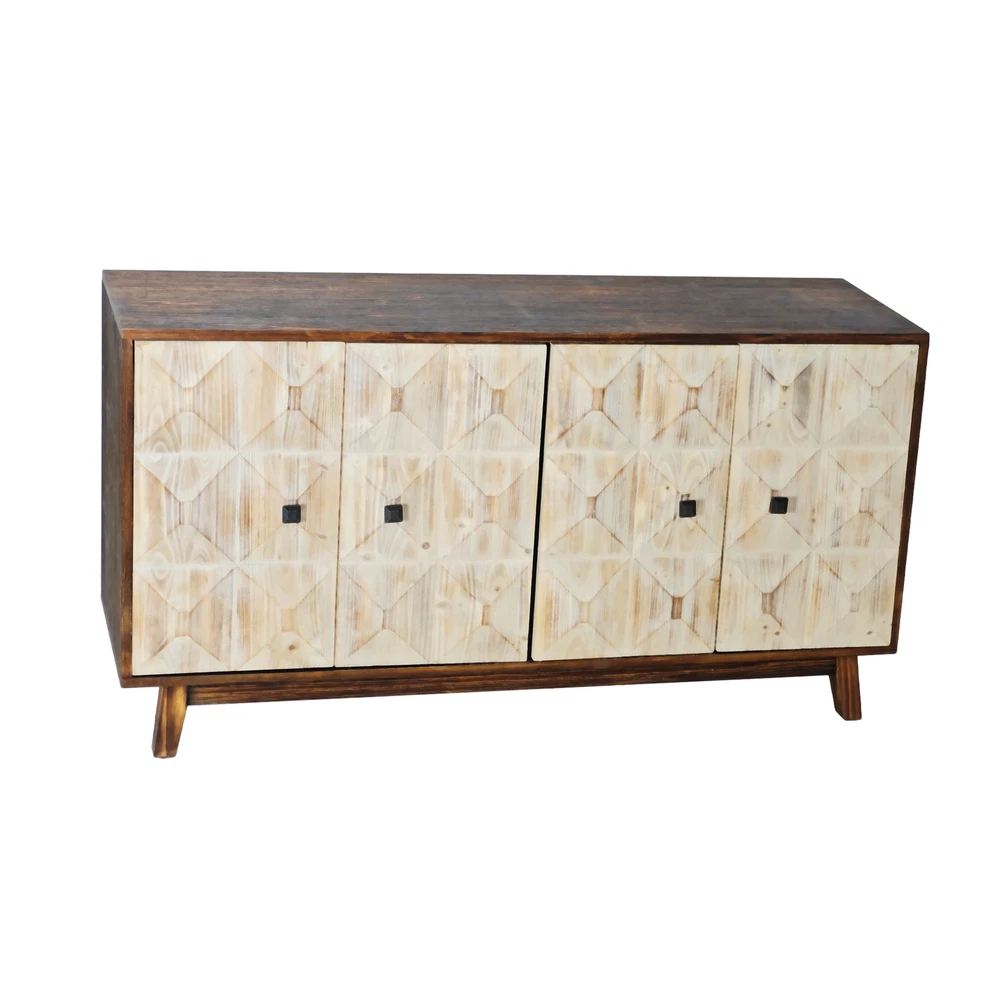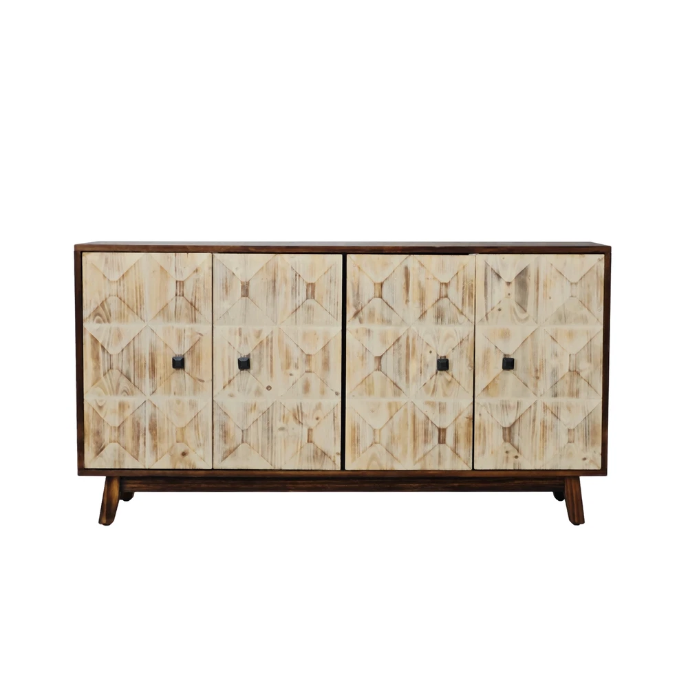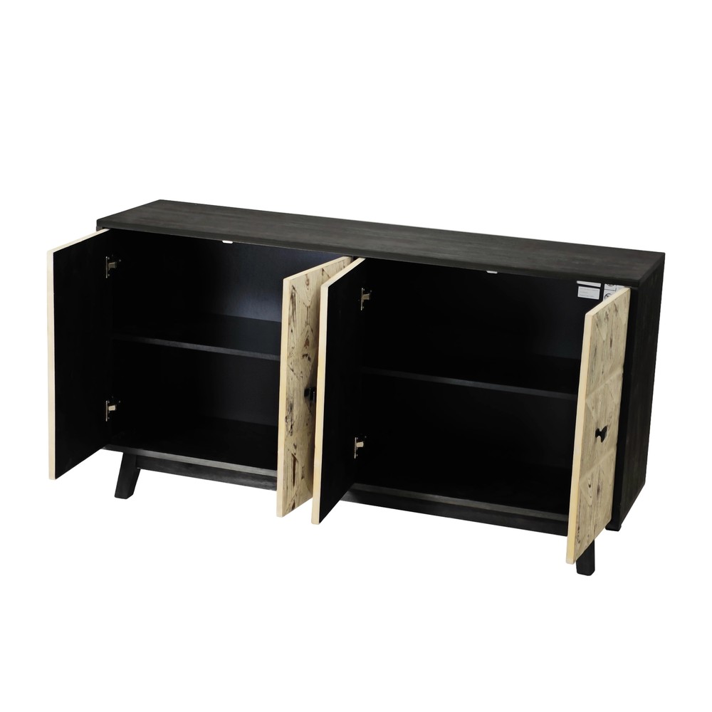 Product Features Retro and fashionable design: The cabinet door is adorned with raised three-dimensional relief patterns and metal handles, paired with pine legs to create a clean three-dimensional aesthetic, providing a texture and timeless appearance. The fire washed antique finish on the cabinet adds a sense of simplicity, complementing various styles. Whether placed in the kitchen, entryway, or living room, this vintage style cabinet can inject warmth and warmth into your home. Durable Structure: This cabinet is made of a combination of elm, fir, density board, and solid wood support legs, providing higher stability and durability. The top plate of the cabinet is made of elm wood, which can bear a weight of 220 pounds, and the layer board is made of MDF board, which can bear a weight of 121 pounds. Adequate Storage Space: This dining cabinet comes with two large-sized cabinets, which can meet all your storage needs. Easily organize kitchen appliances, tableware, glassware, etc. The built-in shelves can be customized to accommodate items of various sizes, providing flexibility and convenience. Easy to assemble : Although this retro sideboard is full of fashion, it is easy to assemble. This product includes detailed instructions to guide you through each step of the assembly process. With clear instructions, you can quickly install the cabinets and easily enhance your living space. Description Feature: This 59.84-inch long 4-door buffet cabinet combines vintage elegance with fashionable design, adding a touch of brightness to your home. This dining cabinet features a beautiful three-dimensional relief finish and stylish metal handles, adding a touch of delicacy to any living room or corridor. This sideboard buffet cabinet is not limited to living rooms or corridors, but can also be used as a kitchen buffet cabinet or entrance aisle cabinet. Its versatility makes it a magical piece of furniture that can fit any room in the home. Specifications: Color Black/Natural Material Panel:elm Door plank:Fir+MDF Table legs:Pine Handle:Metal Product Dimension 59.84"L x 15.75"W x 32.09"H Weight Capacity Tabletop: 220lbs, Central Shelf: 121lbs Assembly Required Yes Package Number 1 Notice 1. Due to lighting or display, the actual product color may differ slightly from the image. 2. Manual measurement was used, and there may be some reasonable errors.