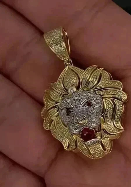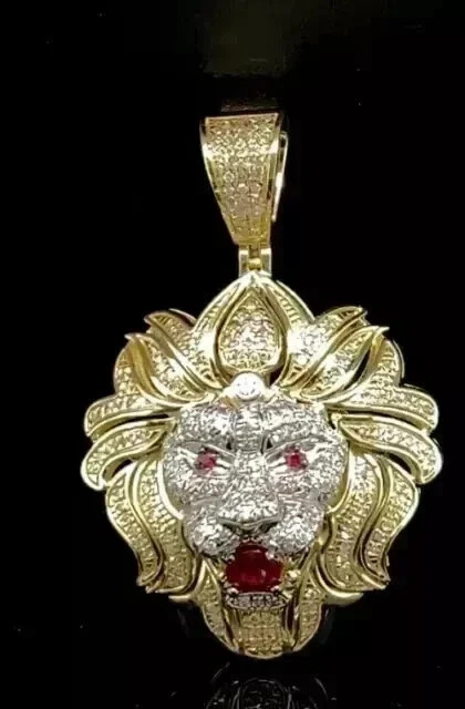5Ct Round Cut Lab Created Ruby Men's Lion Pendant 14k Yellow Gold Finish