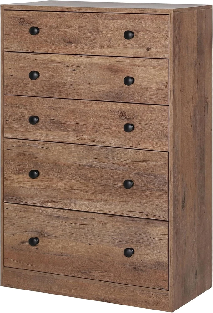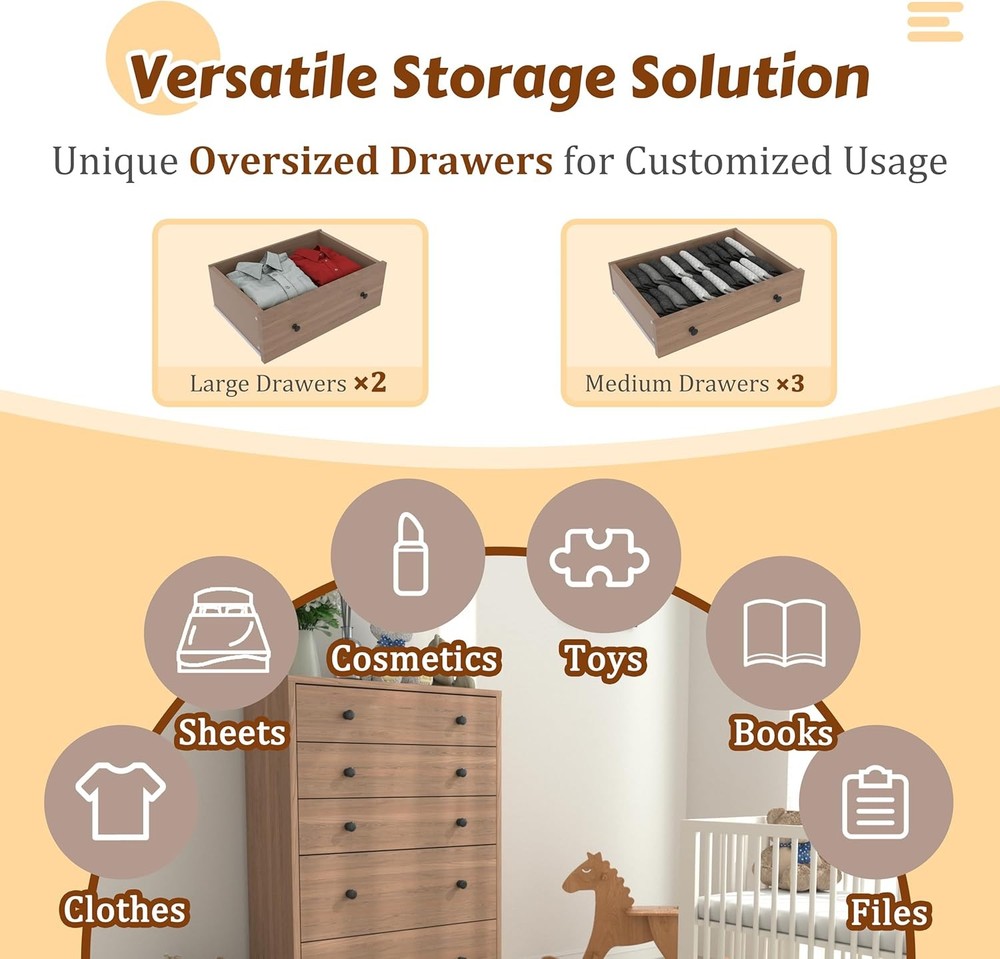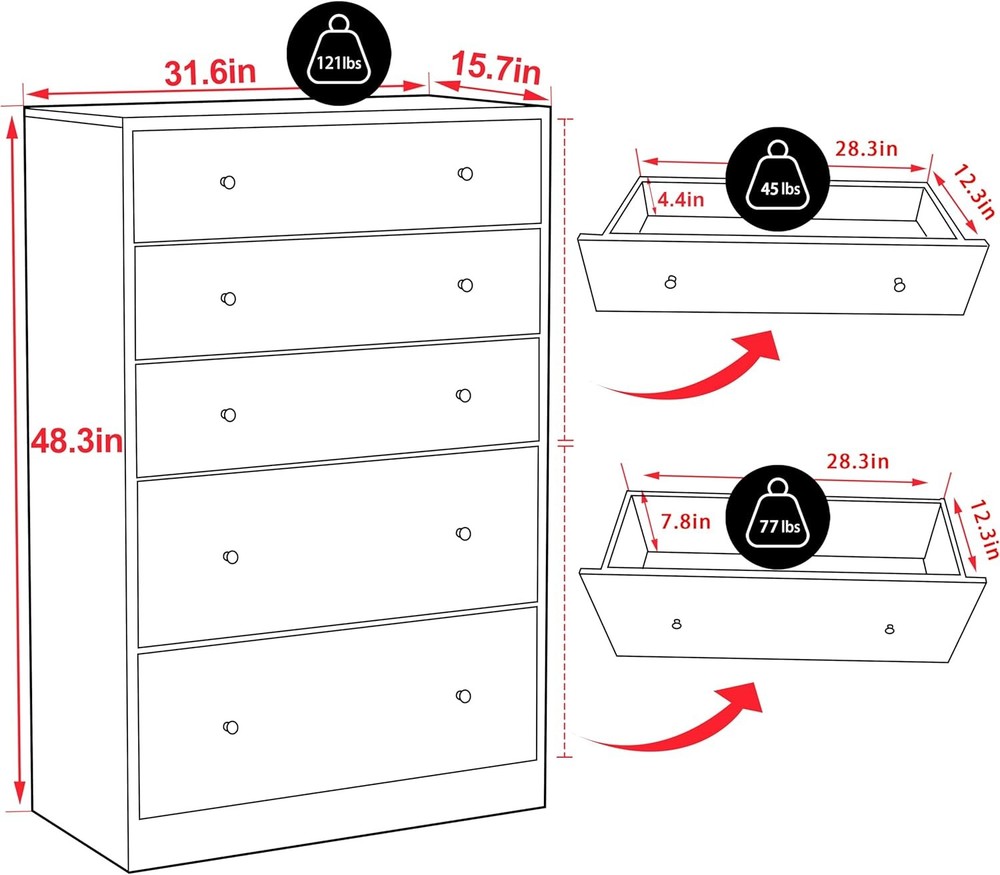 Product Description This 5 drawer dresser is designed to be oversized with larger and deeper drawers to store small and large personal items such as clothes, socks, accessories, bed sheets, books and more. This oversized dresser is the perfect solution to your daily storage needs for the limited space, which can make your living room or bedroom organized for its spacious room with five drawers! Different from other bedroom dressers, we upgraded the bottom two drawers of the 5 drawer dresser chest to larger size than the three drawers above, which is convenient for you to customize storage according to your clothing size and storage needs. The knobs for the tall dresser chest is made of metal knobs in traditional style at the same time easy to change if wish, meaning you can DIY to replace the handles. Made of non-toxic eco-friendly engineered wood without chemical smell, this bedroom chest of drawers in unique imitation wood grain oak finish with traditional leg making it suitable for anywhere and any function, such as clothing organizer for bedroom, storage cabinet for living room, display shelf for entryway and more. We have the anti-toppling kit included to secure this bedroom chest of drawers at back to the wall for safety concern. The side mounted drawer slides made of metal with a wheel on the end that glides smoothly through the rails. About this item ANTI-TOPPLING DESIGN-We have the anti-toppling kit included to secure this bedroom chest of drawers at back to the wall for safety concern. The reinforced structure with flat spacious surface tabletop would definitely provide you a safer using experience for better weight capacity to place a small TV, photo frames, small plants or decorations on it. MULTI-FUNCTIONAL DRESSER-Made of non-toxic eco-friendly engineered wood without chemical smell, this bedroom chest of drawers in unique imitation wood grain oak finish with traditional leg making it suitable for anywhere and any function for bedroom, storage cabinet for living room, display shelf for entryway and more. UPGRADER DETAILS FOR DRESSER-Different from other bedroom dressers, we upgraded the bottom two drawers of the 5 drawer dresser chest to larger size than the three drawers above, which is convenient for you to customize storage according to your clothing size and storage needs. Meaning you can DIY to replace the handles. OVERSIZED DRESSER FOR BEDROOM-This 5 drawer dresser is designed to be oversized with larger and deeper drawers to store small and large personal items such as clothes, socks, accessories, bed sheets, books and more. This oversized dresser which can make your living room or bedroom organized for its spacious room with five drawers! DIMENSIONS-The overall size of 5 drawer dresser: 31.5'' W x 15.7'' D x 48.2'' H. The size of table top: 31.5'' W x 15.7'' D. The size of upper three small drawers: 28.3'' W x 12.3'' D x 4.4'' H. The size of bottom two lager drawers: 28.3'' W x 12.3'' D x 7.8'' H. The weight capacity of table top: 150lbs. The weight capacity of drawers: 45lbs/77lbs. On Aug 7, 2025 at 01:57:44 PDT, seller added the following information: