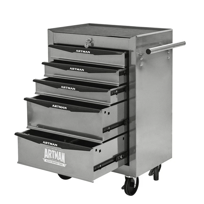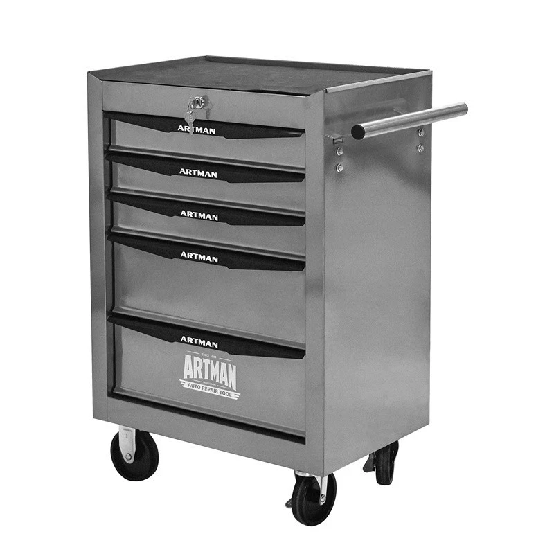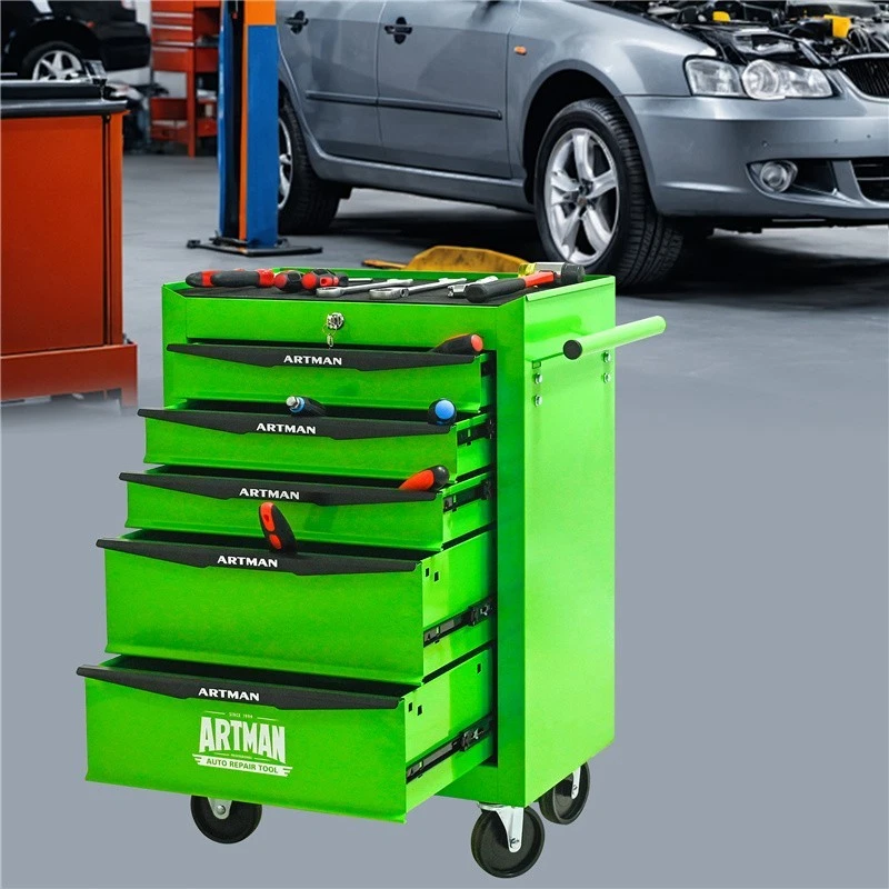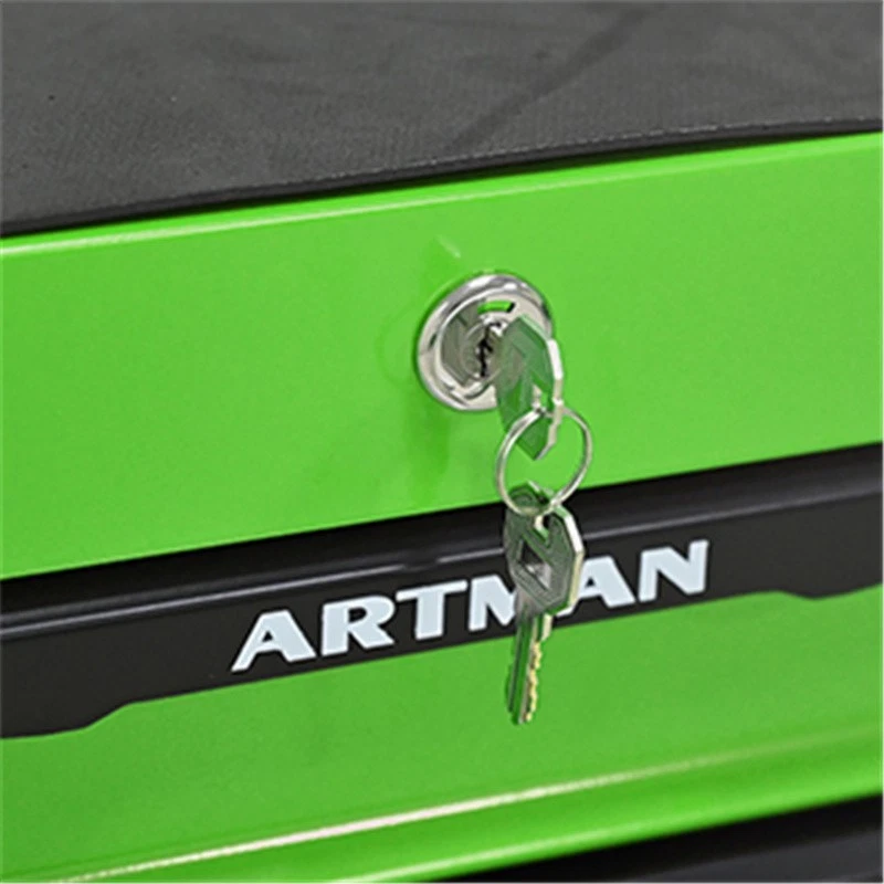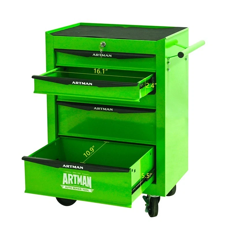 Features & Details: 5 Drawers mutifunctional tool cart with wheels. This assembly trolley has 4 steering wheels, 2 of which with parking brakes, so you can move the trolley freely in the garage, but also stop in one place. The tool box is also lockable and can be used as a removable, attachable and mobile case The opening and closing of the drawers of the tool cabinet is very gentle thanks to the ball-bearing drawers The robust and powder-coated steel construction is used for high wear resistance. This assembly trolley has 4 steering wheels, 2 of which with parking brakes, so you can move the trolley freely in the garage, but also stop in one place Specification: Material: Cold Rolled Steel Color: Green / Silver Surface Finish : Powder Coating Casters: 4" Casters (2PCS with brake and 2PCS without brake) Product Size (with wheels ): 20.63*12.99*30.59INCH Product Size: 20.63*12.99*25.83INCH Net Weight: 48.72LBS