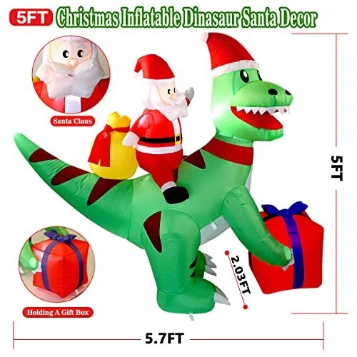 30 Days Return Policy Fast Delivery Trusted seller 5FT Christmas Inflatables Decorations Dinosaur Santa Claus, Indoor Outdoor Christmas Deco, Blow Up Dinosaur Santa Decoration with Built-in LED Lights Gift Bag for Christmas Party,Garden,Yard, Lawn Product Description 5FT INFLATABLE Christmas Decorations: Christmas dinosaur inflatable decorations designed a Santa Clause riding the dinosaur bring more funny, carrying a gift bag gift box to your home, bring luck, lots of happiness, and good health. Merry Christmas and Happy New Year to you and your family! Build-in LED Lights: This Inflatables Christmas outdoor decorations come with bright led lights , light up your lawn or garden in the evening, bring a best festive mood, attract and spreading a happiness atmosp to your neighbors and guests. STABLE & DURABLE: Our Christmas blow-up yard decorations are made of waterproof polyester, ensuring durability and reusability. The dinosaur base allows for stable indoor use without sandbags or stakes. Includes 4 ground stakes and 2 ropes for secure outdoor setup. Super Easy To Inflate and Store: This Christmas inflatable deco built-in powerful blower, close the bottom zipper and plug in UL plug and a glowing gift-giving dinosaur appears in a few seconds! Opening the bottom zipper to deflate it, then you can store it for the next use. BEST CHRISTMAS GIFT: Inflatable Christmas Dinosaur Santa is ideal for kids and dinosaur fans. Great for indoor, outdoor, yard, patio, and garden decor. Creates a festive atmosp for the holidays. Includes a 12-month warranty; contact us with any issues. Shipping Returns Payment Shipping Shipping is FREE to all addresses other than APO/PO boxes in the lower 48 states. All our stock ships from US-based warehouses. Shipped via USPS or UPS (depending on location and package weight) Unless stated otherwise, all orders will ship within 24-72 hours of your payment being processed. Check our feedback to see the great reviews of FAST shipping we offer. Returns As our valued customer, we will do our best to make sure the product you receive arrives to you on time and as expected. If you are not satisfied with your purchase, please contact us within 30 days of receiving your order to process a return. Payment We currently accept payment via eBay managed payments only. Once payment is cleared, we will dispatch your shipment within 1-3 business days. Please refer to the "Shipping" tab for more information regarding shipping speed to your destination.