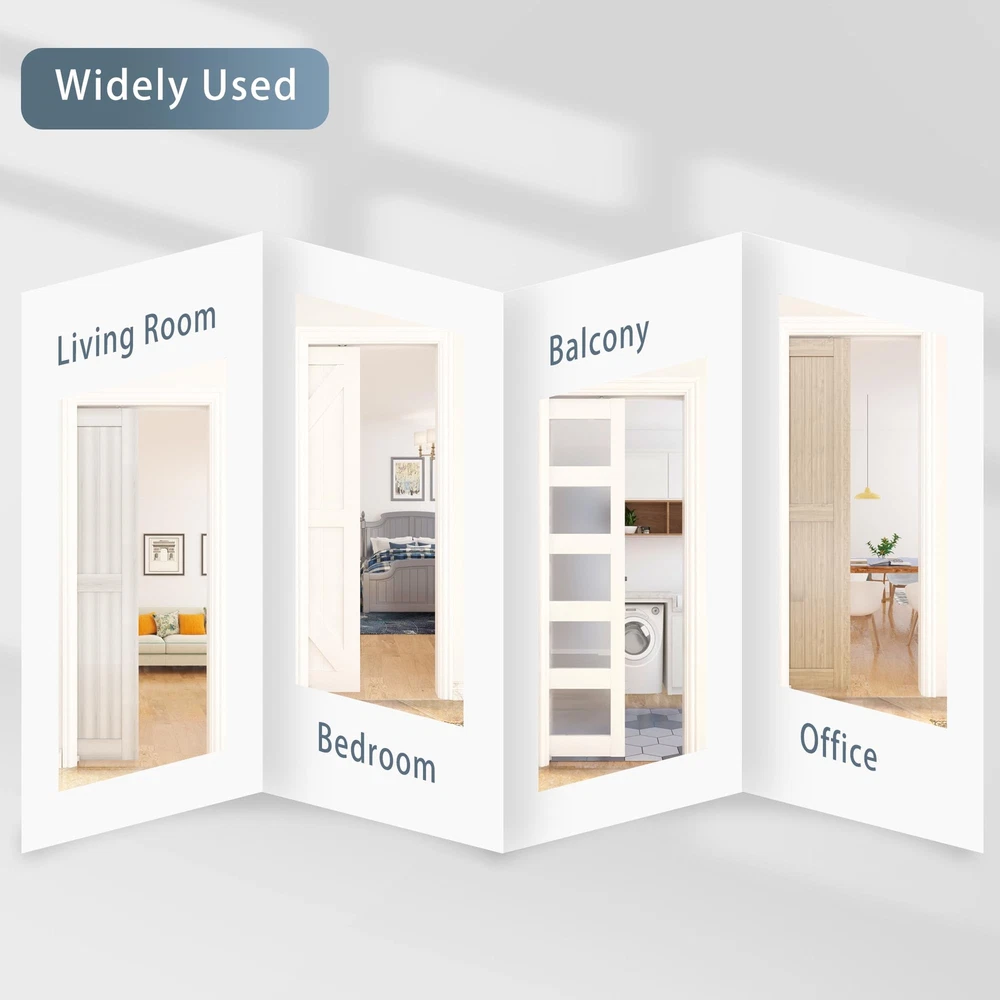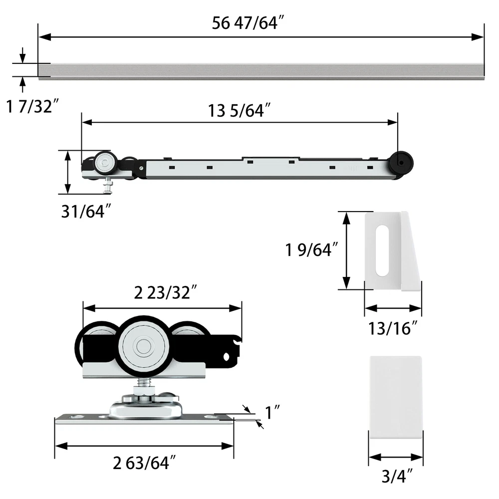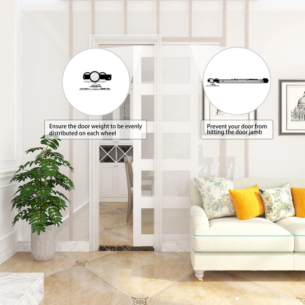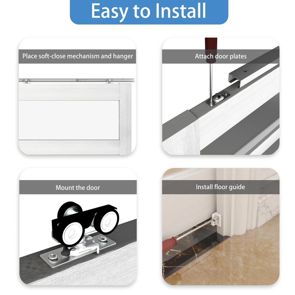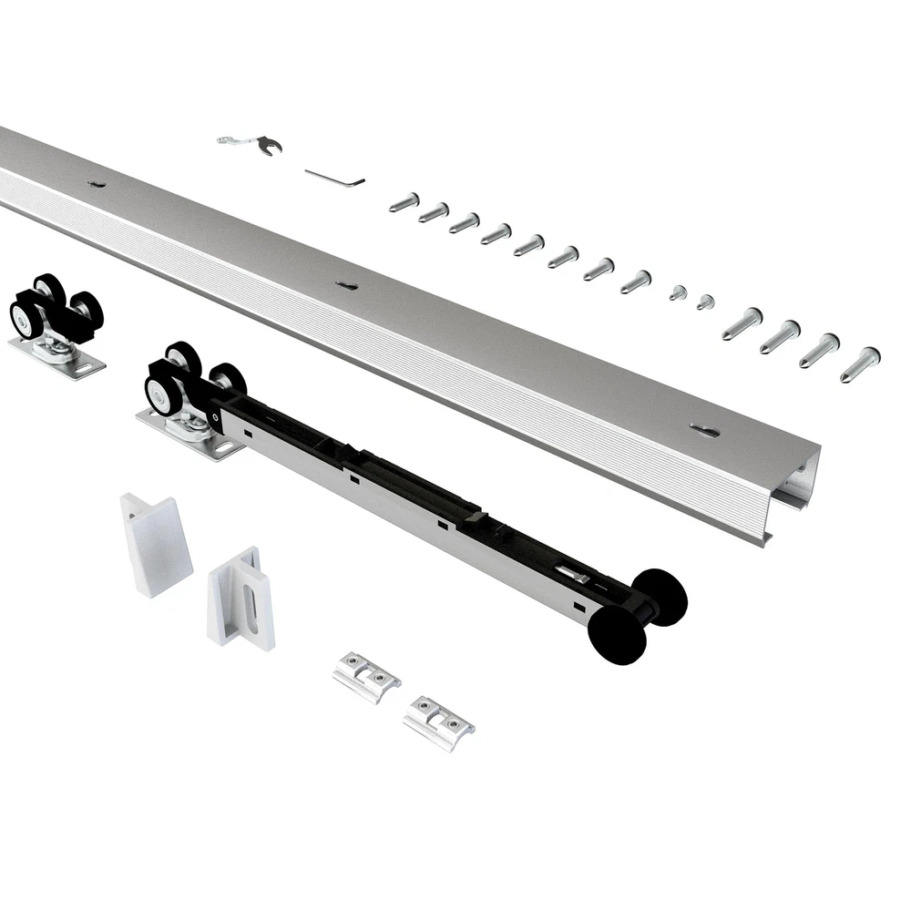 Excellent Structure: Commercial grade precision extruded aluminum box track ensures door will not jump from track, convex rails on track allow flexible and free rolling. Pocket door track is made of high-quality aluminum, which is corrosion-resistant, rust-proof. Smoothly and Soft Close: Three-wheel hangers guarantee the weight of the door to be evenly distributed on each wheel, with heavy-duty ball-bearing offer minimum friction and quiet rolling. With two-way soft-close mechanism, ensures quiet and safe operation by dampening door opening/closing action. Max capacity 120lbs. Dimension: Suitable for door panel thickness 1" to 1-3/4"; door panel width 24"-30". Max Door Weight up to 120lbs per panel. Easy to Install and Widely Applicable: The box rail structure is not complex. Quick release locking tab allows easy door installation/removal without dropping track. We also provide detailed professional installations. This track set is suitable for various scenes, such as bedroom, study, storage room, balcony, gym, office, etc. The pocket door track can meet most of your needs. Package Includes: 1x aluminum track, 1x double sided soft close mechanism, 1x hanger with mounting plate, 1x floor guide, 2x soft close actuators, and wrenchs & instructions & mounting screws. Great Value Option:100000 cycles test passed and guarantee the pocket door track can be used for 10 years! We are reliable and qualified manufacture. Professional engineer team is dedicated to the pocket door hardware. Professional customer service team help you solve all problems in time.