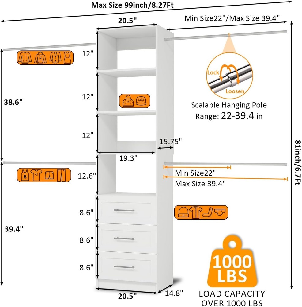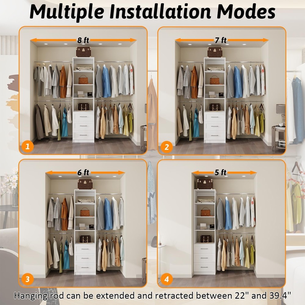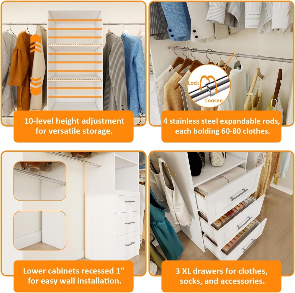 Product Description Elevate the Luxury of Your Daily Life-Closet Organizer System. 5FT-8FT - 99" Closet System, Dimension:99” L*14.8”W *81”H(when rods fully expanded). 4 Stainless Steel Hanging Rods - Super sturdy( Expandable Rods can be adjusted from 22" to 39.4"). 4 Shelves, 3 wooden drawers, ultimate the storage. For Children and Adults both. Decorate your Nursery Room Height adjustable up and down 4*Shelves, 2 of them are height adjustable. 2pcs of the adjustable shelves are with 10 positions adjustable to fits all of your needs. Decoration, Folded Clothes, Handbags, Books, Storage Box, Jewelries can all be hold on shelves. Expandable Rods in Stainless Steel Expandable Rods - Size can be adjusted from 22" to 39.4" to fit many of the Cloak Room. Customizable and DIY Easily with the expandable Rods. Stainless Steel Rods - Super Sturdy, no bend. Cuttable Shelving Tower- DIY. Thoughtful Design, Ultimate the Storage. Switch to skirting design. This closet system features an installed-in-front-of-baseboard design, allowing it to fit seamlessly in homes with baseboards. If your space lacks baseboards, it remains fully functional, ensuring versatile usability. Three extra large storage drawers- Wooden Drawer. 3 Large & Deep Drawers Made By Engineered Wood, not the Fabric kind. For underwear, stockings, folding clothes, privacy items. Drawer Dimension: 20.5"L*14.8"W*7.7"H. Elevate the Luxury of Your Daily Life. Expand your storage: Whether it is long dress, T shirts, Coats, Bags, Hats, Undergarment, Socks, Shoes, Suitcase. All can find its space. Everything organized and easy reachable. Add luxury style to your closet. Everything Tidy and Well Organized. Previous page Next page Suitable for all styles of decoration 6 Installation Ways - Fits all Your Need. 6 Installation Ways fits for 5ft -8ft Closet Room. You can install one side to become side closet. Shorten the expandable rods and cut shelving tower for small room. Solid as a beast - Stainless Steel Rods Previous page Next page No worry about hanging Rod getting Bent Any more. For Hanging Rods - Upgraded Stainless Steel, 0.6mm thick, more sturdy and safe. Heavy duty to hold 60-80pcs for each of our hanging rod. On Aug 6, 2025 at 21:23:26 PDT, seller added the following information: