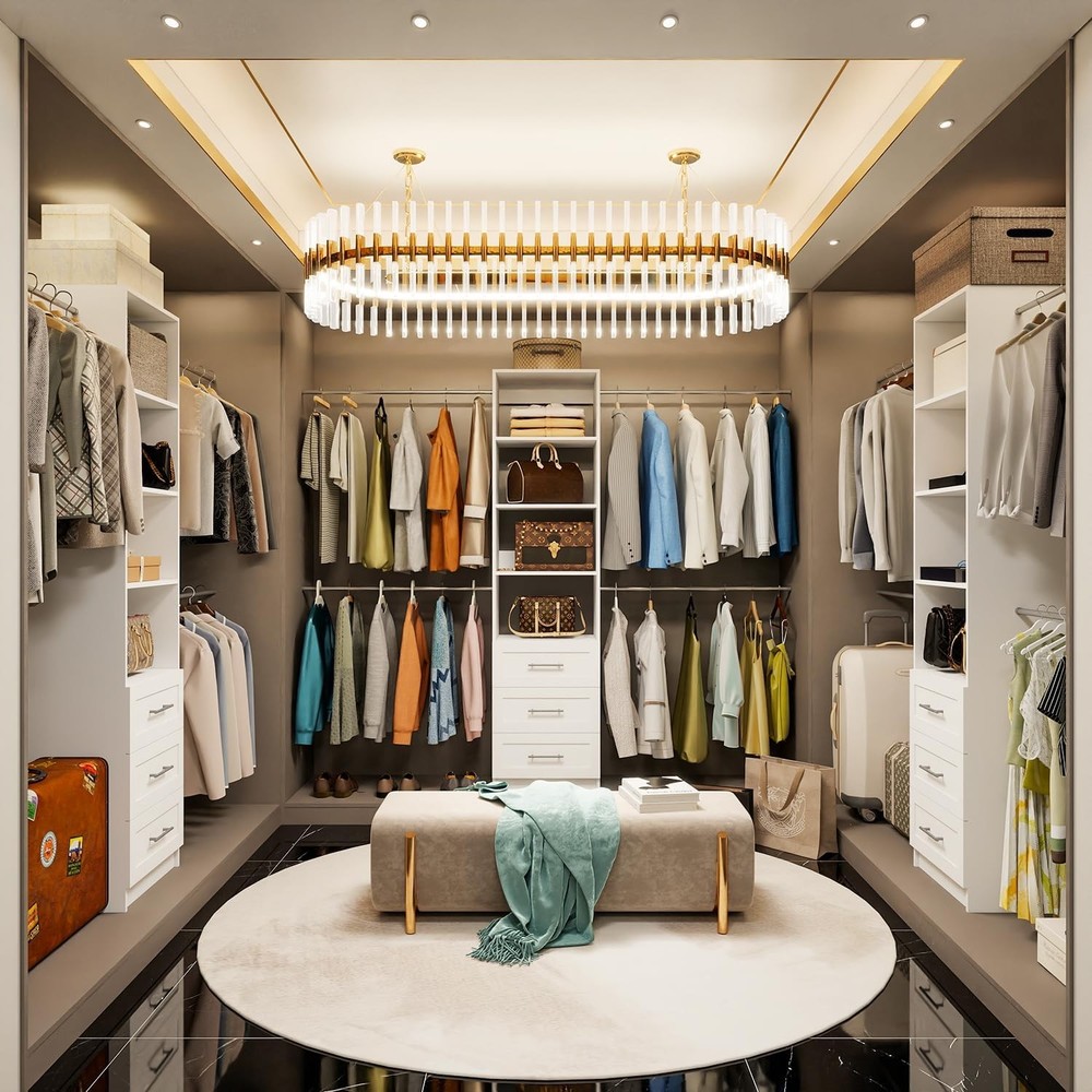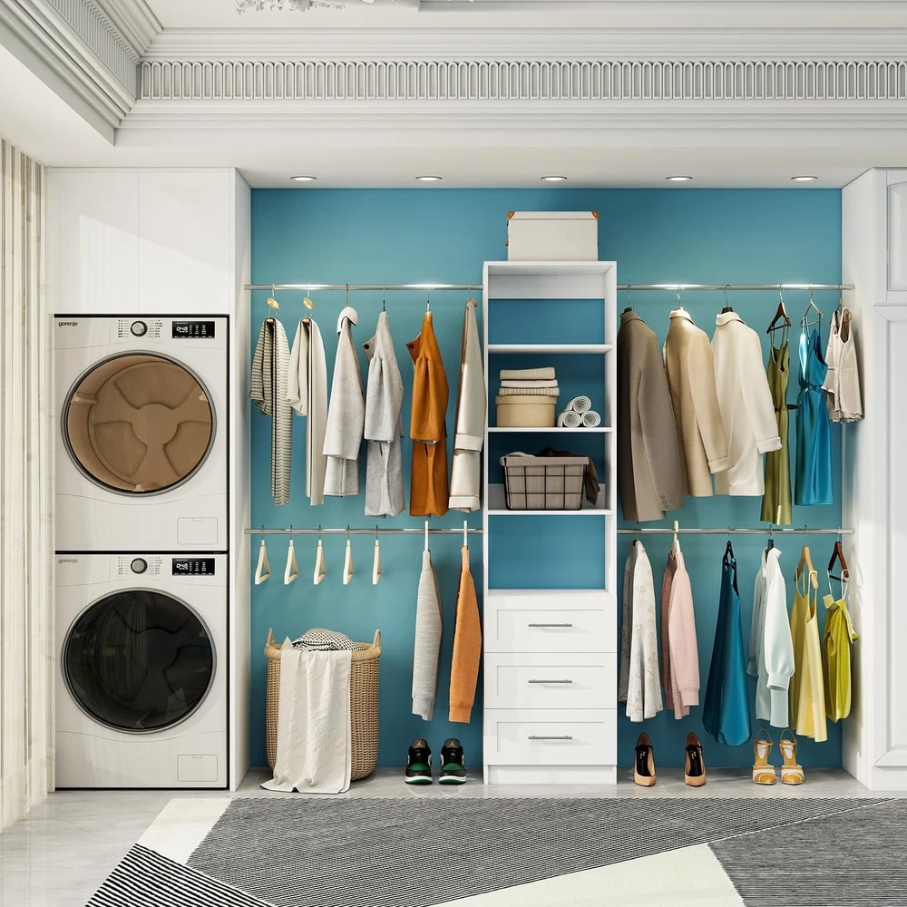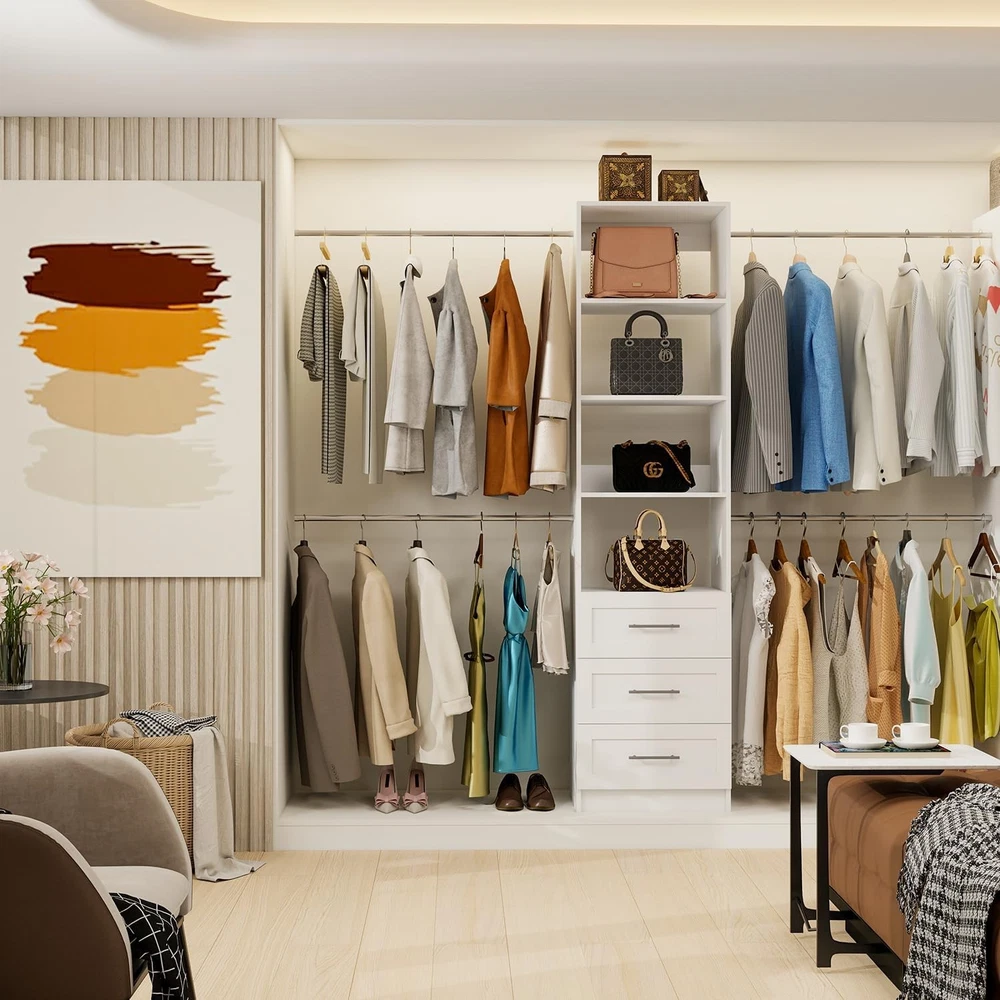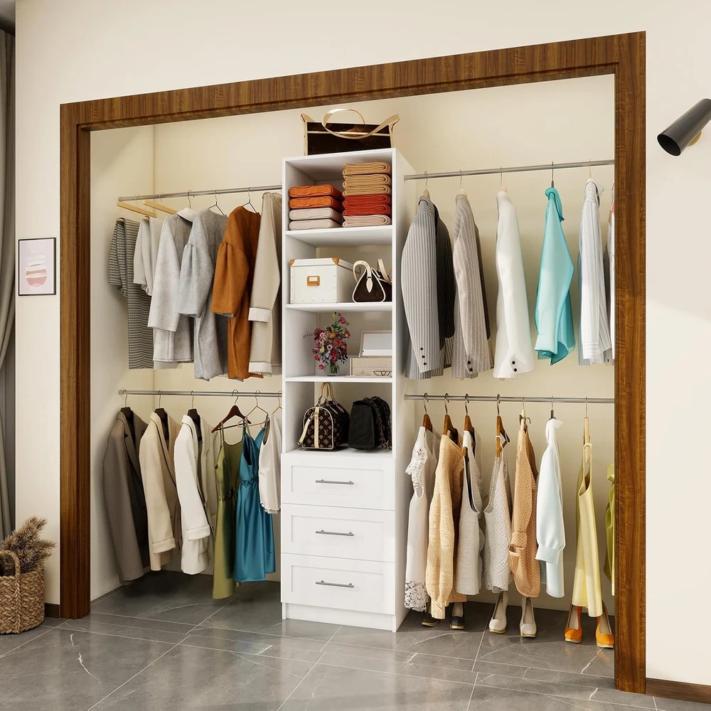 Product Description Elevate the Luxury of Your Daily Life-Closet Organizer System. 5FT-8FT - 99" Closet System, Dimension:99” L*14.8”W *81”H(when rods fully expanded). 4 Stainless Steel Hanging Rods - Super sturdy( Expandable Rods can be adjusted from 22" to 39.4"). 4 Shelves, 3 wooden drawers, ultimate the storage. For Children and Adults both. Decorate your Nursery Room Height adjustable up and down 4*Shelves, 2 of them are height adjustable. 2pcs of the adjustable shelves are with 10 positions adjustable to fits all of your needs. Decoration, Folded Clothes, Handbags, Books, Storage Box, Jewelries can all be hold on shelves. Expandable Rods in Stainless Steel Expandable Rods - Size can be adjusted from 22" to 39.4" to fit many of the Cloak Room. Customizable and DIY Easily with the expandable Rods. Stainless Steel Rods - Super Sturdy, no bend. Cuttable Shelving Tower- DIY. Thoughtful Design, Ultimate the Storage. Switch to skirting design. This closet system features an installed-in-front-of-baseboard design, allowing it to fit seamlessly in homes with baseboards. If your space lacks baseboards, it remains fully functional, ensuring versatile usability. Three extra large storage drawers- Wooden Drawer. 3 Large & Deep Drawers Made By Engineered Wood, not the Fabric kind. For underwear, stockings, folding clothes, privacy items. Drawer Dimension: 20.5"L*14.8"W*7.7"H. Elevate the Luxury of Your Daily Life. Expand your storage: Whether it is long dress, T shirts, Coats, Bags, Hats, Undergarment, Socks, Shoes, Suitcase. All can find its space. Everything organized and easy reachable. Add luxury style to your closet. Everything Tidy and Well Organized. Previous page Next page Suitable for all styles of decoration 6 Installation Ways - Fits all Your Need. 6 Installation Ways fits for 5ft -8ft Closet Room. You can install one side to become side closet. Shorten the expandable rods and cut shelving tower for small room. Solid as a beast - Stainless Steel Rods Previous page Next page No worry about hanging Rod getting Bent Any more. For Hanging Rods - Upgraded Stainless Steel, 0.6mm thick, more sturdy and safe. Heavy duty to hold 60-80pcs for each of our hanging rod. On Aug 6, 2025 at 21:23:26 PDT, seller added the following information: