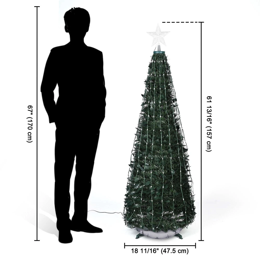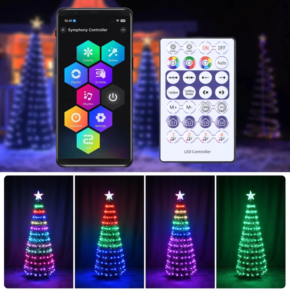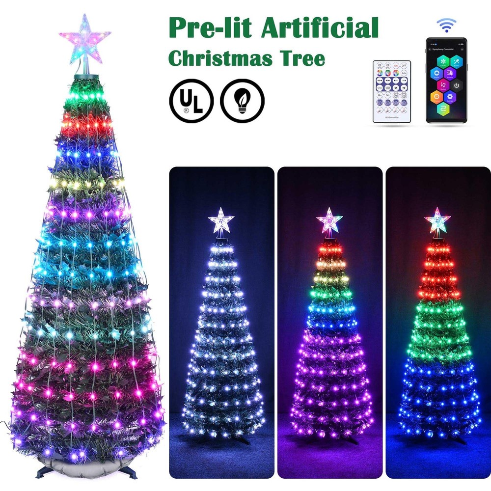 Features: - Christmas Tree Decoration - 5 ft Pre-lit Artificial Christmas Tree with lighted star finial & 205 pcs RGB fairy LED beads to create splendid & colorful lighting in a variety of patterns, designed for dual use as Christmas tree decoration at daytime & ambient lights at night - Diversified Lighting Modes - Provides 160 million colors, music modes & 25 preset dynamic lighting effects for you to choose to match your mood, greatly boosting the party ambience; DIY mode allows you to change LED bead color to create personalized pattern - Bluetooth App & Remote Control - Bluetooth connectivity allows you to pair the lights with smartphone & adjust the light setting via APP such as color selection, brightness, speeds, modes, compatible with IOS & Android system; Comes with a remote control for easily starting/stopping the light and changing light setting - Energy-Saving & Durable - Christmas tree light uses 10W of energy totally, significantly reducing energy consumption for holiday decoration; Made of PVC material, durable & wear-resistant for long-lasting use - Easy to Assemble & Storage - Easy setup in minutes without using tools, just connect 4 legs to the base, assemble the poles, install string light and fixate the star finial; Comes with leaf wire coils which can be easily folded flat and fully detachable poles for easy storage Specifications: - Overall Dimension(Dia.xH): 18 11/16" x 61 13/16" (47.5 x 157 cm) - String Light Length: 50 3/8" (128 cm) - Power Cord Length: 9 5/6 ft (3 m) - Voltage: 120 V, 60 Hz - Power: 10 W - LED Lifespan: 20,000 hrs - IP Rating: IP44 - Net Weight: 4.9 Lbs (2.2 kg) Package Contents: - 1x Christmas Tree - 1x Star Finial - 17x Light Strings - 3x Poles - 1x Base - 4x Supporting Legs - 2x Connectors - 1x Water Bag - 1x Remote Control - 1x Manual [Christmas Tree Decoration]: 5 ft Pre-lit Artificial Christmas Tree with lighted star finial & 205 pcs RGB fairy LED beads to create splendid & colorful lighting in a variety of patterns, designed for dual use as Christmas tree decoration at daytime & ambient lights at night, adding dreamy atmosphere for living rooms, offices, bars, restaurants, parties [Diversified Lighting Modes]: Provides 160 million colors, music modes & 25 preset dynamic lighting effects for you to choose to match your mood, greatly boosting the party ambience; DIY mode allows you to change LED bead color to create personalized pattern, fully unleashing your creativity [Bluetooth App & Remote Control]: Bluetooth connectivity allows you to pair the lights with smartphone & adjust the light setting via APP such as color selection, brightness, speeds, modes, compatible with IOS & Android system; Comes with a remote control for easily starting/stopping the light and changing light setting [Energy-Saving & Durable]: Christmas tree light uses 10W of energy totally, significantly reducing energy consumption for holiday decoration; Made of PVC material, durable & wear-resistant for long-lasting use [Easy to Assemble & Storage]: Easy setup in minutes without using tools, just connect 4 legs to the base, assemble the poles, install string light and fixate the star finial; Comes with leaf wire coils which can be easily folded flat & fully detachable poles for easy storage, convenient to pack away for next year use; With water bag to add weight for better stability