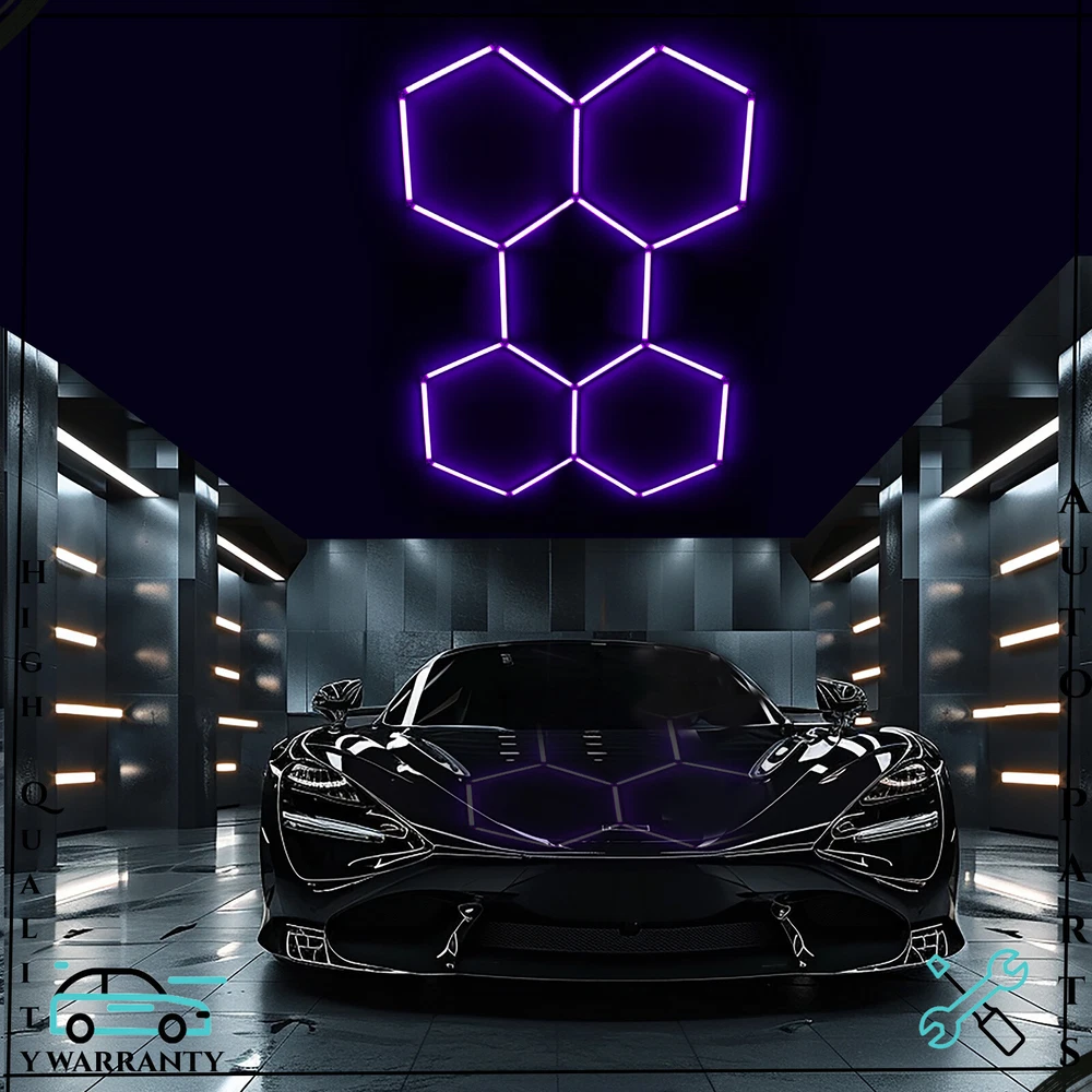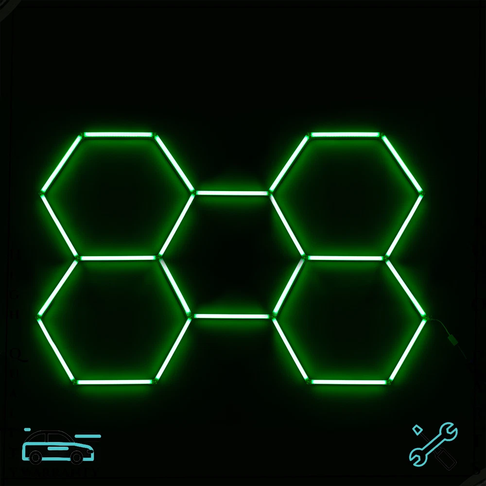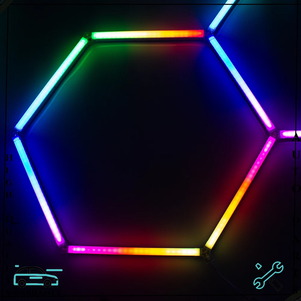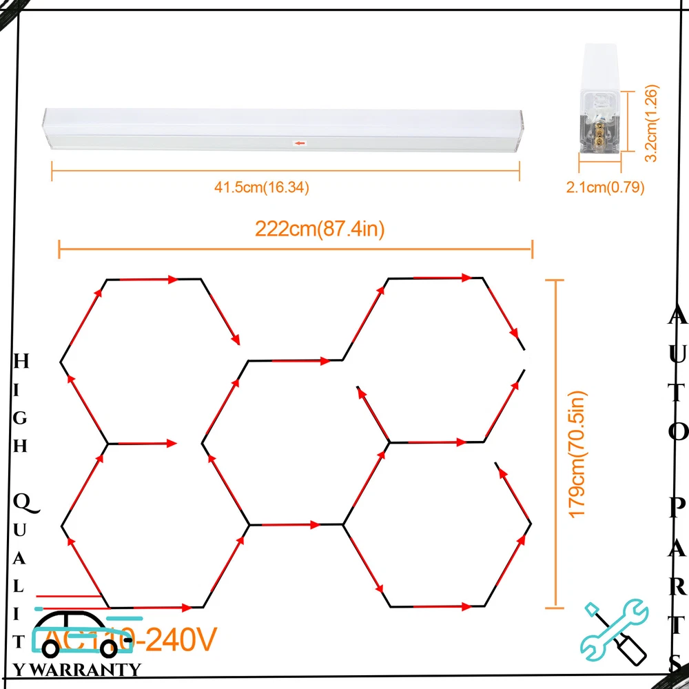 Description: LED hexagonal honeycomb light is easy to install, just insert both ends; DIY assembly method, can be assembled into various hexagons or rectangles according to your own preferences; It is usually used for lighting in garages, car washes, car repair shops, exhibition halls, shopping malls and other places to enhance the style and attract people. Industrial sense of fashion. This is a hexagon patterned garage light LED workshop lighting system can be mounted on the wall and ceiling with screws and zippers. The light spread from the pattern gives you a comfortable visual experience a pleasant viewing experience and illuminates an entire garage bay at the same time. This takes the idea of illuminating your space to a whole new level. Specification: Voltage: 110V-220V(Input) Power: 43W Lumen: 15950LM Color Temperature:6500K Material: Aluminum + PC Cover Product Size: 96.2 x 67.2 x 0.78 inches(L x W x H) Single Tube length: 460mm Warranty: 2 Years The remote is only red, green and blue. Product Included: The Power Cable: 1-end RGB Remote Controller: 1 piece 5 grids LED Hexagon Lights RGB Attention: Due to the different methods of measurement, the size has a slight error LED garage ceiling lights features: 1.The lamp tube is wider, 20mm, the light emitting surface is larger and brighter, wide range of lighting. 2. super bright: 110-120lm /w. High quality LED chips, much brighter. 3. high safety factor: built-in plug, it is difficult for fingers to touch the plug. 4. the led store lights installation is firmer than other stores and not easy to loosen. 5. DIY design, just provide us with the size and shape you want, and we will provide a design solution.