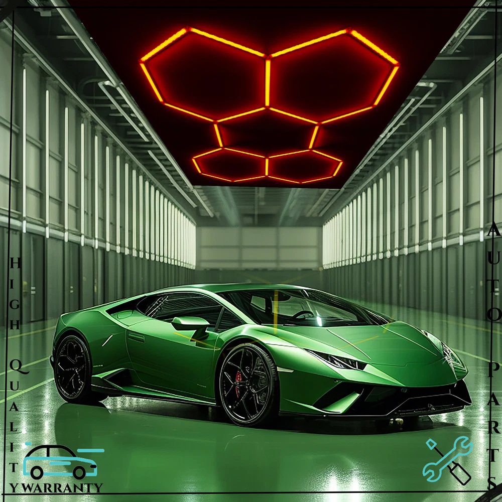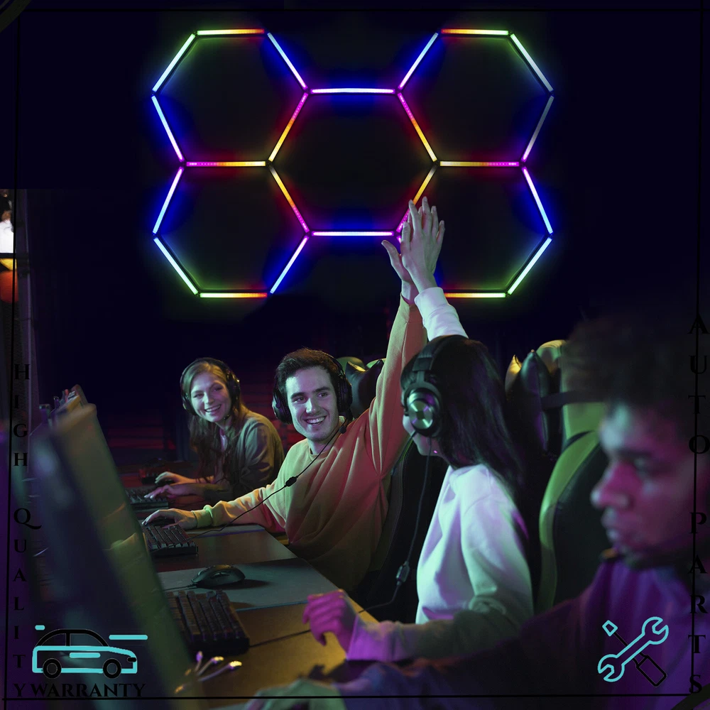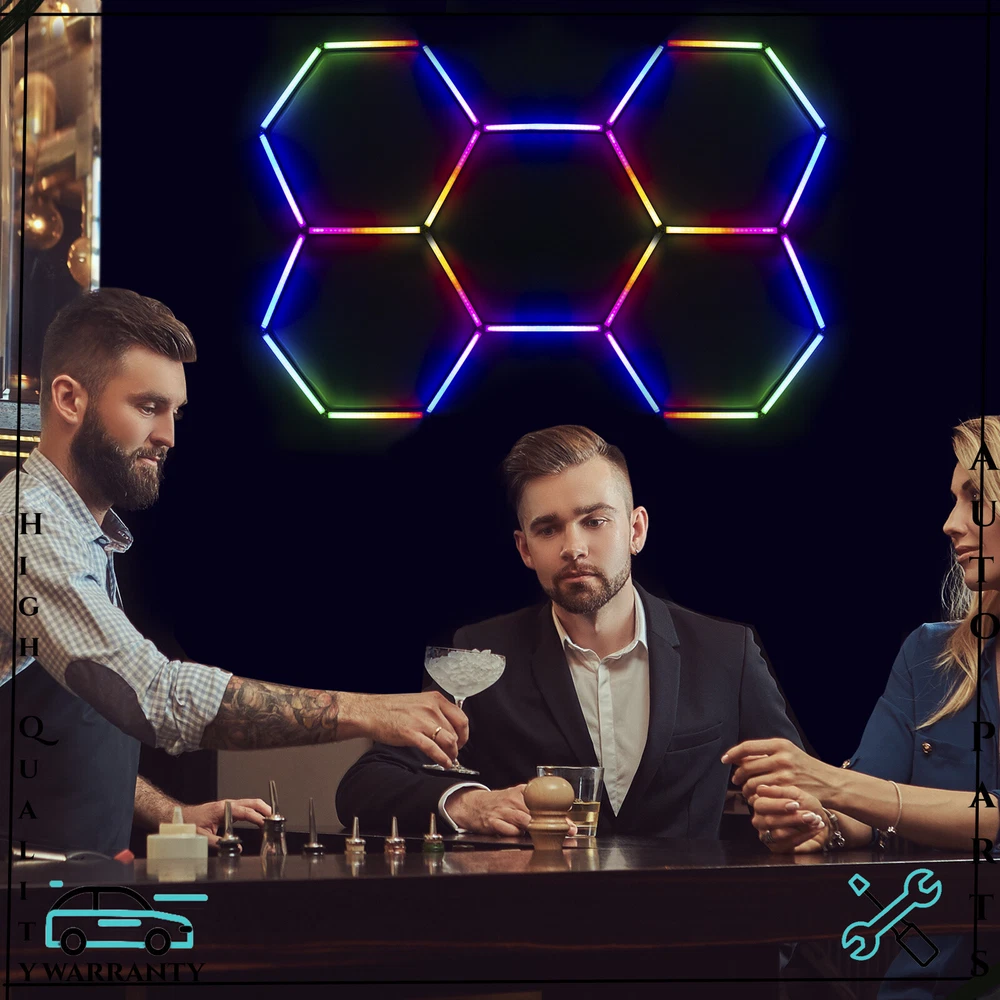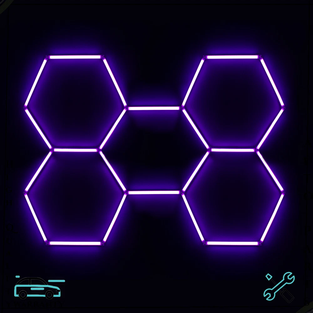 Description: LED hexagonal honeycomb light is easy to install, just insert both ends; DIY assembly method, can be assembled into various hexagons or rectangles according to your own preferences; It is usually used for lighting in garages, car washes, car repair shops, exhibition halls, shopping malls and other places to enhance the style and attract people. Industrial sense of fashion. This is a hexagon patterned garage light LED workshop lighting system can be mounted on the wall and ceiling with screws and zippers. The light spread from the pattern gives you a comfortable visual experience a pleasant viewing experience and illuminates an entire garage bay at the same time. This takes the idea of illuminating your space to a whole new level. Specification: Voltage: 110V-220V(Input) Power: 43W Lumen: 15950LM Color Temperature:6500K Material: Aluminum + PC Cover Product Size: 96.2 x 67.2 x 0.78 inches(L x W x H) Single Tube length: 460mm Warranty: 2 Years The remote is only red, green and blue. Product Included: The Power Cable: 1-end RGB Remote Controller: 1 piece 5 grids LED Hexagon Lights RGB Attention: Due to the different methods of measurement, the size has a slight error LED garage ceiling lights features: 1.The lamp tube is wider, 20mm, the light emitting surface is larger and brighter, wide range of lighting. 2. super bright: 110-120lm /w. High quality LED chips, much brighter. 3. high safety factor: built-in plug, it is difficult for fingers to touch the plug. 4. the led store lights installation is firmer than other stores and not easy to loosen. 5. DIY design, just provide us with the size and shape you want, and we will provide a design solution.