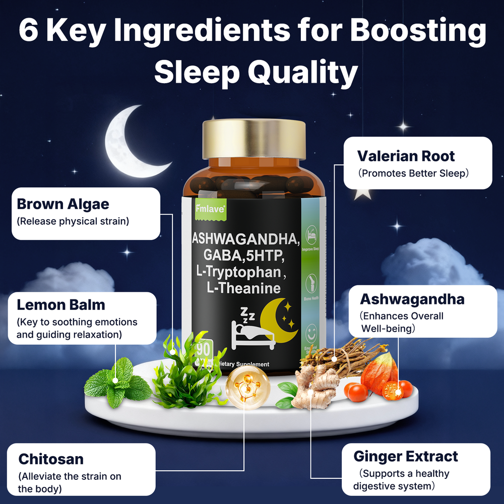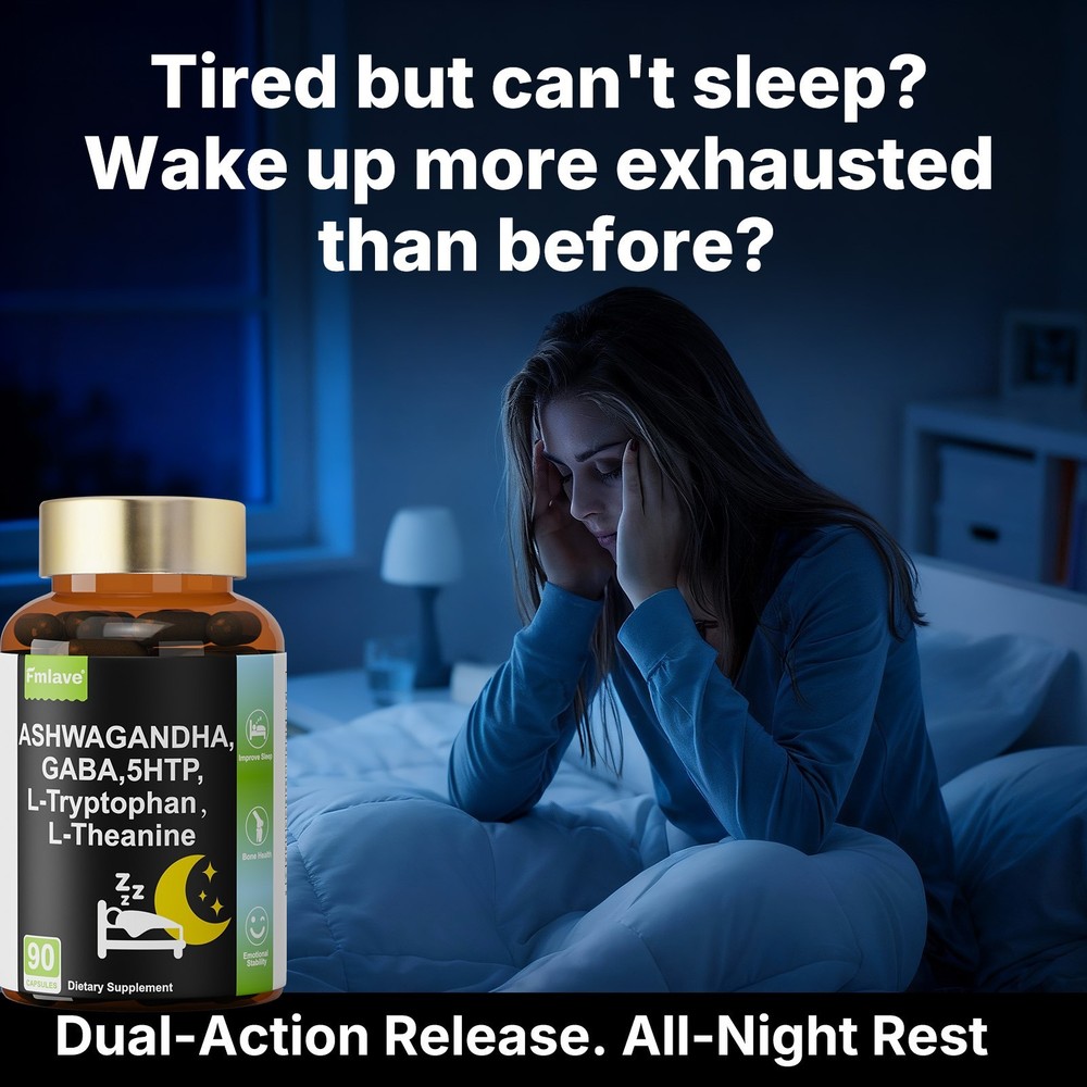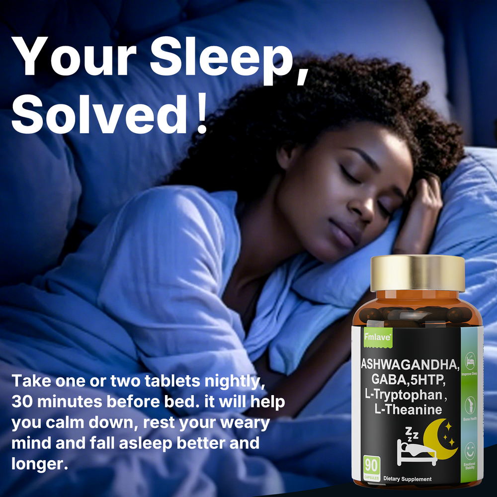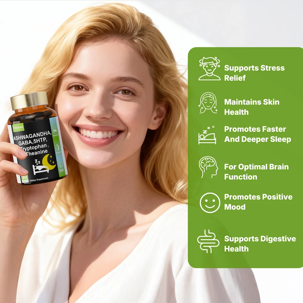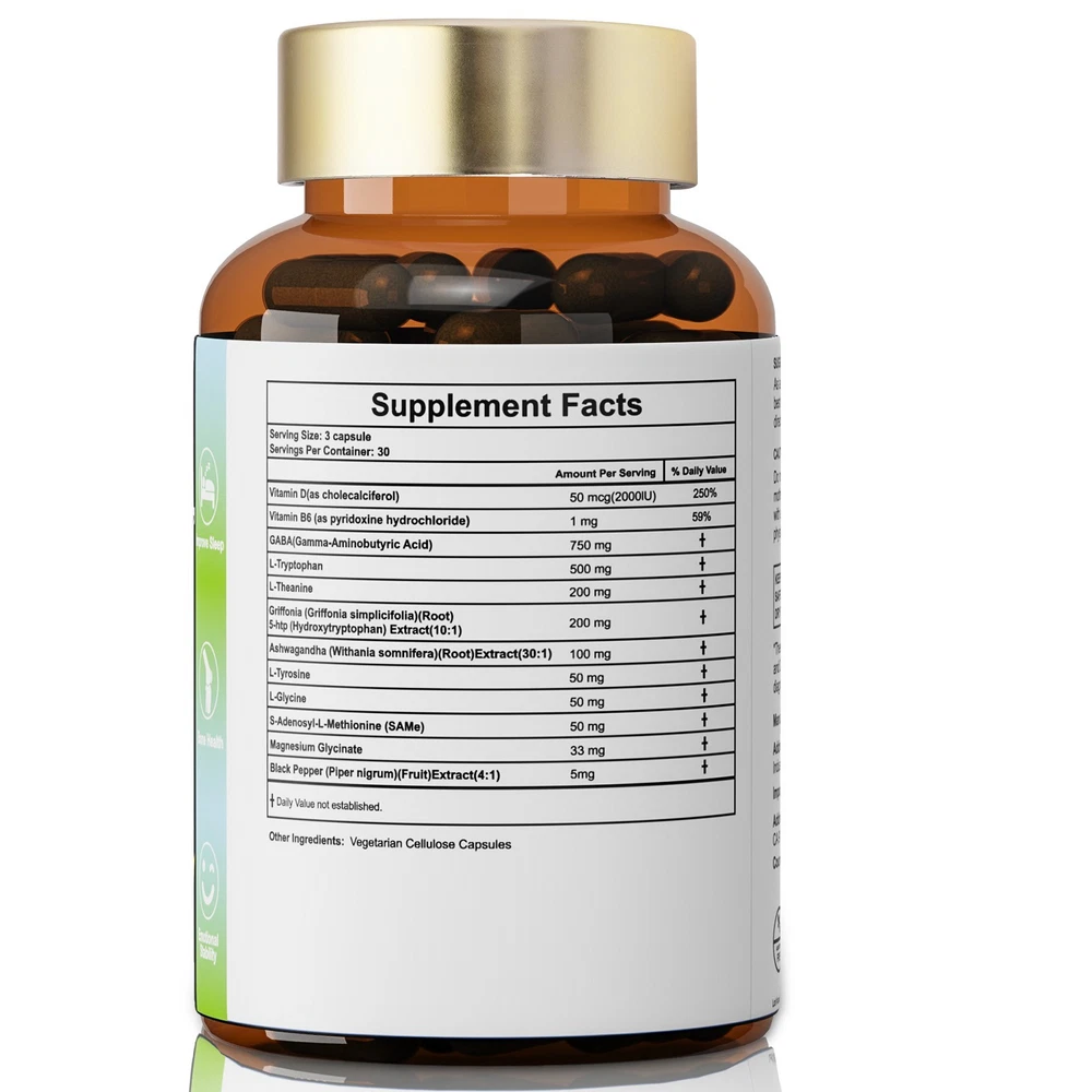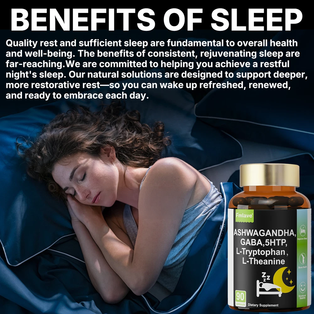 Sleep & Relaxation Capsules – Ashwagandha, GABA, 5-HTP | Natural Stress Relief, Muscle Relaxation | Better Absorption | 90 capsules | 30-Day Supply Active Ingredients: GABA, L-Tryptophan, L-Theanine, , 5-HTP, Ashwagandha, Vitamin B6, Vitamin D, Magnesium Glycinate, Black Pepper, S-Adenosyl-L-Methionine (SAMe) . Features: 🌿 Comprehensive Mood & Relaxation Formula – Combines GABA, 5-HTP, L-Tryptophan, and L-Theanine to naturally boost serotonin levels, reduce anxiety, and promote calm clarity. 😌 Adaptogenic Stress Relief – Ashwagandha helps your body adapt to stress while lowering cortisol levels, supporting emotional balance and resilience. 💤 Deeper, Restful Sleep – Fall asleep faster and wake up refreshed with natural neurotransmitter support that encourages healthy melatonin production. 💊 Enhanced Absorption with Black Pepper – Includes Black Pepper Extract to increase bioavailability and ensure your body fully absorbs each active ingredient. 🌞 Mood-Boosting Vitamins & Minerals – With Vitamin D3, B6, and Magnesium to support serotonin synthesis, nervous system health, and a positive mood all day long. Main benifits: Supports Relaxation Supports Serotonin Regulation Supports Mood Balance Support Deeper, Restful Sleep Support Stress Relief Note: This product is a dietary supplement and is not intended to diagnose, treat, or prevent diseases. The FDA has not evaluated its effectiveness. HOW TOTAKE IT: Take 3 capsules once a day. For best resultstake with a meal and an 8 oz.glass of water or asdirected by your healthcare professiona. What you would receive? 1x 90 capsules Sleep Aid Supplement.