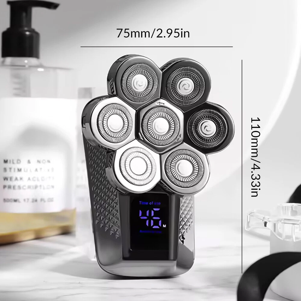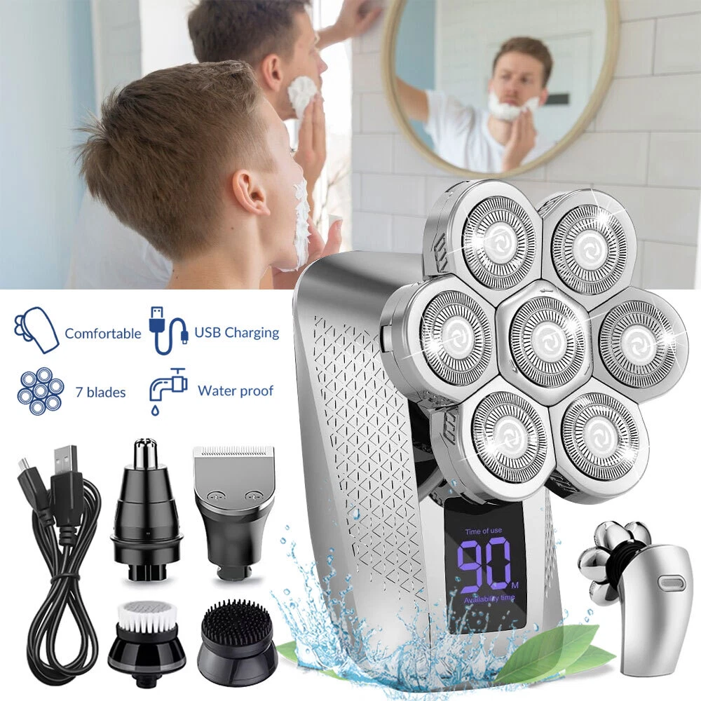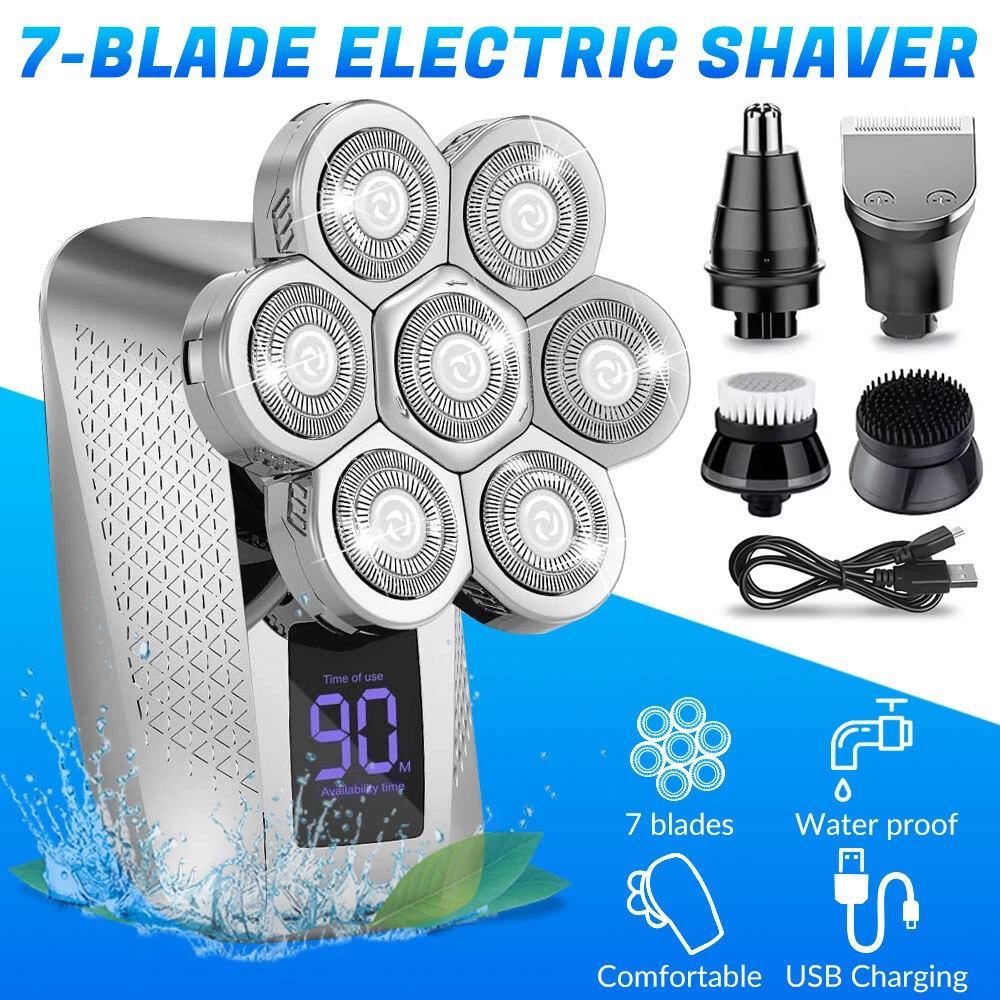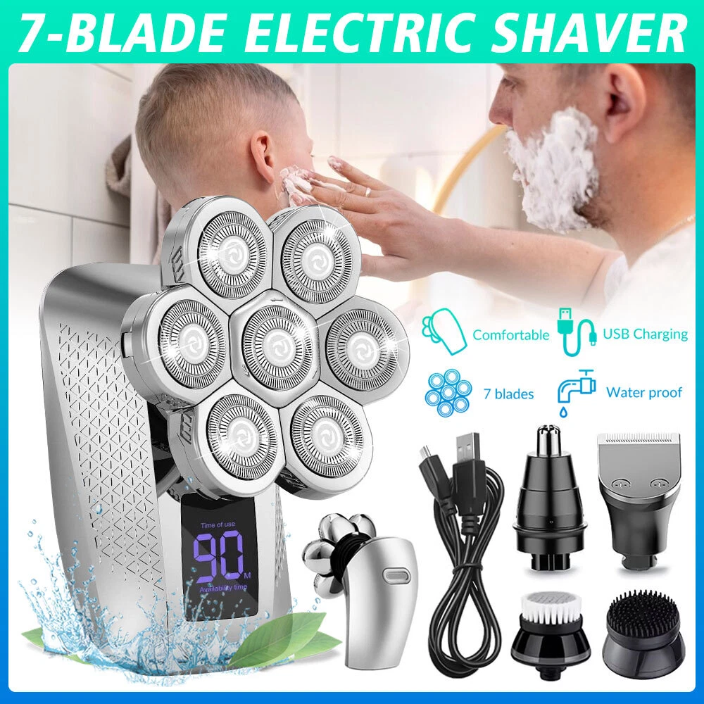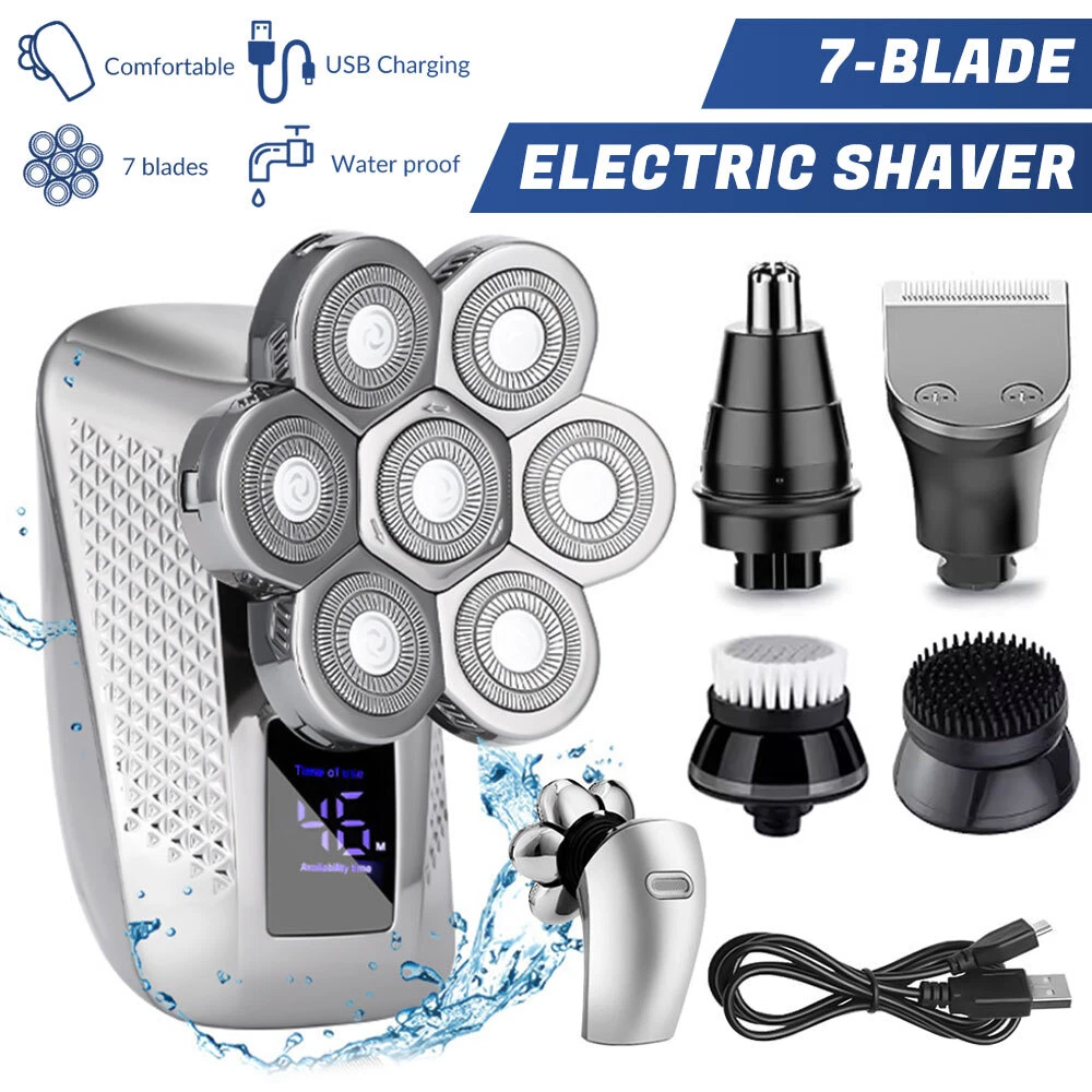 Features: All-in-One 7D Men's: Our Head in hand for your haircut, nose trimming, and needs. The all-inclusive kit comes with blade rotary heads, safety guards, and a nose & ear hair trimmer. Five kinds of feature heads freely switch, saving money, saving time, saving effort, and saving trouble. 7 Flexible Heads: The upgraded 7-blade design increases area and saves time. 7D precise & sharp rotary blade heads fit the facial contour and ensure more hair with every pass, resulting in smooth and close. A good choice for men's bald heads. USB Type-C Fast: Men's head built-in support 90 minutes after 2 hours of fully. The PC, a power bank, a car or direct power connection, etc. Easy to find a Type-C cable. Suitable for home and travel use. LED Intelligent Display: Men's Bald heads with LED display can show the percentage of the power, consumption. So you can easily decide when to head after. The man's head has a button switch, red when, and green when in use. IPX7 Dry & Wet Safe to Use: IPX7 satisfies both wet and dry use, is easy to operate and easy to, supports with foam or, even in the shower. The directly under the running. Note: Please flip up each blade to out the hair. Ergonomic Design & Comfortable Grasp: This a high-performance detachable 360° rotating razor head, which fits comfortably to every angle of your face or head, and can easily cheek, necks, and some hard to touched areas. Adopt an ergonomically smooth design, which can be comfortably grasped, with a suitable arc, and a more comfortable grip. Specificat i on: Function: full body washing, LED display, floating cutter head, veneer adjustment Razor head: rotary multi-head (more than 4) Cleaning method: body wash Battery life: 1.5 hours Color: five in one set Power supply mode: USB charging Motor Type: Brush Motor Is there a floating structure: yes Battery life: more than 15 days Built-in battery capacity: 500mAh-800mAh (included) Whether built-in battery: built-in battery Noise: 36-45db packing list: 1 x 5 in 1 multifunction 7 head electric shaver