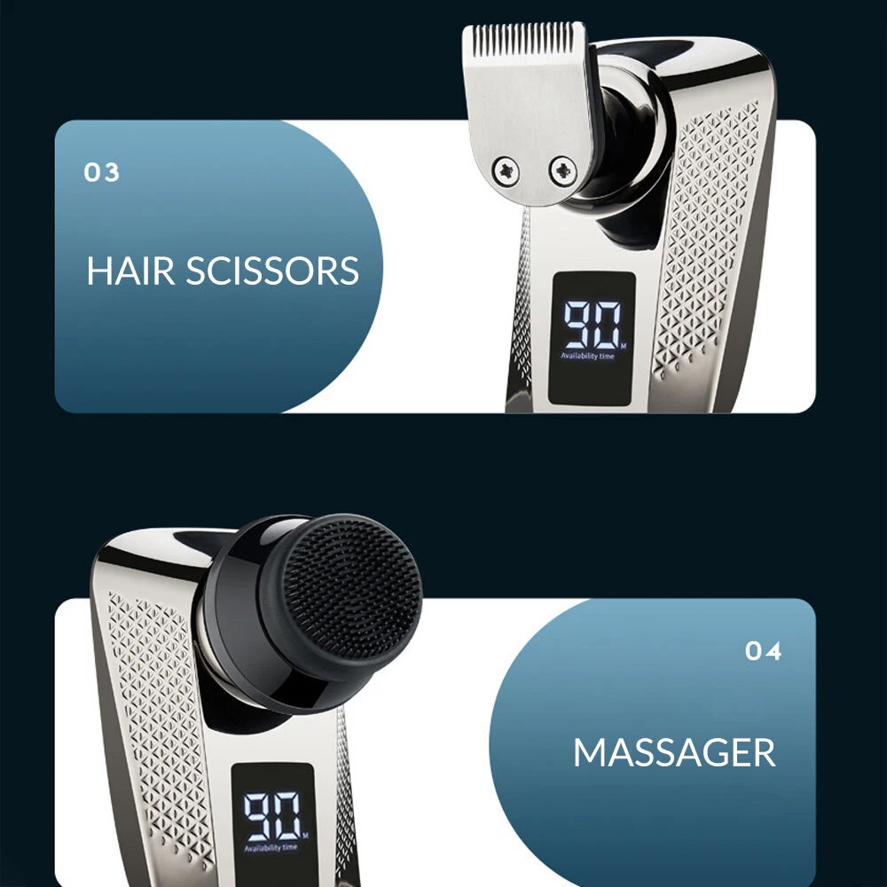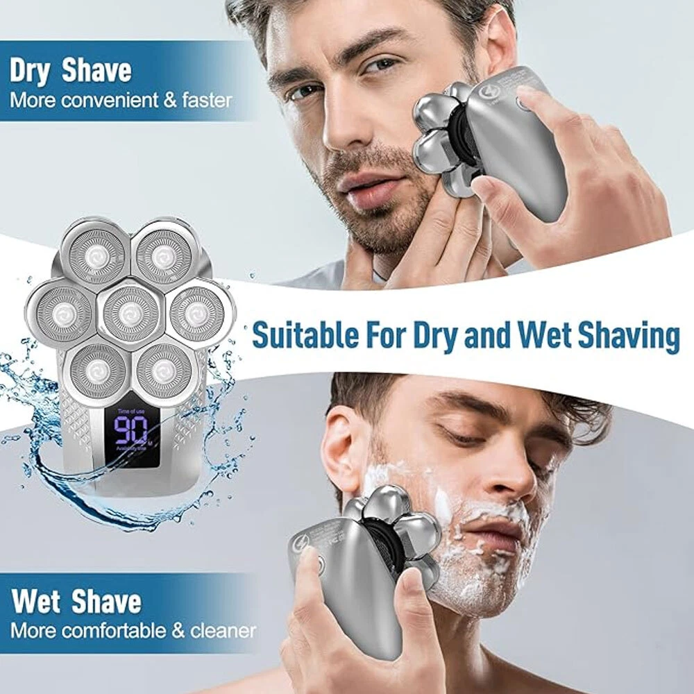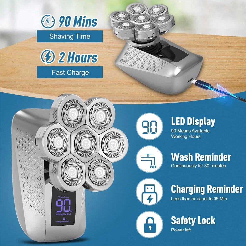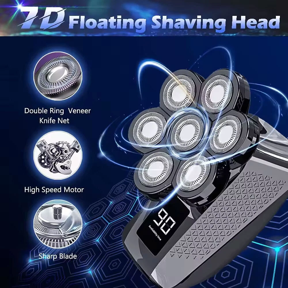 Features: All-in-One 7D Men's: Our Head in hand for your haircut, nose trimming, and needs. The all-inclusive kit comes with blade rotary heads, safety guards, and a nose & ear hair trimmer. Five kinds of feature heads freely switch, saving money, saving time, saving effort, and saving trouble. 7 Flexible Heads: The upgraded 7-blade design increases area and saves time. 7D precise & sharp rotary blade heads fit the facial contour and ensure more hair with every pass, resulting in smooth and close. A good choice for men's bald heads. USB Type-C Fast: Men's head built-in support 90 minutes after 2 hours of fully. The PC, a power bank, a car or direct power connection, etc. Easy to find a Type-C cable. Suitable for home and travel use. LED Intelligent Display: Men's Bald heads with LED display can show the percentage of the power, consumption. So you can easily decide when to head after. The man's head has a button switch, red when, and green when in use. IPX7 Dry & Wet Safe to Use: IPX7 satisfies both wet and dry use, is easy to operate and easy to, supports with foam or, even in the shower. The directly under the running. Note: Please flip up each blade to out the hair. Ergonomic Design & Comfortable Grasp: This a high-performance detachable 360° rotating razor head, which fits comfortably to every angle of your face or head, and can easily cheek, necks, and some hard to touched areas. Adopt an ergonomically smooth design, which can be comfortably grasped, with a suitable arc, and a more comfortable grip. Specificat i on: Function: full body washing, LED display, floating cutter head, veneer adjustment Razor head: rotary multi-head (more than 4) Cleaning method: body wash Battery life: 1.5 hours Color: five in one set Power supply mode: USB charging Motor Type: Brush Motor Is there a floating structure: yes Battery life: more than 15 days Built-in battery capacity: 500mAh-800mAh (included) Whether built-in battery: built-in battery Noise: 36-45db packing list: 1 x 5 in 1 multifunction 7 head electric shaver