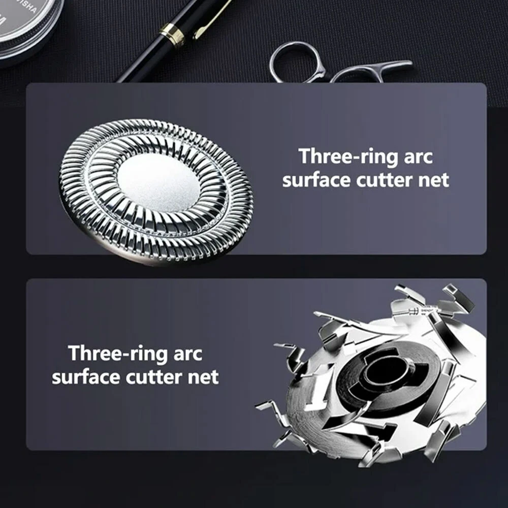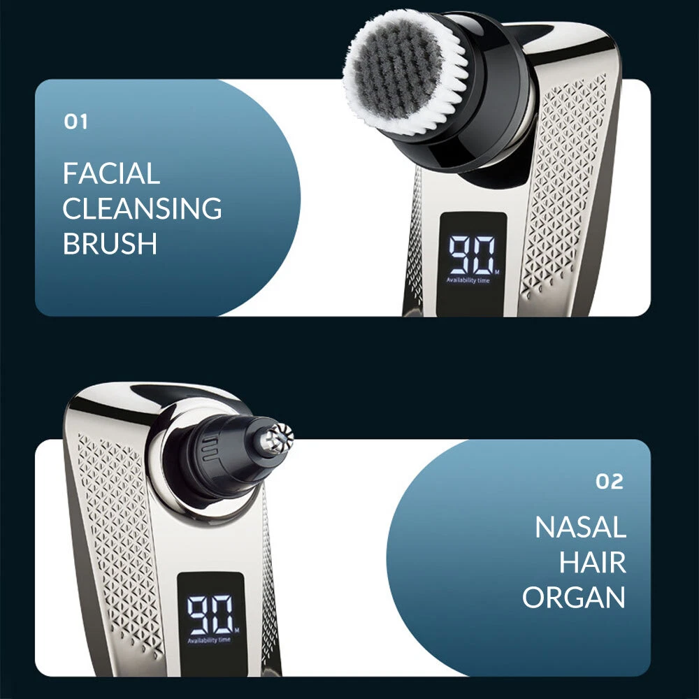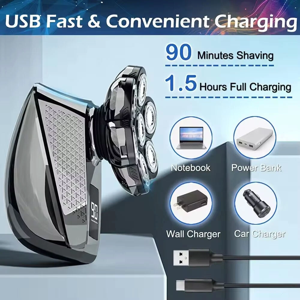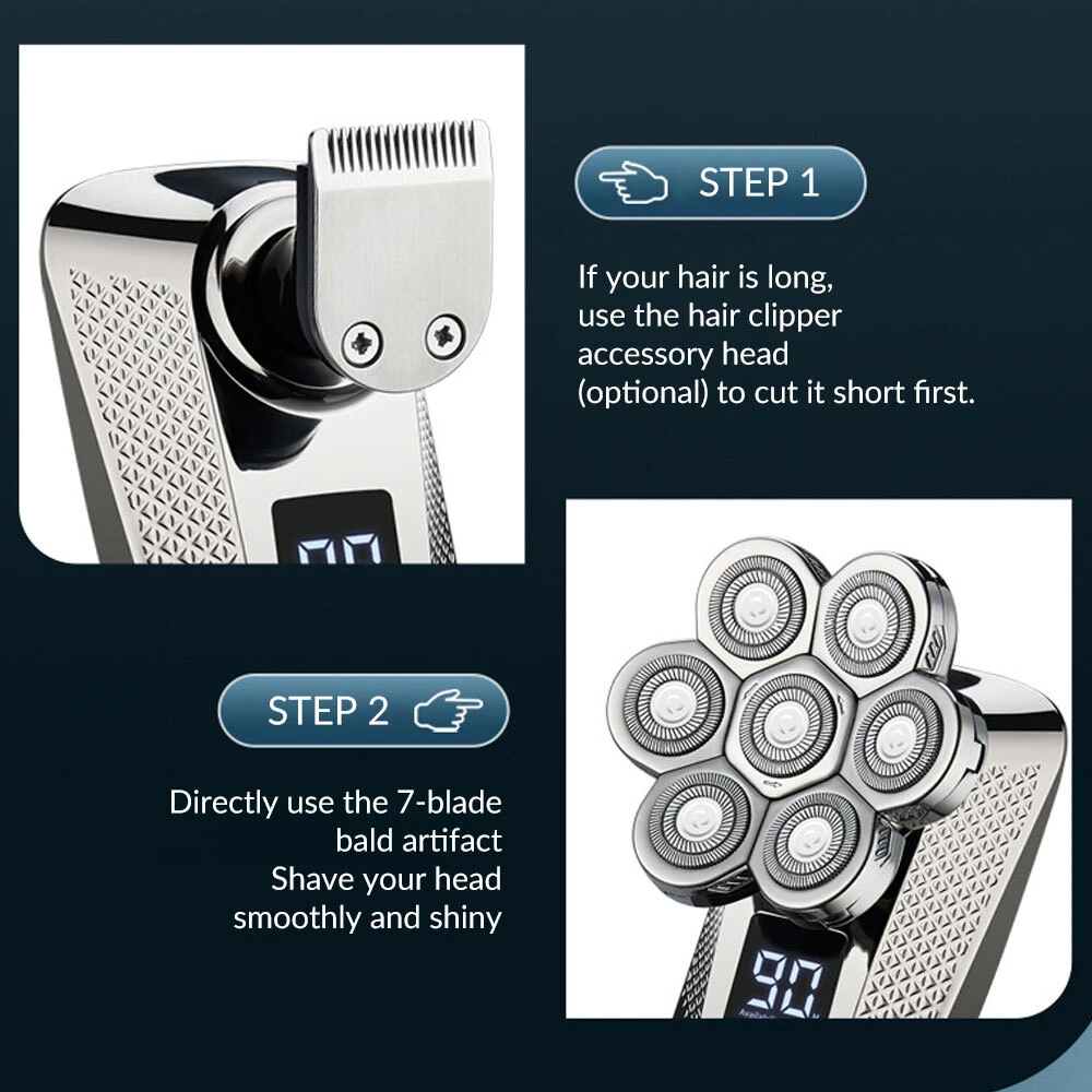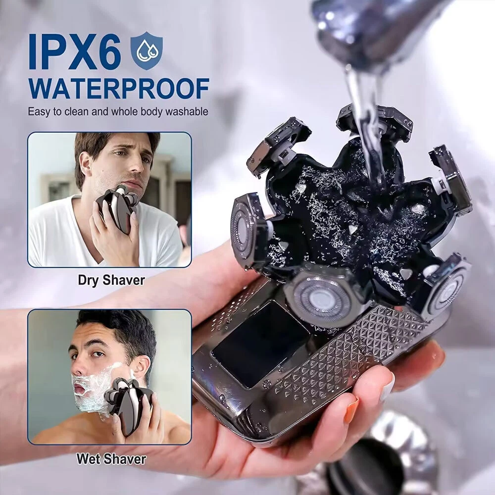 Features: All-in-One 7D Men's: Our Head in hand for your haircut, nose trimming, and needs. The all-inclusive kit comes with blade rotary heads, safety guards, and a nose & ear hair trimmer. Five kinds of feature heads freely switch, saving money, saving time, saving effort, and saving trouble. 7 Flexible Heads: The upgraded 7-blade design increases area and saves time. 7D precise & sharp rotary blade heads fit the facial contour and ensure more hair with every pass, resulting in smooth and close. A good choice for men's bald heads. USB Type-C Fast: Men's head built-in support 90 minutes after 2 hours of fully. The PC, a power bank, a car or direct power connection, etc. Easy to find a Type-C cable. Suitable for home and travel use. LED Intelligent Display: Men's Bald heads with LED display can show the percentage of the power, consumption. So you can easily decide when to head after. The man's head has a button switch, red when, and green when in use. IPX7 Dry & Wet Safe to Use: IPX7 satisfies both wet and dry use, is easy to operate and easy to, supports with foam or, even in the shower. The directly under the running. Note: Please flip up each blade to out the hair. Ergonomic Design & Comfortable Grasp: This a high-performance detachable 360° rotating razor head, which fits comfortably to every angle of your face or head, and can easily cheek, necks, and some hard to touched areas. Adopt an ergonomically smooth design, which can be comfortably grasped, with a suitable arc, and a more comfortable grip. Specificat i on: Function: full body washing, LED display, floating cutter head, veneer adjustment Razor head: rotary multi-head (more than 4) Cleaning method: body wash Battery life: 1.5 hours Color: five in one set Power supply mode: USB charging Motor Type: Brush Motor Is there a floating structure: yes Battery life: more than 15 days Built-in battery capacity: 500mAh-800mAh (included) Whether built-in battery: built-in battery Noise: 36-45db packing list: 1 x 5 in 1 multifunction 7 head electric shaver