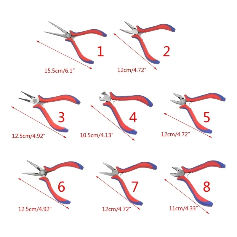 Features: brand new and high quality Made from drop high-carbon steel with overall heat treatments for hardness and long-lasting Hardened cutting edges allows for sharpness and easy cutting. These mini pliers are equipped with double spring shrapnel to keep the small pliers open automatically. And the leverage design saves you lot of effort to hold and squeeze the handles. The mini pliers features TPR handle that offer a comfortable grip while using. This soft rubber handle can prevent fatigue even for long-time work. Perfect for electronic repair, factory processing, machine maintenance, home appliance repair, jewelry making and DIY projects. Light in weight, small in size, convenient for you to store and manage, will not take up too much space Specifications: Material:Carbon Steel Type:Needle Nose Pliers/Curved-Nose Pliers/Round Nose Pliers/Top Cutting Pliers/Wire Cutters/Needle Nose Pliers/Flat Nose Pliers Nose Pliers Needle Nose Pliers:Approx.155mm/6.1inches Curved-Nose Pliers:Approx.120mm/4.72inches Round Nose Pliers:Approx.125mm/4.92inches Top Cutting Pliers:Approx.105mm/4.13inches Wire Cutters:Approx.120mm/4.72inches Needle Nose Pliers::Approx.125mm/4.92inches Flat Nose Pliers:Approx.120mm/4.72inches Nose Pliers:Approx.110mm/4.33inches Package Includes: 1x Mini Plier note: 1.Please allow 1-2cm errors due to manual measurement, make sure that you do not mind before you order. 2.Due to the difference between different monitors, the picture may not reflect the actual color of the item.