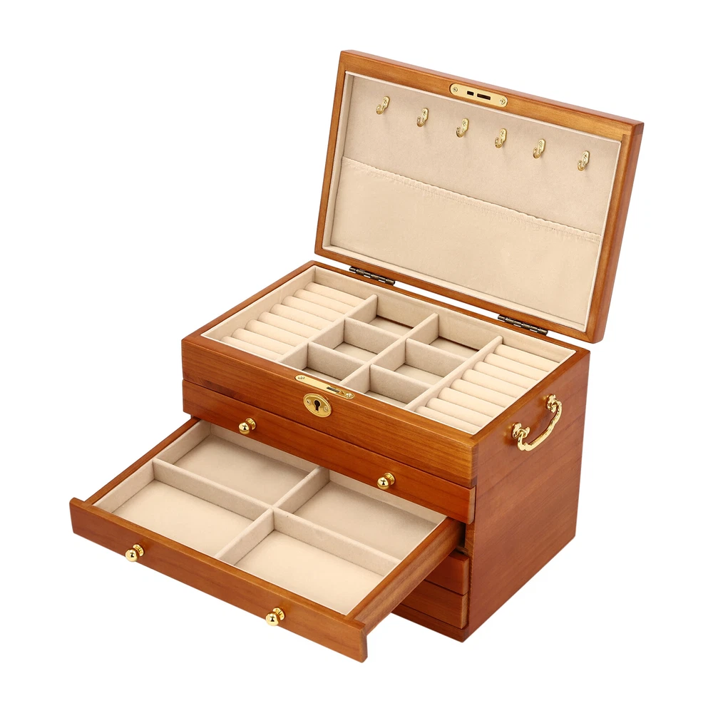 Specifications Material: Sycamore Wood + Metal+Flocked Fabric Color: Walnut Color Number of Drawers: 4 Closure Type: Key Lock Handle Placement: Sides Hook Material: Hardware Gross Weight: 3.5kg/7.7lbs Net Weight: 3kg/6.6lbs Package Size: 35*26.5*28cm/13.8*10.4*11inch Product Size: 29*19* 21.5cm/11.42*7.48*8.46inch Package Included 1* Wooden Jewelry Box 1* Key 5-Layer Jewelry Storage Box Large Wooden Ring Necklace Organizer with 4 Drawers Jewelry Box Wooden for Wowen Gifts 5-Layer Large Organizer Box with 4 Drawers US 💍Description ✨_Is your jewelry often cluttered and impossible to find? Do you have too much jewelry without a large enough storage box? If you answered yes to any of these questions, then this four-tier jewelry box is for you. The four-tier storage design allows you to store many different types and sizes of jewelry. The wood material makes this jewelry box more vintage and elegant, not only to help with storage but also as a decorative piece to keep in your home. 💍 Specifications Material: Sycamore Wood + Metal+Flocked Fabric Color: Walnut Color Number of Drawers: 4 Closure Type: Key Lock Handle Placement: Sides Hook Material: Hardware Gross Weight: 3.5kg/7.7lbs Net Weight: 3kg/6.6lbs Package Size: 35*26.5*28cm/13.8*10.4*11inch Product Size: 29*19* 21.5cm/11.42*7.48*8.46inch Package Included 1* Wooden Jewelry Box 1* Key 💍 Key Features High-quality Materials: The jewelry box is made of sycamore wood with veneer and lacquer treatment, which is not only very durable but also attractive. The interior has a soft long flocked cloth as a lining to keep your jewelry from being scratched and crushed. Beautiful Appearance: The production process of the jewelry box retains the natural color of the wood, the surface is polished and smooth and the texture is visible. Large Capacity: This jewelry box has 4 drawers. Each of these drawers contains a different number of compartments to store many different types and sizes of jewelry. Full Pull-out Drawer: The drawer of this jewelry box is a full pull-out design, which can display all the jewelry and make it more convenient for you to get it. Safety Latch: The safety latch on the lid is designed to keep this item securely locked. This will protect your rings, earrings, necklaces, watches, and other jewelry accessories. Metal Hooks: This jewelry box has a layer of metal hooks specifically for necklaces, so you can hang your necklaces inside to prevent them from piling up and tying up, and such an intuitive design makes it easy to access. -------------------------- 🦢 🦢 SEE MORE 🦢 🦢 ----------------------- Fine Workmanship : From the smooth surface to the soft inner lining, even the sturdy locks and hooks are finely crafted to give you a better user experience. Reasonable Layout: Each level is divided into compartments of different sizes to facilitate a better display of your jewelry and easy access, especially the first layer has a dedicated area for storing rings, so you can store different types or sizes of jewelry separately. Ideal Gift : This jewelry box has a unique design with a beautiful appearance and a large capacity with practical features. It is an ideal gift for Valentine's Day, Mother's Day, Thanksgiving, Christmas, birthdays, and weddings. 💍 Details High-quality Hinges: The hinge is made of high-quality hardware and is strong and durable. It has been tested many times to open and close, so you can use it with no worries. Exquisite Handles: Each compartment has a small and delicate handle for easy pulling out. Flocked Fabric: The lining of this jewelry box is made of soft, high-quality flocked fabric that is comfortable to the touch. It can protect your jewelry well from being crushed and scratched. Storage Pocket: A small pocket underneath the metal hook adds storage space to the jewelry box. You can also put the lower part of the necklace hanging from the hook into the pocket. Side Metal Handles: This jewelry box has polished and smooth metal handles on both sides, making it easy to move the jewelry box. 💍 Application It is suitable for organizing various jewelry including sunglasses, watches, hairpins, earrings, rings, bracelets,watches, and necklaces. Notes: 1. Please allow the slight color difference caused by the shooting light and 1-3cm error due to manual measurement, and make sure you do not mind before ordering. 2. The drawer of the product is movable. Please manually adjust the placement position of the drawer for neatness and beauty. Payment Delivery details Terms of sales About us Contact us Payment We accept ebay payment 。 Fees such as import duties, taxes are not included in the item price or shipping costs. These charges are the buyer's responsibility. Delivery details Shipping: 2-9 working days to: USA Terms of sales We maintain high standards of excellence and strive for hundred percent customer satisfaction. Feedback is very important to us. We hope that you contact us immediately before you give neutral or negative feedback, so that we can address your concerns. It is impossible to address issues if we do not know about them! About us Your satis faction is our ultimate goal. We work hard to earn your trust and future business. Our certified technicians have tested each item before shipping. The unit comes with 1 year limited warranty on all manufacturing defects. a) If you receive a defective item, you may return it or ask for a discount. Please contact us within 14 days after you receive the package. b) What you returned must be intact and in its original packaging as re? u. Customer is responsible for shipping costs of the returned item. c) We will cover the cost of shipping back t with the shipping rate indicated in the registration page. We will send you a new unit or refund the full payment you paid. Thank you. Contact us Business Hour Business Hour: Monday To Friday: 8:30 AM to 5:00 PM (Beijing China time) Due to time zones, our reply to your questions may not be immediately