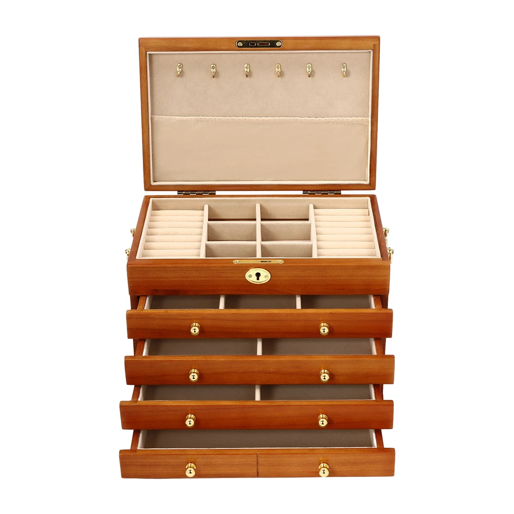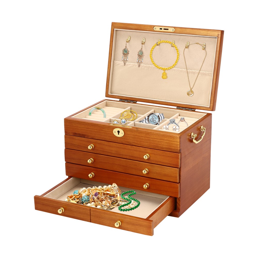 5-Layer Large Wooden Jewelry Storage Box Ring Necklace Organizer with 4 Drawers Jewelry Box Wooden for Wowen Gifts 5-Layer Large Organizer Box with 4 Drawers US ??Description ✨_Is your jewelry often cluttered and impossible to find? Do you have too much jewelry without a large enough storage box? If you answered yes to any of these questions, then this four-tier jewelry box is for you. The four-tier storage design allows you to store many different types and sizes of jewelry. The wood material makes this jewelry box more vintage and elegant, not only to help with storage but also as a decorative piece to keep in your home. ?? Specifications Material: Sycamore Wood + Metal+Flocked Fabric Color: Walnut Color Number of Drawers: 4 Closure Type: Key Lock Handle Placement: Sides Hook Material: Hardware Gross Weight: 3.5kg/7.7lbs Net Weight: 3kg/6.6lbs Package Size: 35*26.5*28cm/13.8*10.4*11inch Product Size: 29*19* 21.5cm/11.42*7.48*8.46inch Package Included 1* Wooden Jewelry Box 1* Key ?? Key Features High-quality Materials: The jewelry box is made of sycamore wood with veneer and lacquer treatment, which is not only very durable but also attractive. The interior has a soft long flocked cloth as a lining to keep your jewelry from being scratched and crushed. Beautiful Appearance: The production process of the jewelry box retains the natural color of the wood, the surface is polished and smooth and the texture is visible. Large Capacity: This jewelry box has 4 drawers. Each of these drawers contains a different number of compartments to store many different types and sizes of jewelry. Full Pull-out Drawer: The drawer of this jewelry box is a full pull-out design, which can display all the jewelry and make it more convenient for you to get it. Safety Latch: The safety latch on the lid is designed to keep this item securely locked. This will protect your rings, earrings, necklaces, watches, and other jewelry accessories. Metal Hooks: This jewelry box has a layer of metal hooks specifically for necklaces, so you can hang your necklaces inside to prevent them from piling up and tying up, and such an intuitive design makes it easy to access. -------------------------- ?? ?? SEE MORE ?? ?? ----------------------- Fine Workmanship : From the smooth surface to the soft inner lining, even the sturdy locks and hooks are finely crafted to give you a better user experience. Reasonable Layout: Each level is divided into compartments of different sizes to facilitate a better display of your jewelry and easy access, especially the first layer has a dedicated area for storing rings, so you can store different types or sizes of jewelry separately. Ideal Gift : This jewelry box has a unique design with a beautiful appearance and a large capacity with practical features. It is an ideal gift for Valentine's Day, Mother's Day, Thanksgiving, Christmas, birthdays, and weddings. ?? Details High-quality Hinges: The hinge is made of high-quality hardware and is strong and durable. It has been tested many times to open and close, so you can use it with no worries. Exquisite Handles: Each compartment has a small and delicate handle for easy pulling out. Flocked Fabric: The lining of this jewelry box is made of soft, high-quality flocked fabric that is comfortable to the touch. It can protect your jewelry well from being crushed and scratched. Storage Pocket: A small pocket underneath the metal hook adds storage space to the jewelry box. You can also put the lower part of the necklace hanging from the hook into the pocket. Side Metal Handles: This jewelry box has polished and smooth metal handles on both sides, making it easy to move the jewelry box. ?? Application It is suitable for organizing various jewelry including sunglasses, watches, hairpins, earrings, rings, bracelets,watches, and necklaces. Notes Please allow the slight color difference caused by the shooting light and 1-3cm error due to manual measurement, and make sure you do not mind before ordering. Notes:2. The drawer of the product is movable. Please manually adjust the placement position of the drawer for neatness and beauty. Payment Delivery details Terms of sales About us Contact us Payment We accept ebay payment 。 Fees such as import duties, taxes are not included in the item price or shipping costs. These charges are the buyer's responsibility. Delivery details Shipping: 2-9 working days to: USA Terms of sales We maintain high standards of excellence and strive for hundred percent customer satisfaction. Feedback is very important to us. We hope that you contact us immediately before you give neutral or negative feedback, so that we can address your concerns. It is impossible to address issues if we do not know about them! About us Your satis faction is our ultimate goal. We work hard to earn your trust and future business. Our certified technicians have tested each item before shipping. The unit comes with 1 year limited warranty on all manufacturing defects. a) If you receive a defective item, you may return it or ask for a discount. Please contact us within 14 days after you receive the package. b) What you returned must be intact and in its original packaging as re? u. Customer is responsible for shipping costs of the returned item. c) We will cover the cost of shipping back t with the shipping rate indicated in the registration page. We will send you a new unit or refund the full payment you paid. Thank you. Contact us Business Hour Business Hour: Monday To Friday: 8:30 AM to 5:00 PM (Beijing China time) Due to time zones, our reply to your questions may not be immediately. But within above working time, we will reply your email within 24 hours. If it's non-workdays, please kindly be patient and wait till Monday. Please contact us with ebay message. Please feel free to contact us if you have any questions. Monday To Friday: 8:30 AM to 5:00 PM (Beijing China time) Due to time zones, our reply to your questions may not be immediately. But within