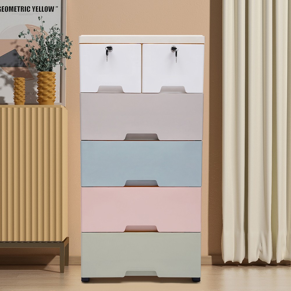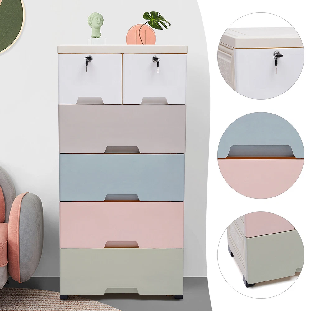 Application It is suitable for storing clothes, toys, children's books, and other items. It can be placed in the crevice space next to beds, closets, sofas, and cabinets. Its load-bearing capacity is 30kg/66lbs. Specification Color: White, Gray, Blue, Pink, Green Material: Food-grade PP Shape: Rectangular Style: Modern Number of Layers: 5 Number of Drawers: 6 Load-bearing Capacity: 30kg/66lbs Product Size: 50*35*102cm/19.69*13.78*40.16inch Gross Weight: 7.9kg/17.42lbs Package Size: 51.5*40.5*49cm/20.2*15.9*19.2inch Package Included 6* Drawers 6* Drawer Panels 1* Top Panel 5* Frames 16* Panels 4* Wheel Covers 5* Wheels 4* Keys 1* Chinese Manual Notes 1.Please read the manual completely before installation and use, and pay particular attention to the safety instructions included. ❤❤❤Welcome to royalfeatured, have a good day ❤❤❤ Description Are odds and ends cluttering your room? Are you still worried that the space at home is too small? Don't worry, this product can help you. This storage cabinet has 6 drawers that can store a lot of items to meet your storage needs and give you a neat space. Key Features High-quality Material: This product is made of high-quality PP, which is strong, durable, and not easy to deform. Good material can extend its service life. Elegant Appearance: The brilliant colors, as well as the classic design, makes it look elegant. It is a good decorative piece that can blend in with different home decor styles and add color to the home. Saving Space: This product is designed vertically. It makes full use of the unused vertical space to store items and occupies a small area of 50*35cm/19.69*13.78inch, which can save you a lot of space. Strong Load-bearing Capacity: The load-bearing capacity of this product is 30kg/66lbs, which is strong enough for you to store items without worrying about it shaking and tipping. Large Capacity: This product includes two small drawers and four large drawers, which allows you to distinguish the placement according to the size of the items. The 6 drawers make it possible to hold more items and meet your daily storage needs. Makes Space Neat: It has six drawers that make it easy for you to store as well as access your items. It can get your room out of clutter and back to a neat and organized state. Excellent Sealing: The drawer design makes this product well sealed to prevent dust as well as insects from entering. You can use it with peace of mind. Stackable Design: The stacking design allows you to combine and disassemble them according to your needs. You can store flexibly. Protect Your Privacy: This product comes with two drawers with locks, which can protect your privacy very well. Good Stability: This product is designed with a dense frame and has a large landing support area, so it is very stable. You can use it without worrying about it shaking and tipping over. Eco-friendly : The food-grade PP material is non-toxic, odorless, and good for human health, and it is also recyclable, which is very environmentally friendly. Convenient to Move: The four wheels on the bottom of the product are hard-wearing and make very little noise when in use, providing you with a quiet environment. At the same time, it slides flexibly, making it easy for you to move the product and for cleaning. Easy to Clean: The surface of this product is smooth and flat, which is easy to clean. You just need to wipe it with a wet rag. Easy to Install: This product is simple in structure and complete in the package. You only need a few simple steps to install it, which is very time-saving and labor-saving. Guaranteed Customer Service: We aim to provide quality products and services. If you have problems, please feel free to contact us. We will reply and solve the problem for you as soon as possible. Details Drawer Stops: Each drawer has raised stops on both sides to prevent the drawer from slipping out easily. Rounded Corners: The corners of this product are very rounded and smooth, which can protect you from collisions and is very safe to place in your home. Thickened Top Panel: The thickened top has a strong load-bearing capacity, which allows you to put a lot of items on it with peace of mind. It can also facilitate your access to commonly used objects. Recessed Handles: The drawers are designed with recessed handles, which makes it easier to access items and saves surface space. At the same time, the rounded handles protect your hands from scratches and are more aesthetically pleasing. Application It is suitable for storing clothes, toys, children's books, and other items. It can be placed in the crevice space next to beds, closets, sofas, and cabinets. Its load-bearing capacity is 30kg/66lbs. Specification Color: White, Gray, Blue, Pink, Green Material: Food-grade PP Shape: Rectangular Style: Modern Number of Layers: 5 Number of Drawers: 6 Load-bearing Capacity: 30kg/66lbs Product Size: 50*35*102cm/19.69*13.78*40.16inch Gross Weight: 7.9kg/17.42lbs Package Size: 51.5*40.5*49cm/20.2*15.9*19.2inch Package Included 6* Drawers 6* Drawer Panels 1* Top Panel 5* Frames 16* Panels 4* Wheel Covers 5* Wheels 4* Keys 1* Chinese Manual Notes Please read the manual completely before installation and use, and pay particular attention to the safety instructions included. Please allow the slight color difference caused by the shooting light and 1-3cm error due to manual measurement, and make sure you do not mind before ordering. Payment Delivery details Terms of sales About us Contact us Payment We accept ebay payment 。 Fees such as import duties, taxes are not included in the item price or shipping costs. These charges are the buyer's responsibility. Delivery details Shipping: 2-9 working days to: USA Terms of sales We maintain high standards of excellence and strive for hundred percent customer satisfaction. Feedback is very important to us. We hope that you contact us immediately before you give neutral or negative feedback, so that we can address your concern