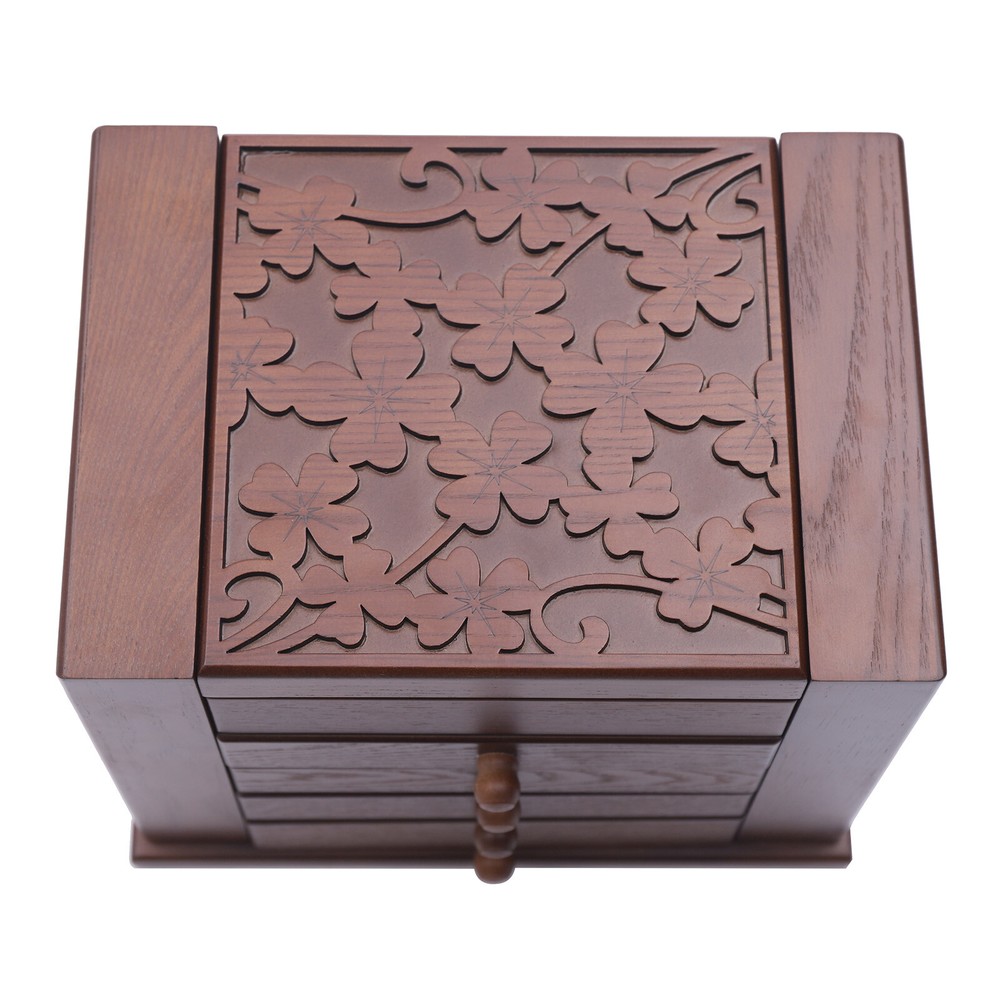 Description: Perfect Organizer: Are You Still Worried About Losing Your Jewelry? This Large Jewelry Box Is a Good Solution, It Can Store Your Valuable Jewelry Collection Well, Such As Earrings, Bangles, Rings And Other Accessories. Material: This Jewelry Box For Women Is Made Of Rustic Quality Wood, Which Is Sturdy And Durable. It Keeps Your Jewelry Well Against Dust, Scratches, Damages.Perfect For Eliminating Cluttering And Tangling. High Capacity: This Jewelry Storage Box Has Five Layers, Providing Ample Storage Space For Your Jewelry. The Jewelry Organizer Holder Helps To Keep All Your Jewelry Organized Decently, Displayed Neatly And Stored Safely. Vintage Design: The Wooden Jewelry Organizer Box Features The Exquisite And Fashionable Carved Flower, Three-Dimensional, Unique Style, Simple And Elegant. It Perfectly Fits Any Existing Decoration, Adding a Luxury Touch To Any Room. Ideal Gift: This Rustic Wooden Jewelry Organizer Box Is a Perfect Gift For Mom, Wife, Daughter, Or Girlfriend, We Can Be Sure This Will Be The Most Practical And Memorable Gift They Have Ever Received. Specification: Product: Jewelry Boxes Color: Brown Material: Wood Weight&Size: Size: 30x20x25cm/11.8x7.8x9.8 inch Weight: 3.6 kg/7.94 lb Application: Suitable For Organizing Various Jewelry Including Sunglasses, Watches, Hairpins, Earrings, Rings,Bracelets And Necklaces Package Includes: 1 * Jewelry Boxes