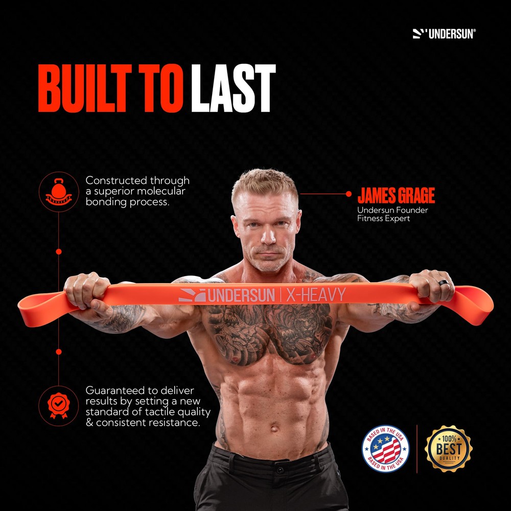 UPGRADE EVERY WORKOUT, ANYWHERE — These resistance workout bands for men and women are a must-have for any fitness enthusiast. Exceptionally effective, versatile, and affordable, they're perfect for enhancing home gym band workouts or training on the go. Ideal for any goal, whether it's weight training or functional athletic routines. Elevate your stretching bands exercise, every time. 5-LEVELS OF RESISTANCE, INFINITE POSSIBILITIES — This exercise band set offers 5 resistance levels, from X-Light to X-Heavy, each with variable resistance for tailored intensity. Stack them for endless combinations, ensuring a perfect challenge for every workout. Ideal for all body parts, including back, legs, shoulders, arms, abs—you're set for years of diverse, full-body fitness band workouts and pull up assistance bands. They're also great resistance bands for physical therapy. SUPERIOR STRENGTH. PREMIUM CRAFTSMANSHIP — Experience the pinnacle of workout bands resistance with our multi-layered bands, created through a superior molecular-bonding process for unmatched strength and resistance. Ignore the noise from other workout equipment brands. Visible layers in a band are a clear sign of inferior, glued construction. Choose stretch bands for exercise and get lasting performance. BETTER DESIGN, UNMATCHED FEEL — Our 42" loop-style resistance band set launches a new standard with its exceptional tactile quality and smooth, consistent resistance. It's crafted to challenge your muscles effectively while being gentle on joints. Feel the difference in these fitness bands with its non-slip, non-chalky texture, and enjoy a workout free from any unpleasant latex odors like other brands. STEP UP YOUR WORKOUT GAME — It's time to get serious about your fitness exercising bands. Grab a set of heavy-duty resistance bands and transform your work out routine today. Now you can workout anytime and anywhere. No more waiting, no more excuses – your goals are within reach. Act now and experience the difference. THE REAL DEAL — Established in the USA in 2018 by fitness expert James Grage, we are the leaders in resistance band training, setting the standard as true innovators. Unlike many faceless brands hiding behind American-looking fitness models in their photos, with you know exactly who you're dealing with. PUT TO THE QUALITY TEST — Every batch of bands are mechanically tested for both strength and longevity. Unlike many latex bands that are made from petrochemicals like Styrene and Butadiene, which are known to be carcinogenic, bands are 100% natural latex, which are tested and certified to be free of hazardous substances.