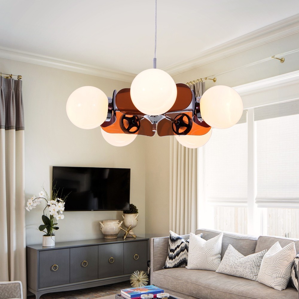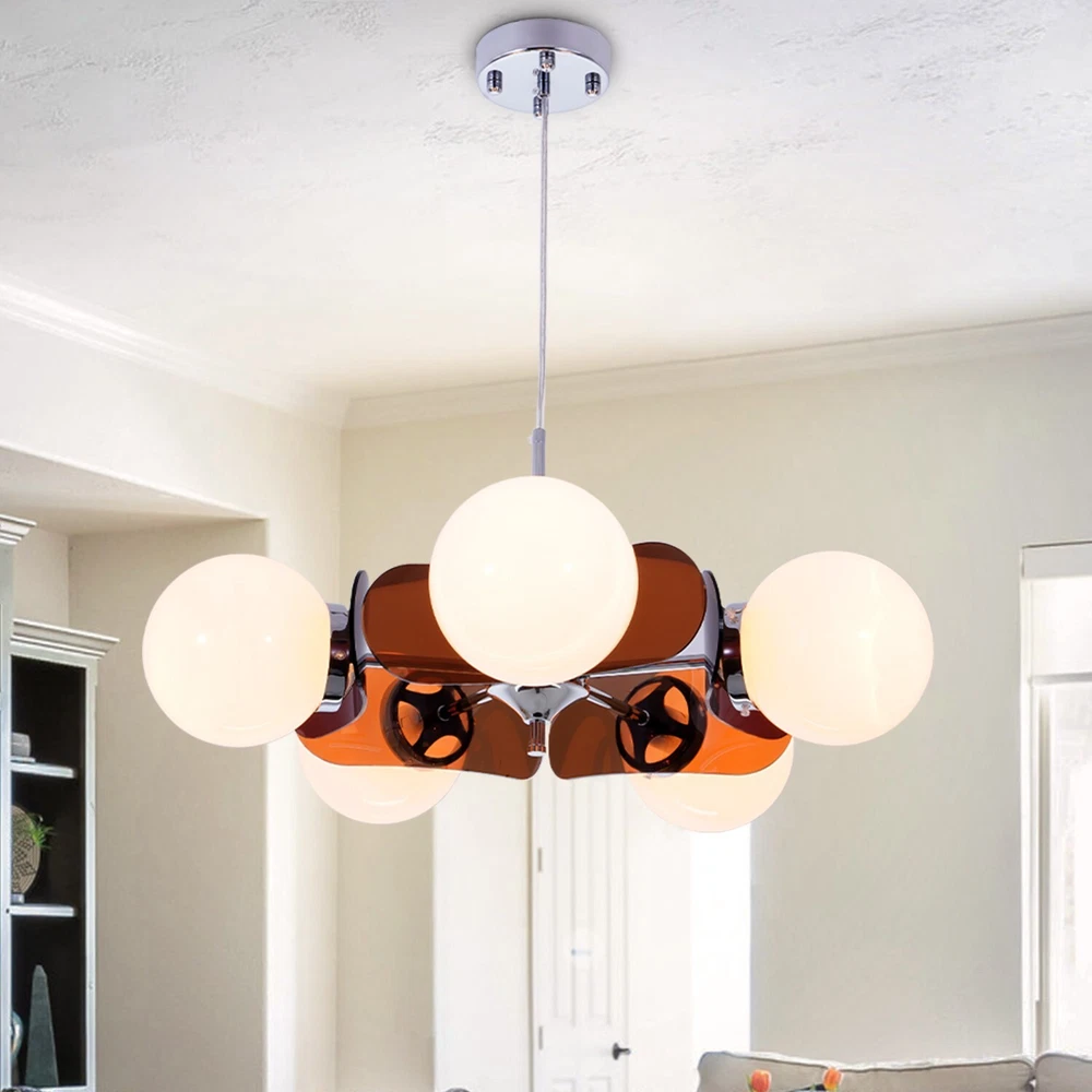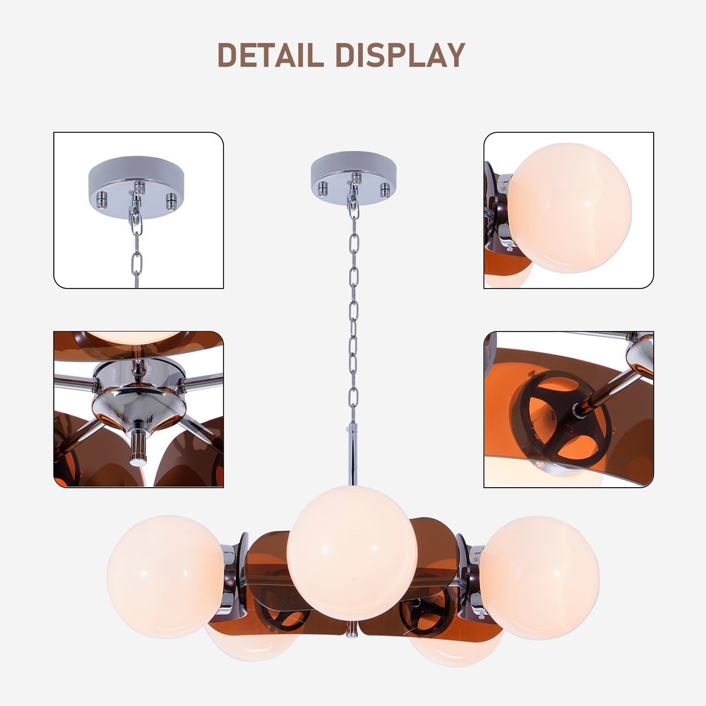 5-Lights Glass Globe Chandelier Vintage Pendant Lamp Semi-Flush Ceiling Fixtures PARAMETER ● Packing Size:22.8"L x 15.8"W x 13.4'"H ● Gross Weight: 9 lb ● Type: VintagePendant Lamp ● Color: Silver ● Material:Metal+Glass+Acrylic ● Base Type: E26 ● Number of light: 5 Lights(Bulbs are not Included) ● Installation method: Hanging pendant light ● Full installation size: Height:75cm/29.5",Width:60cm/23.6" ● Hanging Rod length: 16.5cm/6.5" ● Power Supply: AC Power 110V-220V ● Use For: Living Room/Dining Room/Bed Room/Baby Room/Study Room/Restaurant/Bars/Hallway etc. Payment Delivery details Terms of sales About us Contact us Payment We only accept several paymeny ways as follow: Delivery details Your goods will be shipped within our handling time after your full payment. This excludes these locations: Alaska, Hawaii and Puerto Rico.APO/FPO’s are definitely excluded. Terms of sales Return: We accept return within 30 days,but we are not responsible for human damage.The return shipping cost is the buyer's responsibilities and try to keep it in your original package. About us We are selling all kind of ceiling fan,crystal chandelier,pendant lights in high quality with best discounted price. Our goal is providing all our customers 100% satisfaction and best customer service. Contact us If you have any questions please contact us through "Ask seller a question" link. We will respond within 2 business day or less.