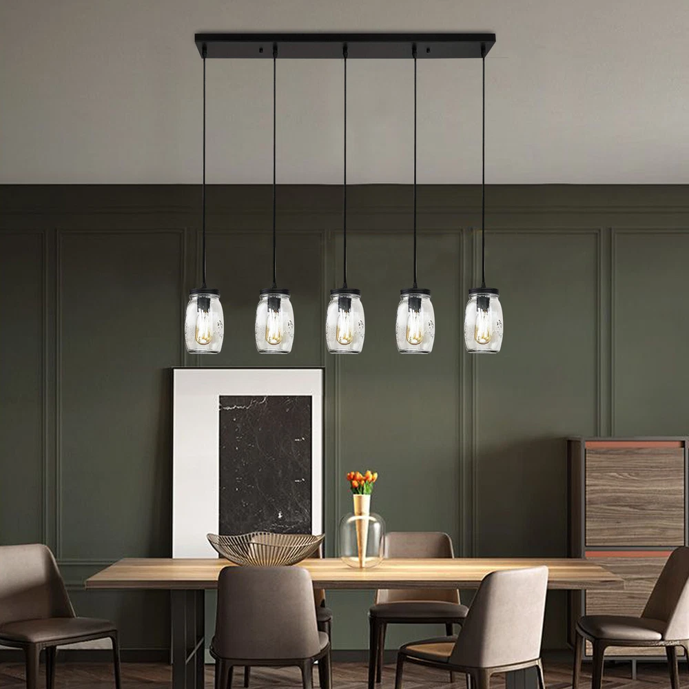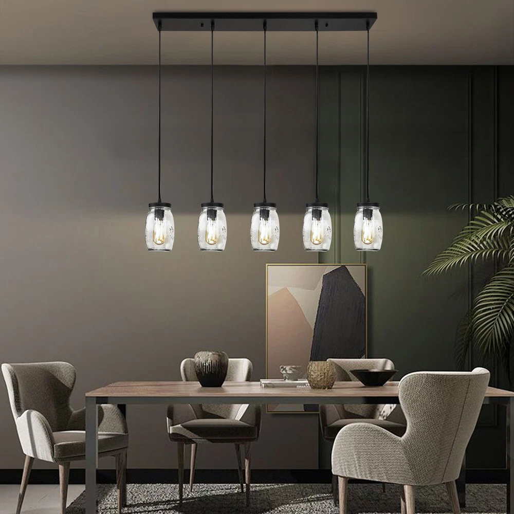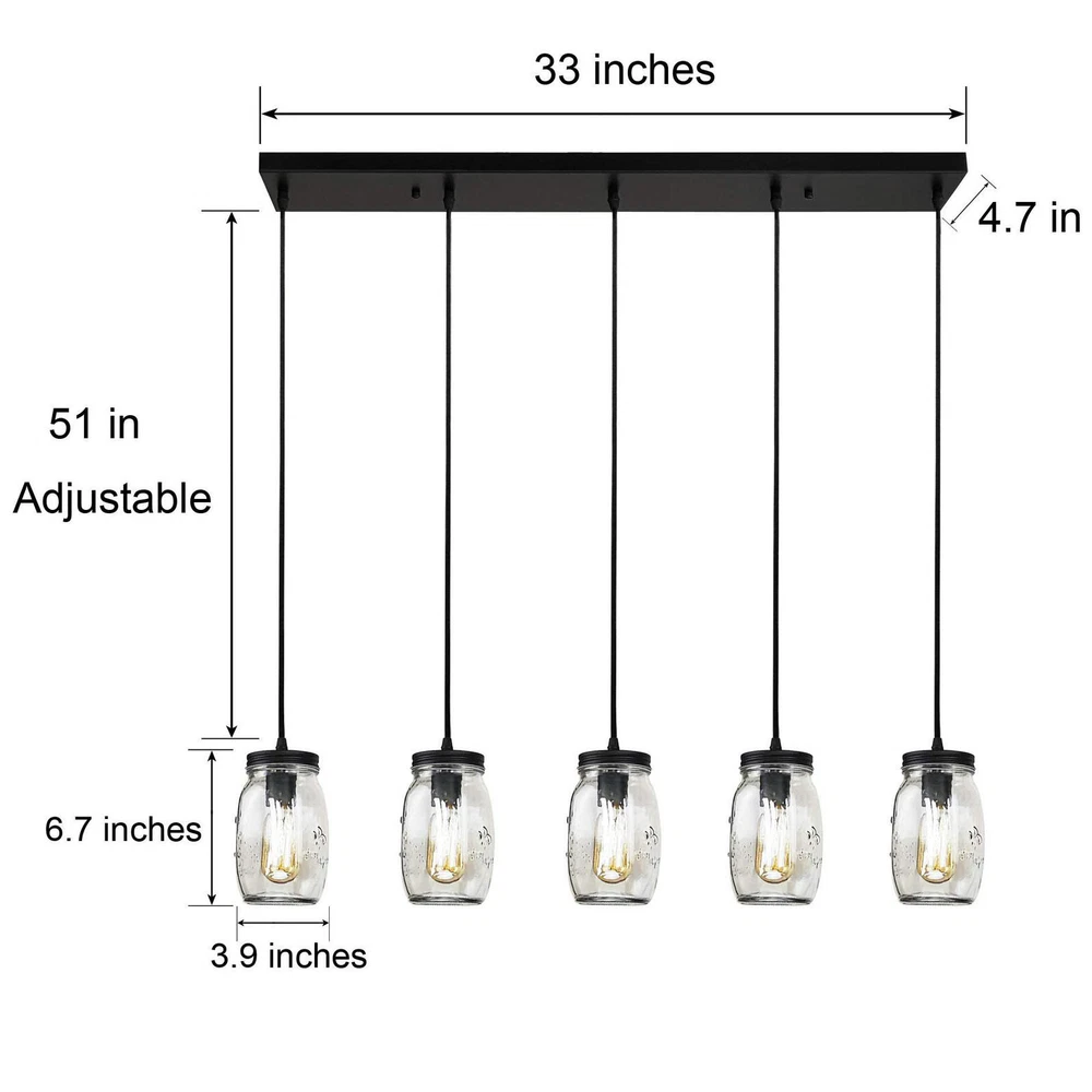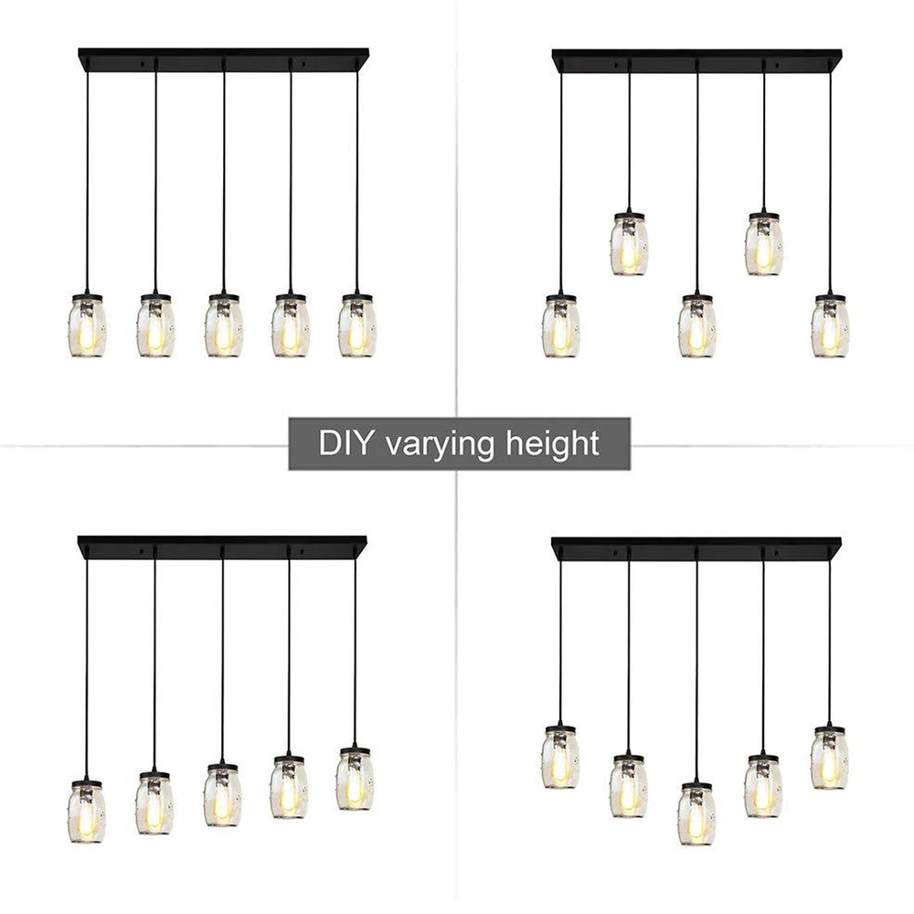 Description: 【Material & Dimensions】 - This glass mason jar light fixture was made of glass and metal. 【Bulb Types】 - The pendant lighting fits all E27 light bulbs like Edison light bulbs , LED light bulbs, energy-saving bulbs , incandescent bulbs. Max 40W per Bulb. (★The Bulbs are NOT Included) 【Easy to Install】 - The light fixture Includes all mounting hardware for quick and easy installation. Featuring a rectangle metal canopy which holds 5 mason jar bottle-inspired glass shades, attached by 5 height adjustable cords, this 5-light kitchen island lighting matches your space whether it is transitional, industrial, modern or farmhouse style! It is to fill your space with lights and joy! 5-Lights Modern Mason Jar Chandelier Glass Hanging Ceiling Lamp Adjustable NEW Description: 【Material & Dimensions】 - This glass mason jar light fixture was made of glass and metal. 【Bulb Types】 - The pendant lighting fits all E27 light bulbs like Edison light bulbs , LED light bulbs, energy-saving bulbs , incandescent bulbs. Max 40W per Bulb. (★The Bulbs are NOT Included) 【Easy to Install】 - The light fixture Includes all mounting hardware for quick and easy installation. Featuring a rectangle metal canopy which holds 5 mason jar bottle-inspired glass shades, attached by 5 height adjustable cords, this 5-light kitchen island lighting matches your space whether it is transitional, industrial, modern or farmhouse style! It is to fill your space with lights and joy! 【Wide Application】-The light clear quart-size glass jar shades for an eclectic look. this hanging lights is perfectly designed to illuminate your space whether for Kitchen, living room, dining room, hallway, office, foyer or any other place! 【Satisfaction】 - If you have a problem in the transaction, just let us know and we will work with you to resolve the issue. Material:Glass, Metal Number of Lights:5 Voltage:110 Volts Specific Uses:Indoor use only Shade Material:Glass Light Direction:Downlight Wattage:40 Watts Batteries Required?:No Type of Bulb: LED/CFL/Incandesce Package include 1 x ceiling light (★The Bulbs are NOT Included) Payment Delivery details Terms of sales About us Contact us Payment We accept ebay payment 。 Fees such as import duties, taxes are not included in the item price or shipping costs. These charges are the buyer's responsibility. Delivery details Shipping: 2-9 working days to: USA Terms of sales We maintain high standards of excellence and strive for hundred percent customer satisfaction. Feedback is very important to us. We hope that you contact us immediately before you give neutral or negative feedback, so that we can address your concerns. It is impossible to address issues if we do not know about them! About us Your satis faction is our ultimate goal. We work hard to earn your trust and future business. Our certified technicians have tested each item before shipping. The unit comes with 1 year limited warranty on all manufacturing defects. a) If you receive a defective item, you may return it or ask for a discount. Please contact us within 14 days after you receive the package. b) What you returned must be intact and in its original packaging as re? u. Customer is responsible for shipping costs of the returned item. c) We will cover the cost of shipping back t with the shipping rate indicated in the registration page. We will send you a new unit or refund the full payment you paid. Thank you. Contact us Business Hour Business Hour: Monday To Friday: 8:30 AM to 5:00 PM (Beijing China time) Due to time zones, our reply to your questions may not be immediately. But within above working time, we will reply your email within 24 hours. If it's non-workdays, please kindly be patient and wait till Monday. Please contact us with ebay message. Please feel free to contact us if you have any questions. Monday To Friday: 8:30 AM to 5:00 PM (Beijing China time) Due to time zones, our reply to your questions may not be immediately. But within above working time, we will reply your email within 24 hours. If it's non-workdays, please kindly be patient and wait till Monday. Please contact us with ebay message. Please feel free to contact us if you have any questions.