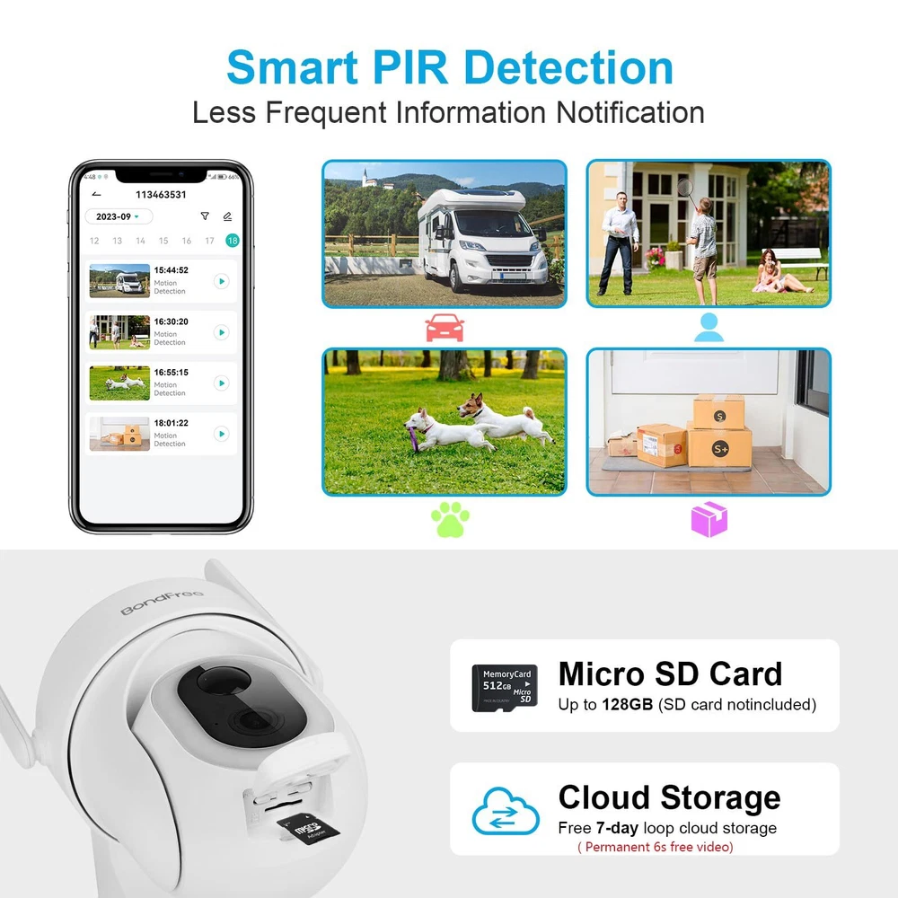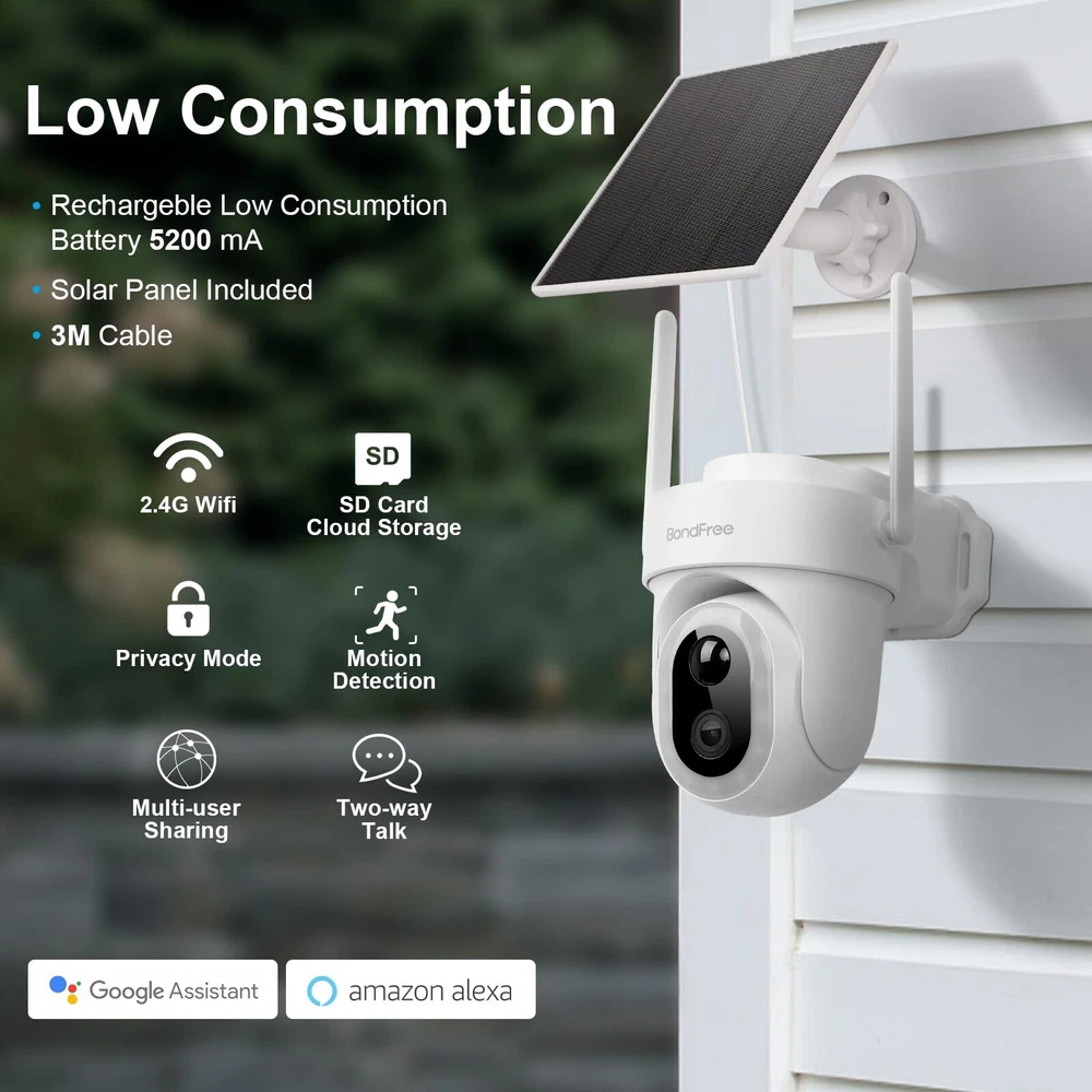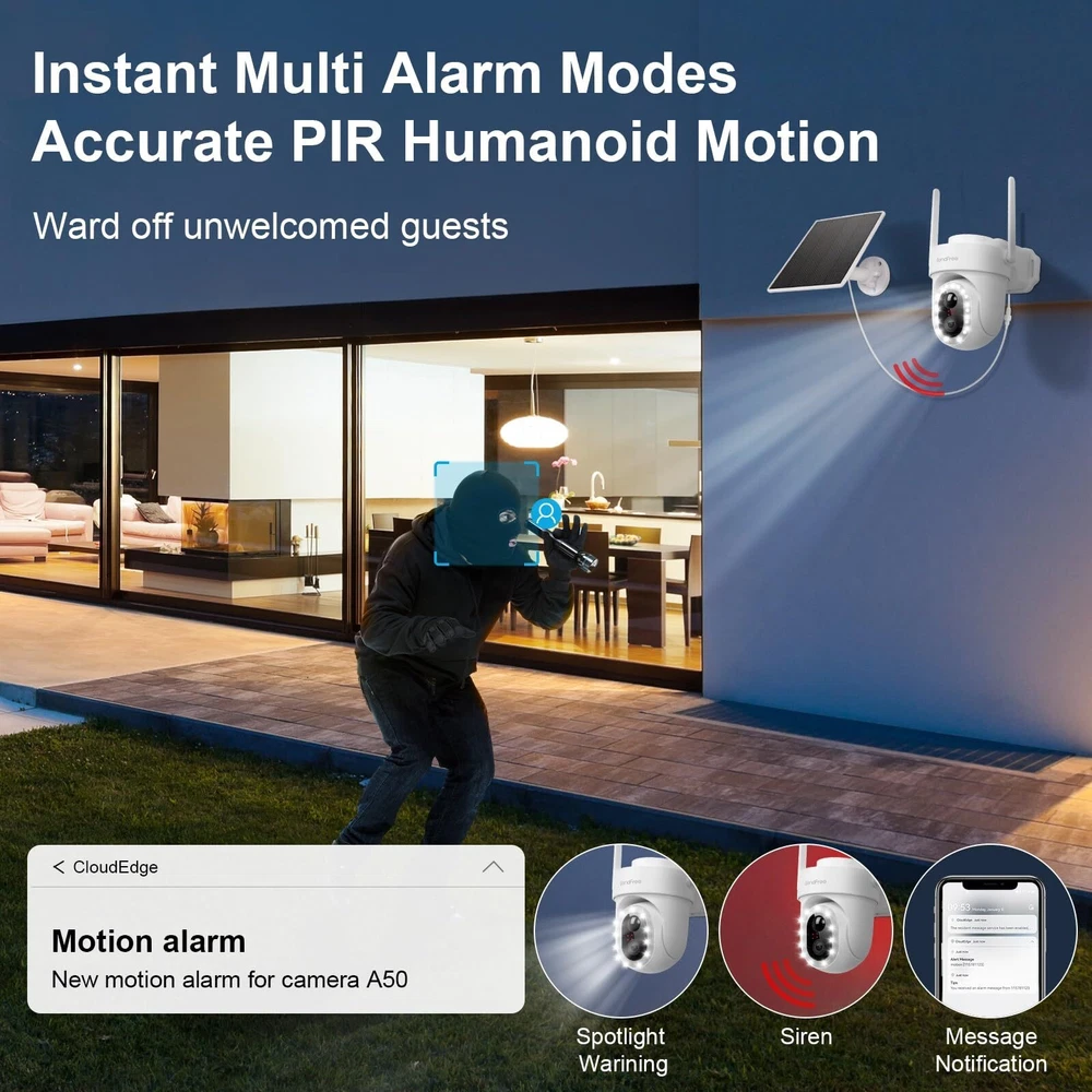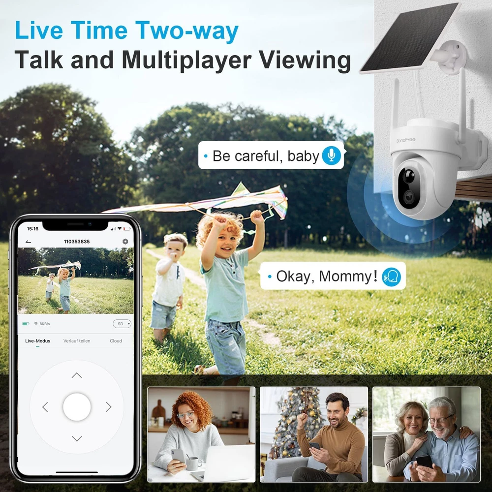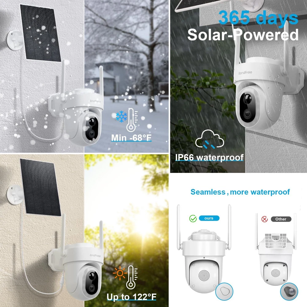 [5MP Ultra HD Night Vision] New upgrade 5 megapixel, provides 4K full HD. solar camera take a 355° horizontally and 90° vertically panoramic shooting and 4X digital zoom, make sure cover your target area without blind spots. 3 night vision modes (full color, black and white, smart) for to choose. Built-in CMOS sensor and 4 IR lights automatically sense ambient light and switch to color night vision mode, see clearer details and color images even in pitch dark up to 33ft! [IP66 Weatherproof ] Provide continuous power for security cameras wireless outdoor with low energy consumption and high conversion rate solar panel that can display real-time battery level. The outdoor solar camera can work in the temperature range of -68°F to 122°F, and IP65 Weatherproof. Enjoy 3-8 months of standby time solely on battery power, while the solar panel ensures uninterrupted 365-day protection. [Motion Detection & Real-time Alerts] With advanced PIR sensor, the outdoor wireless camera can detect human movement (when turned on, it will only alarm when a human passes by, and the sensitivity is adjustable in 5 levels), push a real-time alert notifications to your phone, trigger loud siren, spotlight or sound alarming to frighten away unwanted visitors. Customize alarm schedules, detection area, adjust sensitivity levels from 1 to 10 for higher accuracy and fewer false alerts. [Real Time Multiplayer Sharing] The home security camera supports multiple people watching real-time videos simultaneously and is equipped with a built-in microphone and speaker, allowing you to establish real-time conversations. Event recording to micro SD card up to 128GB(not included) and cloud storage (6s free playback with encrypted secure data). You can view what is happening and replay what has already happened anytime, anywhere. [After Sale Service]: The camera is compatible with Alexa and only supports 2.4GHz WiFi. There is no wiring hassle and it can be installed on walls and ceilings. We provide technical support. If you have any questions during use this security camera wireless, please feel free to contact us. Our friendly team will help you solve all problems as soon as possible.