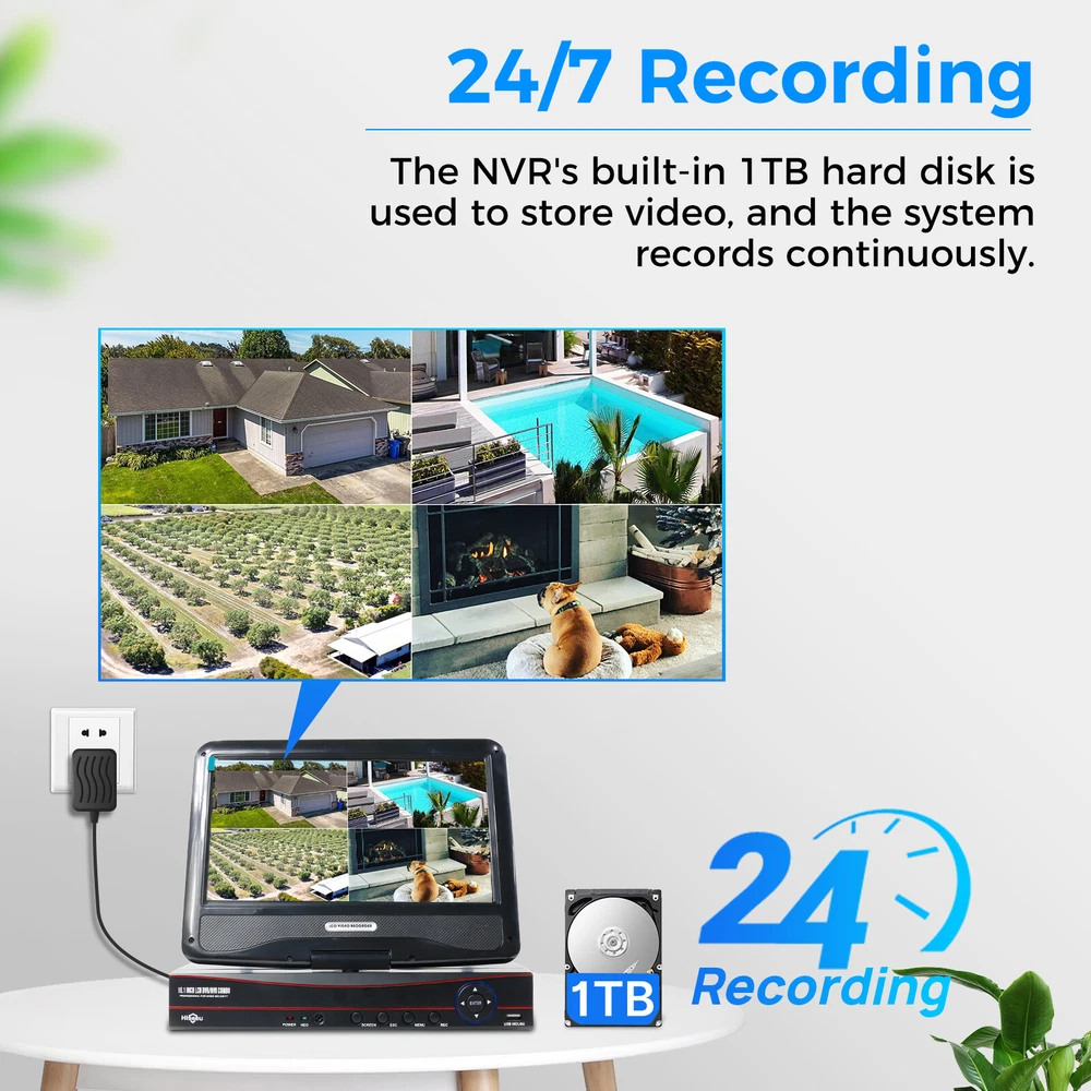 this item is used ,not brand new . 【10inch Monitor, Need Plug Power Supply】 【Expandable 10 Channel NVR】 【Waterproof& HD Video】 【Remotely Anytime and Anywhere】 【Dual WIFI NVR 】 【Preinstalled 1TB HDD & Cloud Storage】 About this item: Notice: 1.The wireless system doesn't mean you can use the system without any cables. Power supply still need to power on the cameras and NVR. 2.This product is a used item , if you are not satisfied with the used item, you can buy a brand new product in our store, please refer to this link: https://www.ebay.com/itm/405289664437 About this item 【10inch Monitor, Need Plug Power Supply】 Wireless video security system wireless CCTV camera system features a 10" full HD 4K monitor (Not Touch Screen) with built in NVR. It is easy to setup and DIY installation. True plug and play. The wireless cameras and NVR monitor are auto-paired during the factory setting. You just plug all the power supply and connect TV monitor to NVR with a VGA/HDMI Cable. (NOTE: They all need to plug in the power adapter) 【Expandable 10 Channel NVR】 This system includes 1x 10-channel 8MP (4096*2160) 10.1" LCD Monitor NVR and 4 x 5MP (2560*1920) wireless IP66 waterproof cameras. Connect the NVR and cameras with power adapter, cameras coming with 10ft cable power supply, it is more convenient to install. 【Waterproof& HD Video】 Records in 5MP Full HD to capture sharp and crisp images, provide crystal-clear HD live video, in order to crisp smooth footage day and night the bullet cameras build in 3 array IR cut filter with auto switch. Up to 15m Night Vision, The IP 66 weatherproof aluminum housing material to keep Indoors & Outdoors recording. 【Remotely Anytime and Anywhere】 Wireless surveillance camera system allows you to view the live video remotely anytime and anywhere by Phone and Pad (available for Android & IOS system). Download free APP “EseeCloud” from Android Google Play or Apple APP Store. Register a New Account, then add by device ID. You can view the Video by WiFi or 4G/5G Network. Supporting Windows and MAC OS system computer download Eseecloud software to remotely check. 【Dual WIFI NVR 】 Dual WIFI NVR support 2 ways to connect with network: connect with network by Ethernet cable or connect with 2.4Ghz/5Ghz WIFI network. 【Preinstalled 1TB HDD & Cloud Storage】 H.265+ compression will save the HDD storage, 4Pcs cameras can store 30 days 24/7 days time recording, also provide cloud storage on cellphone app, but it is not free to use, each channel need buy cloud storage one by one. Please Note: camera can be wirelessly connected to the network, but it must be powered by power supply. if you miss power adapter, please tell us to get a replacement one. Wireless Surveillance NVR Kit: This All-in-One 10 Channel 8MP 10.1" LCD Monitor NVR and 4 x 5MP wireless IP66 waterproof Camera. Cameras and NVR connect and set up in few minutes. There is no exposed lines anymore between camera with NVR box , more beautiful, more hidden, more safely. (Warm Note: all the cameras and NVR box need connect power supply) View the video on the mobile App from anytime and anywhere, remotely check the system on phone or computer, please connect the NVR with router by Ethernet cable or wireless connection. Strong anti-interference and 65ft night vision, 2560*1920 image sensor shows more clear and stunning picture and video. Supports multi-alarm triggered (Video Loss, Motion Detection) and alarm Sound, Email, Phone, etc). Suitable for home and small project which help you record, playback, and remote. Item Feature IP66 Weatherproof IP66 super waterproof grade and dustproof, durable outdoor weatherproof casing no matter windy or raining. Install the cameras outdoor or indoor, keep your home or business safe. Note:Power adapter is not waterproof. Day/Night Camera 5MP image sensor makes clear and stunning high-def video. All cameras are equipped with infrared night vision. They can capture clear footage up to 65ft away in pitch-black darkness. Motion Detection This motion-activated email alert function allows you to always stay connected to all the unexpected movements happened in your house. An alarming email will be sent to your inbox. Expandable 10 Channel System The camera system is one-way audio, you can add other wireless cameras from heseeu brand to the NVR. Additionalcamera models to suit your different scenarios. We currently have Bullet 2-Way Audio Cameras, Dome Cameras, PTZ Cameras, Battery/Solar Cameras, looking for a suitable extra camera, please check my shop or contact us. One-way Audio Function Built-in the microphone,so you could not only view the video,but also clearly hear the people on phone app or monitor. Notice:There is no speaker in the camera, so you can't make conversation with people. 24 hours 30 days Reliable Video Recording 1TB Hard Drive Pre-installed in the WiFi NVR enables 30 days video recording (up to 6TB supported) This system allows all cameras recording at the same time. Video Playback at Any Time Replay significant evidence or funny video records. Quick search for any event video. Playback any video on different days, hours, or minutes by controlling the timer axis under the split screen. True Plug and Play The easiest wireless NVR security camera system ever! Power on and all is done! It releases you from messy cablings.No configuration and no need to hire an installation company! A real plug and play security camera system! True Wireless WIFI Connection No ethernet cable is needed to link between the NVR and the router any more, true wireless wifi connection.Freely move the 3MP NVR close to camera, camera will receive stronger wifi signal. Motion Detection This motion-activated email alert function allows you to always stay connected to all the unexpected movements happened in your house. An alarming email will be sent to your inbox. 5MP Tells You Details This security system supports recording with 5MP at 15FPS, showing you som