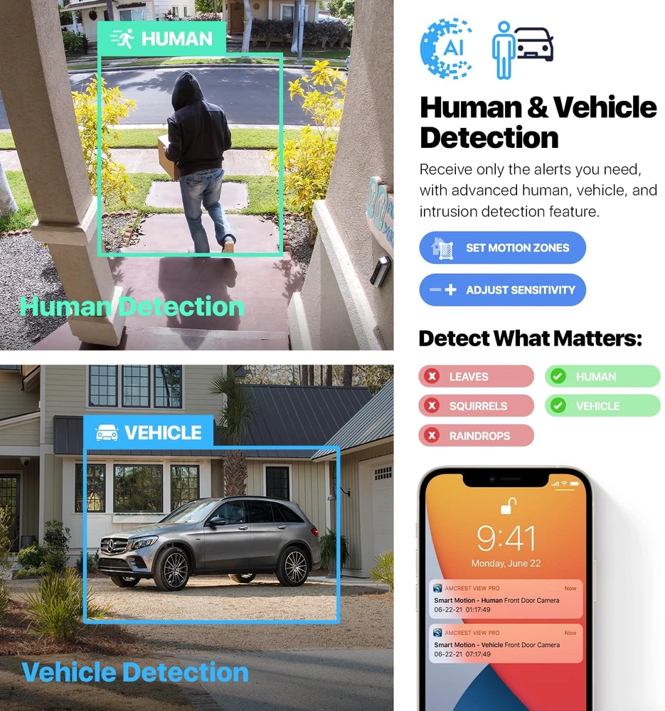 EXPERIENCE ULTRA HD – Stunning low-light 5MP performance with 1/2.7” image sensor and 5MP resolution (2592x1944). Super-wide 132° viewing angle allows you to cover more ground. Power Over Ethernet (POE camera) for easy installation (POE Injector or Switch Required; Not Included, Sold Separately). This is a FIXED IP camera and has ability to Pan/Tilt manually. SMARTER SECURITY & STORAGE OPTIONS – Receive motion alert notifications and review footage via your smartphone with the Amcrest View app. Playback and record professionally on a PC using the Amcrest Surveillance Pro software or third-party software such as Blue Iris. Works with Amcrest Cloud remote video storage, MicroSD Card (up to 256GB), Amcrest NVRs, QNAP NAS, FTP, Edge, Chrome, Mozilla Firefox & Safari. DAY OR NIGHT, RAIN OR SHINE – Built to weather any storm and the darkest of nights, this 5-Megapixel Dome PoE IP Camera features a heavy-duty metal weatherproof IP67 housing & IK10 Vandal Resistant Dome as well as built-in IR LEDs and a 1/2.7” progressive image sensor to achieve unsurpassed low-light capability and night-vision up to 98 feet. Dual H.265/H.246 compression allows for maximum encryption with the latest technology as well as backwards compatibility with legacy platforms. SECURE CLOUD VIDEO BACKUP – The optional Amcrest Cloud remote video storage subscription service allows you to automatically store your videos off-site in a third-party location hosted and secured by Amazon AWS. This way if something happens to your local PC/NVR/SDcard/NAS, the footage will be safely recorded in a secure off-site location and accessible to you through a web-based Flash interface for PC (Chrome/Firefox/Safari/Edge) and AmcrestCloud smartphone app. SIMPLE, RELIABLE, SECURE - At Amcrest, we want to ensure the safety of our customers, their loved ones, homes and businesses. You’ll receive a full 1-year US Warranty and Lifetime Support provided directly from Amcrest. Compatible with the following Amcrest Junction Boxes, ASIN: B0711CPL5Z, B071L2RDK2 & B07195BN8X Product Description 5MP UltraHD Resolution Experience magnificent 5MP UltraHD footage with the latest Starlight 1/2.8" CMOS image sensor and a 98.4° viewing angle. The Amcrest UltraHD camera soaks in the entire scene, dynamically painting all the vivid colors and rich imagery, pixel by pixel, onto your desktop or mobile device in 5MP UltraHD 2592x1944 resolution. Motion Detection Alerts Receive intelligent alerts that send notifications directly to your computer or smartphone via the Amcrest View Pro app anytime motion is detected. Create up to 4 motion detection zones and customize each zone's sensitivity to receive only the alerts that you need. Be notified anytime your smart home camera goes offline. Mobile Viewing & Storage View, record and playback UltraHD footage directly from your smartphone with the Amcrest View Pro or Amcrest Cloud app. Locally record HD footage directly to a 256GB MicroSD card (sold separately). Never worry about losing your footage with Amcrest Cloud optional Cloud storage plans. This product may contain components which are not NDAA compliant. IP67 Weatherproof The 5MP UltraHD PoE Indoor/Outdoor Camera is built to endure even the harshest weather conditions and protect against impacts. The camera is IK10 vandal-resistant and equipped with a heavy-duty IP67 weatherproof design to protect against dust, rain, hurricane level winds and is