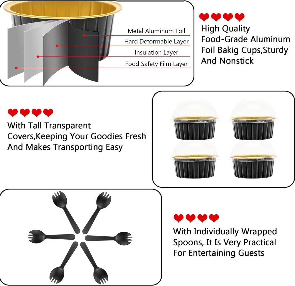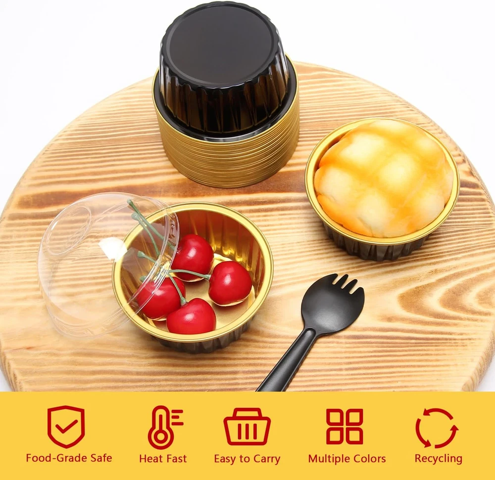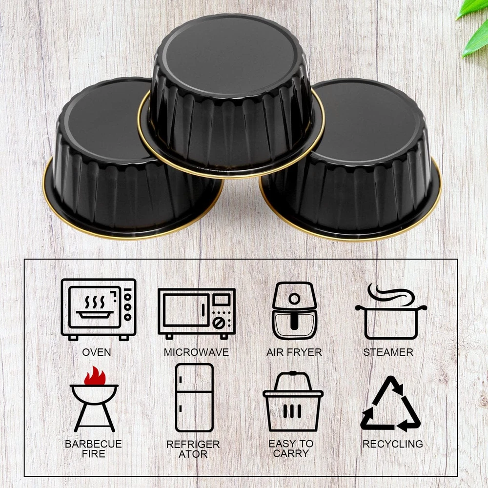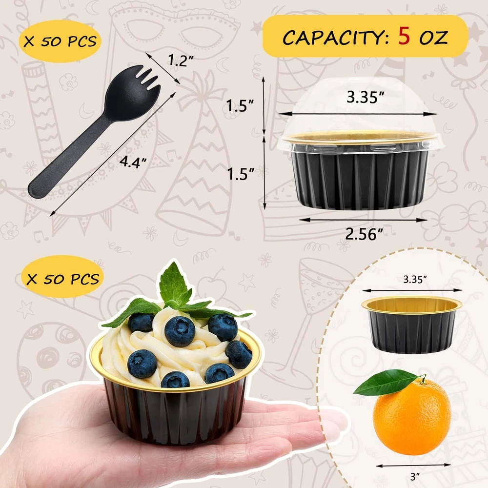 Store New Arrivals Add to Favorite View Feedback Contact Fast deliveries to the customer's home Quality customer service John Make the customers happy! 5Oz Foil Ramekins with Lids 50 Pack, Aluminum Foil Cupcake Liners Muffin Cups,Disposable Muffin Tins Jumbo Cupcake Baking Cups Muffin Pans for Custard Creme Brulee,With 50 Spoons-Black Description 【Pack of 50 Sets】 - Including 50pcs cupcake liners with 50 matching transparent dome lids,and 50 individually wrapped spoons.Sturdy muffin cups with lids, facilitate you to carry cupcakes muffin out with no need of cupcake holders. 【Mini Aluminum Foil Baking Tins】 - These jumbo muffin cups are made of food-grade aluminum foil that has excellent thermal conductivity, shortening baking time. They are oven, grill, air fryer and refrigerator safe and can withstand temperatures of up to 250℃/482℉.(NOTE:The clear lids are not heat resistant!) 【5oz Cupcake Baking Cups with Lids】 - These cupcake cups size: 3.3"D x 1.5"H;The matching clear dome lid height 1.5".The tall dome cover is more suitable for adding frosting to the baked cupcake. Ideal ramekins for cupcake,muffin,mini pie, small cake,souffle, pudding, mini cheesecake,creme Brulee,custard and much more. 【Easy To Use】 - This small baking tins is not easy to deform in the baking process,not only can be used as a small cupcake pan.Matching the top cover,but also a exquisite package container.without demudding and waste time washing the baking tray, you can enjoy baking more. 【Wide Usage 】- These cute mini pans with lids and spoons are great for home and outdoor usage such as birthday party, wedding,baby shower,thanksgiving,Christmas and Halloween,etc.holiday celebration,And picnic, camping and other leisure activities. Also ideal for restaurants, bakery, chef,and other catering venues. Product Description LNYZQUS Aluminum Foil Baking Pans With Lids Why Choose The Disposable Cupcake Pans? Excellent Thermal Conductivity These cupcake pans are made of thicken food-grade aluminum foil,not easy to deform.With excellent thermal conductivity,can shorten the baking time. Large Capacity Cupcake Cups Great cupcake tins for individual size portions and food containers.There are available in a variety of colors. 2 In 1 Design Not only baking cups, but also exquisite packaging box, enjoy baking without demoulding.With top lids for easy storage and transportation. With Individually Wrapped Spoons One-stop shopping & fully equipped, disposable sporks for entertaining guests, hygienic and convenient. Mini Cake Pans For Delicious Great baking pans for brownie,mini cake,bread,dessert flan,caramel pudding,charcoal-grilled cheese, barbecue,mini pizza,etc. Excellent Quality And Variety of Colors Available Cupcake Baking Cups For Home And Business Ideal baking tins for birthday party,wedding,graduation,Christmas,New Year,etc.holiday celebration;Excellent baking cups for picnic,camping,bakery,chef,etc. leisure and business venues. Various Baking Cups Are Available Add to Cart Add to Cart Add to Cart Add to Cart Add to Cart Add to Cart Add to Cart Customer Reviews 4.6 out of 5 stars 1,500 4.6 out of 5 stars 2,122 4.5 out of 5 stars 911 4.2 out of 5 stars 2,465 4.3 out of 5 stars 1,791 4.2 out of 5 stars 797 4.6 out of 5 stars 475 Price $13.99 $ 13 . 99 $17.89 $ 17 . 89 $19.99 $ 19 . 99 $16.49 $ 16 . 49 $9.99 $ 9 . 99 $18.49 $ 18 . 49 $18.99 $ 18 . 99 Capacity 5 oz 6.8 oz 10 oz 3.5 oz 5.5 oz 5.5 oz 5 oz Material Thicken Aluminum Foil Thicken Aluminum Foil Thicken Aluminum Foil Foil Paper Foil Paper Foil Paper Thicken Aluminum Foil Quantity 50 Pack 50 Pack 40 Pack 100 Pack 50 Pack 100 Pack 100 Pack The Cup Size 3.4x3.4x1.5 in 6.5x2.5x1.2 in 4.4x4.4x1.6 in 2.7x2.7x1.6 in 3.2x3.2x1.6 in 3.2x3.2x1.6 in 3.4x3.4x1.5 in With Lids ✔ ✔ ✔ ✔ ✔ ✔ ✔ No Cupcake Pan Needed ✔ ✔ ✔ ✔ ✔ ✔ ✔ With Spoons 50 pcs 50 pcs 50 pcs 50 pcs 50 pcs 100 pcs 100 pcs Reusability Disposable Item dimensions L x W x H 3.35 x 3.35 x 1.5 inches Capacity 125 Milliliters Item Dimensions 3.35 x 3.35 x 1.5 inches Color Black Material Aluminum, Plastic Material Type Aluminum, Plastic Material Features Disposable Shape Round Occasion Easter, Wedding, Christmas, Picnic, Thanksgiving ABOUT US We offer the best prices around on high quality products. Our E-store includes media such as books, movies, music and games while offering electronics, toys, sporting apparel, clothing, tools, general home, garden items and more. SHIPPING We are always working hard to ensure your package arrives as soon as possible. Please understand that some factors like weather, high postal traffic, and the performance of shipping companies are outside of our control. We offer free shipping to the lower 48 states and ship within 2 business days of payment, usually sooner. We do not accept P.O. Boxes. Please provide a physical address. For shipping outside of the continental USA, we only use eBay's Global Shipping Program. The item is shipped to KY and then sent to the rest of the world. International customers are responsible for all duties and taxes. Continue to 'check out' to calculate costs for shipping the item to your country. Messages regarding eBay's Global Shipping Program MUST be directed at eBay EXCLUSIVELY. RETURNS We offer a 30-Day Return Policy on items in which you are not completely satisfied with. You have the option of a full-refund or an exchange of the item. No returns are available on items shipped outside of the USA PAYMENT We accept PayPal. CONTACT US This page content is yet to come Please ad us to your favorite seller and visit again later Thank You CUSTOMER SATISFACTION We try our very best to make sure every customer is completely satisfied. If there's a problem, message us! We're happy to help. WE ACCEPT