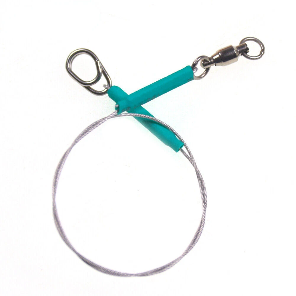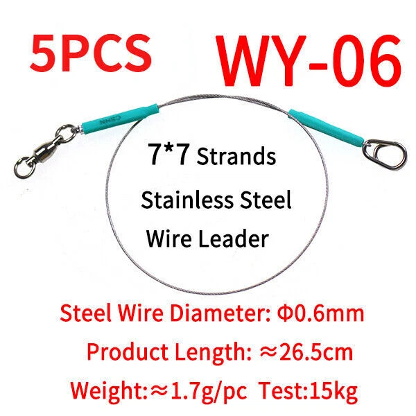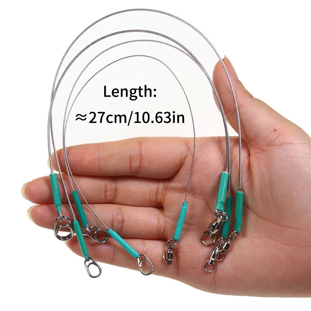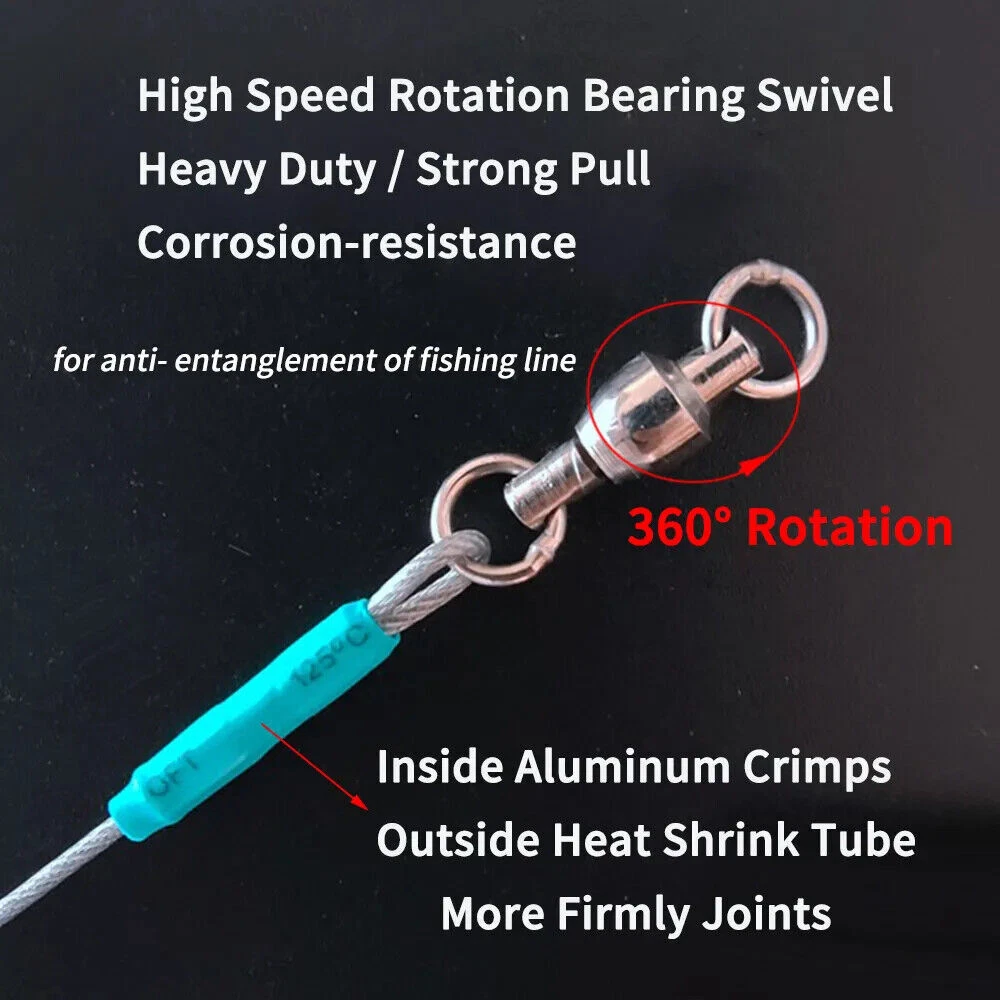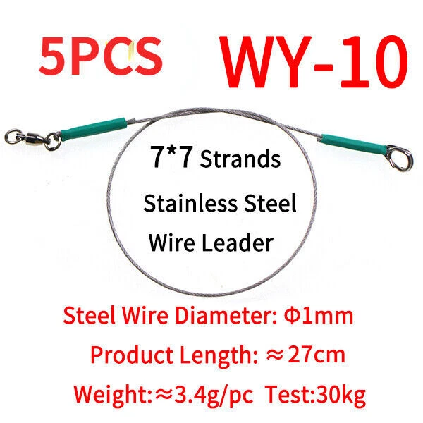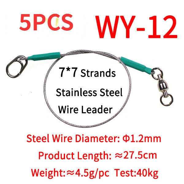 Specification: Fishing line: 7*7 strands stainless steel core leader Bearing swivels: copper alloy + stainless steel, 2# -5# Oval split ring clip: stainless steel,1# -4# 4 Sizes WY-06: φ0.6mm wire Length: ≈26.5cm/10.43in, Pulling Force: 15kg WY-08: φ0.8mm wire,Length: ≈26.5cm/10.43in, Pulling Force: 20kg WY-10: φ1.0mm wire,Length: ≈27cm/1163in, Pulling Force: 30kg WY-12: φ1.2mm wire,Length: ≈27.5cm/10.83in, Pulling Force: 40kg Packing: 5 pcs leash in one bag Feature: 1. 7*7 strands nylon coated steel wire core,soft and flexible,high strength,wear-resistance 2. 360° Rotation bearing swivel,strong tension,high speed rotation for anti- entanglement of fishing line 3. Stainless steel oval shape split ring clip for quick change 4. Inside aluminum crimps,outside heat shrink tube,more firmly joints 5. Great for saltwater fishing sharp-toothed predators 6.Can be attached to the hook to prevent the fishing line from being bitten by the fish