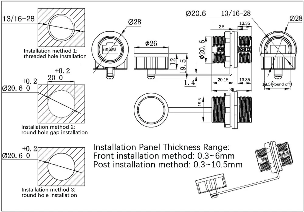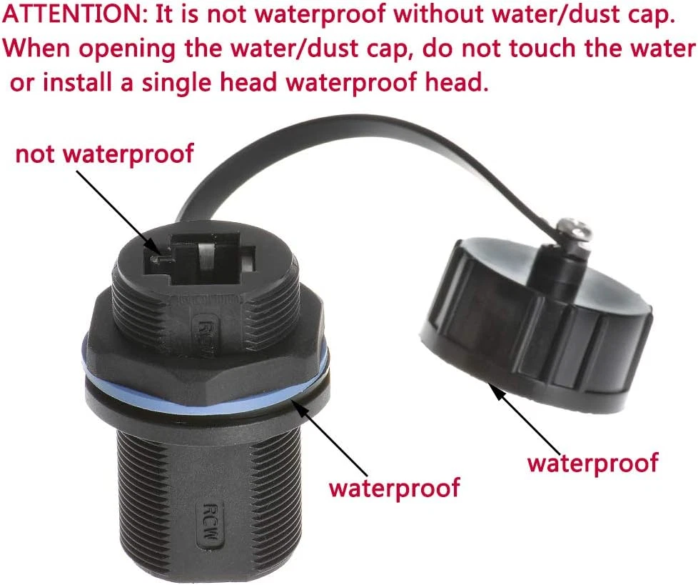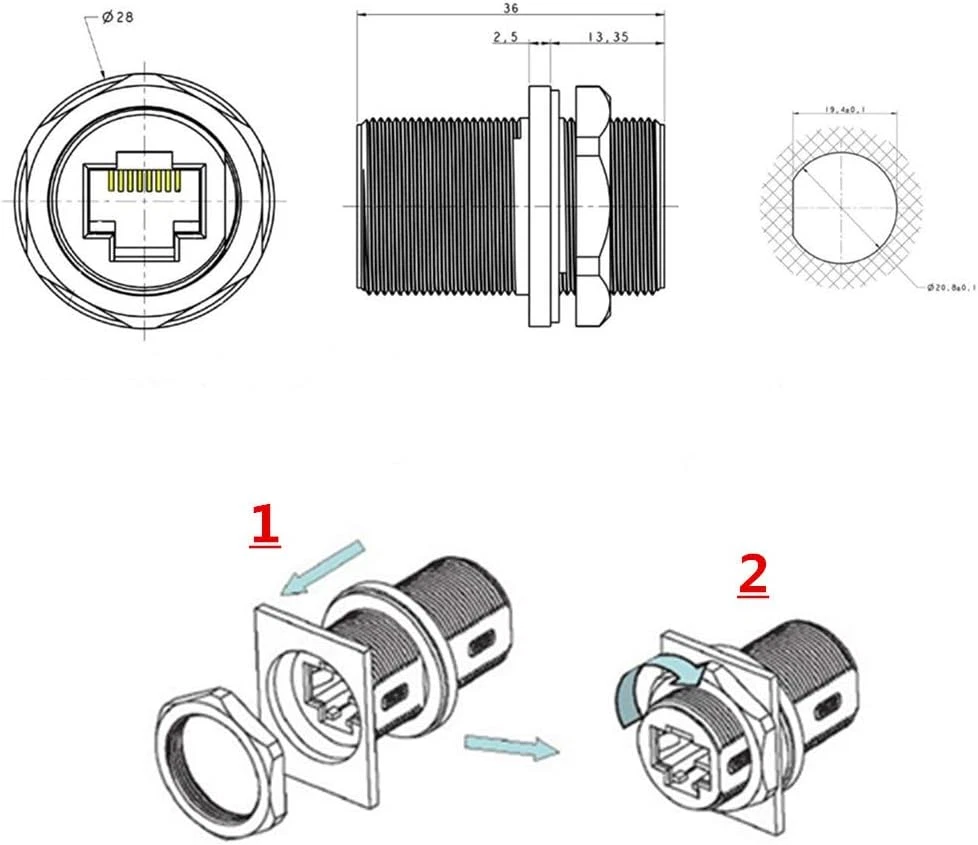 Shielded RJ45 female to female field installable connector. Provides feed-through Cat5/5e/6 ethernet connectivity for data and PoE in industrial environments. NO ATTENUATION:The socket contacts are nickel-plated phosphor bronze alloy plugs, and the socket does not need to break or interrupt any connection, so there is no signal attenuation. EASY INSTALLATION:No soldering, no installation tools, just plug the standard crystal head directly for quick installation. WATERPROOF:The shielded industrial panel mount bulkhead includes a water/dust cap that meets IP67 Water Protection. It is not waterproof Without water/dust cap. Product Description Stable Connection High Speed Transmission The Shielded Industrial Panel Mount is a Waterproof Ethernet LAN Cable Connector. Using the standards based RJ45 connection system insures compatibility with existing hardware. The shielded coupler maintains the shield continuity offering protection from EMI/RFI interference. Compatible with Cat6/Cat5E/Cat5 ethernet cable, Transmission speed up to 1000 Mbps. It is injection molded from PA66 nylon material, flame retardant, UV resistant, anti-aging, and has a longer service life. Specifications Pins 8P8C Connection Type RJ45 Transmission Category CAT6 Transfer Sspeed 10BASE-T、100 BASE-T、1000 BASE-T、10000BASE-T Rated Current 1.5A Rated Voltage 125VAC, 75VDC Insulation Resistance greater than 500MΩ Withstand Voltage(AC.V)1min 1000V Durability more than 500 mating&unmating cycles Shell Material nylon PA66 Socket Contact Pin Material phosphor copper C5210 Contact Pin Plating 6FU gold Waterproof Rubber Ring silicone Working Temperature -40℃~120℃ Relative Humidity less than 90% Flame Retardant Rating UL94V-0 Installation Method STEP1 Disassemble the connector and prepare the network cable STEP2 Put the female seat into the mounting hole and put on the waterproof cover rubber ring STEP3 Put on the nut and tighten STEP4 Insert the crystal head in the equipment chassis and the network cable outside the chassis. The installation is complete APPLICATIONS