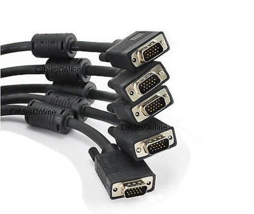 5-Pack Premium 1ft Male to Male HD15 Super VGA Monitor Cable w/ Ferrite Core This cable connects a SVGA source (such as a PC or Laptop) to a SVGA display (such as a LCD monitor, projector, etc). Specifications: (2) 15-pin HD male connection Fully shielded with ferrite cores to reduce EMI interference for improved video transmission Molded PVC boot with strain relief Nickel plated 28 AWG conductors Length End to End: 1ft Shielding: Foil and Braided Color: Black Mini-coax (RGB) and paired video wire Package Contents: (5) SVGA Monitor Cable CablesOnline Part Number: SV-001-5