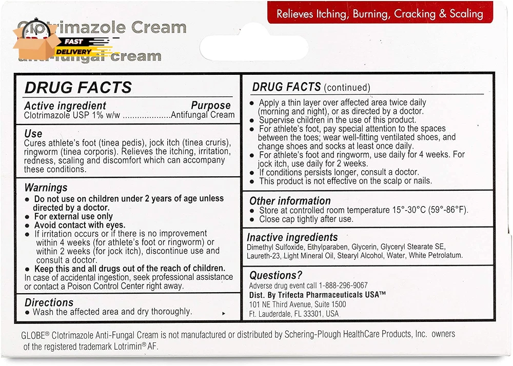 Store New Arrivals Add to Favorite View Feedback Contact (5 Pack) Clotrimazole Antifungal Cream 1% (1 Oz) Relieves the Itching, Bu Description Item model number 401005-FBA Item dimensions L x W x H 5 x 1 x 5 inches Product Dimensions 5 x 1 x 5 inches; 1 ounces Product Benefits Anti-Fungal,Itch Control,Burn Relief,Crack Relief,Scale Relief,Ringworm,Jock Itch,Athlete's Foot Item Weight 0.06 Pounds Special Feature Clinically Proven EFFECTIVE TREATMENT: Combat athletes foot, jock itch, and ringworm with our clotrimazole antifungal cream. This proven formula effectively treats common fungal infections, making it a trusted solution for relief and recovery. RELIEVING FORMULA: Experience fast relief from itching, burning, cracking, and scaling with our antifungal cream for skin. Compare it to the Leading Name Brand, and enjoy the soothing power of clotrimazole 1% for effective healing. FRESH PRODUCT GUARANTEE: Receive a pharmacist-recommended, fresh clotrimazole antifungal cream every time you order. Trusted in the U.S., this fungal cream for skin is a go-to for treating foot fungus and jock itch effectively. PROVEN TO CURE: Globe clotrimazole cream delivers proven results against tinea cruris and tinea corporis. This powerful anti-fungal cream for skin offers a reliable solution for curing jock itch, ringworm, and other stubborn fungal infections. VERSATILE ANTIFUNGAL SOLUTION: Designed for a wide range of fungal infections, our clotrimazole antifungal cream 1% is ideal for treating athlete’s foot, jock itch, and ringworm. This anti fungal cream for skin delivers fast, effective relief for feet, body, and more. QUALITY: Manufactured in accordance with the highest pharmaceutical manufacturing processes and contains a NDC for 100% confidence. Trifecta Pharmaceuticals USA is located in Fort Lauderdale, Florida. All Globe Health Products are Manufactured at Audited Facilities. Product Description ABOUT US We offer the best prices around on high quality products. Our E-store includes media such as books, movies, music and games while offering electronics, toys, sporting apparel, clothing, tools, general home, garden items and more. SHIPPING We are always working hard to ensure your package arrives as soon as possible. Please understand that some factors like weather, high postal traffic, and the performance of shipping companies are outside of our control. We offer free shipping to the lower 48 states and ship within 2 business days of payment, usually sooner. We do not accept P.O. Boxes. Please provide a physical address. For shipping outside of the continental USA, we only use eBay's Global Shipping Program.The item is shipped to KY and then sent to the rest of the world. International customers are responsible for all duties and taxes. Continue to check out in order to calculate costs for shipping the item to your country. Messages regarding eBay's Global Shipping Program MUST be directed at eBay EXCLUSIVELY. RETURNS We offer a 30-Day Return Policy on items which you are not completely satisfied with. You have the option for a full-refund or an exchange of the item. No returns are available on items shipped outside of the USA. PAYMENT We accept PayPal. CONTACT US This page content is yet to come Please ad us to your favorite seller and visit again later Thank You CUSTOMER SATISFACTION We try our very best to make sure every customer is completely satisfied. If there's a problem, message us! We're happy to help. WE ACCEPT Copyright © 2021 AutoDS. | All Rights Reserved