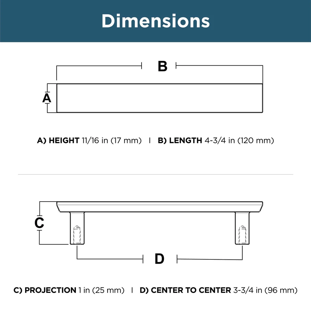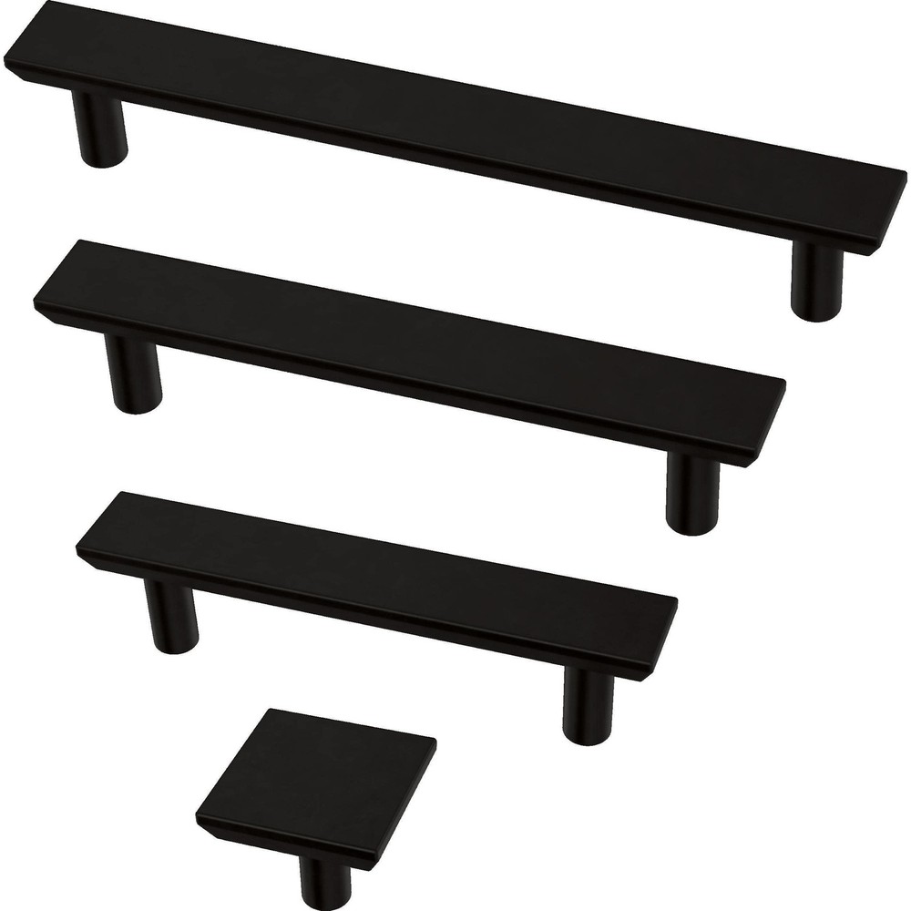 The Simple Chamfered cabinet pull collection makes it easy to give an updated look to your kitchen, bathroom, office, or furniture. The Modern cabinet handle design makes it the perfect addition to your cabinets, desk, and even dresser drawers. Available in multiple finishes and pack sizes to fit any home decor project and cabinet hardware style. STYLE: Easily update your kitchen and bathroom cabinets or furniture with our modern cabinet hardware collection. MATERIAL: Our black finish provides a complimentary tone to the metal handles. SIZING: The collection of drawer pulls measures 3.75 (96mm) center-to-center and comes in a pack of 5. DURABLE: We work with highly durable materials to ensure your cabinets and drawers are equipped with top quality hardware that will last for years. EASE OF USE: Our simple chamfered cabinet drawer handles are specially designed for easy installation and use.