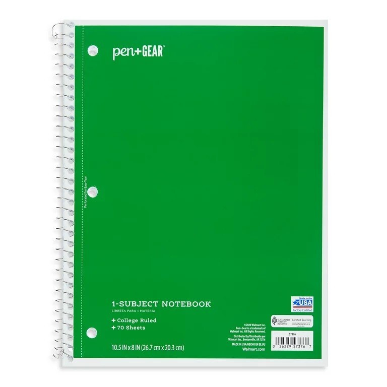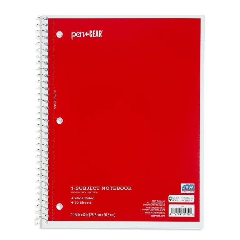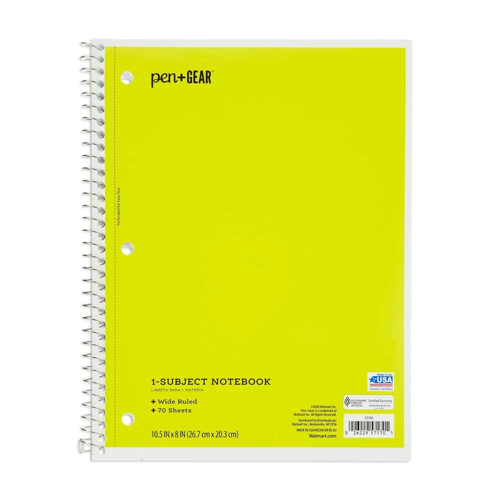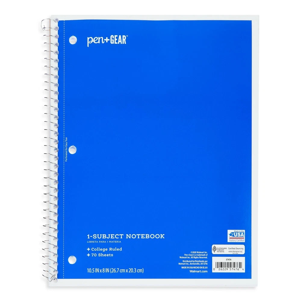 Back to School Wide Ruled 1 Subject Spiral Notebook 70 Sheets 10.5 inch x 8 inch (Pack Of 5) The Pen+Gear Wide Rule 1-Subject Notebook is a must-have item at school, at work, or at home. This spiral-bound notebook is 10.5 inches by eight inches, making it just the right size for most backpacks, bookbags, and totes. The Pen+Gear 1-Subject Notebook has durable front and back covers that are flexible enough to lie flat when taking notes in class or making that to-do list. The covers help protect your homework or other missives from tears and wetness. With 70 college-ruled sheets of paper, you will be set for scholastic success. Choose from a variety of colors for every school subject and pair with other Pen+Gear accessories like our black ballpoint pens to make sure you're ready to ace your classes. The Pen+Gear College Rule 1-Subject Notebook is a great and versatile notetaking option. Spiral-bound notebook Wide ruled 70 pages Durable front and back covers Flexible enough to lie flat while writing 8" x 10.5" Available in a variety of cover colors Front cover may vary Track Page Views With Auctiva's Counter