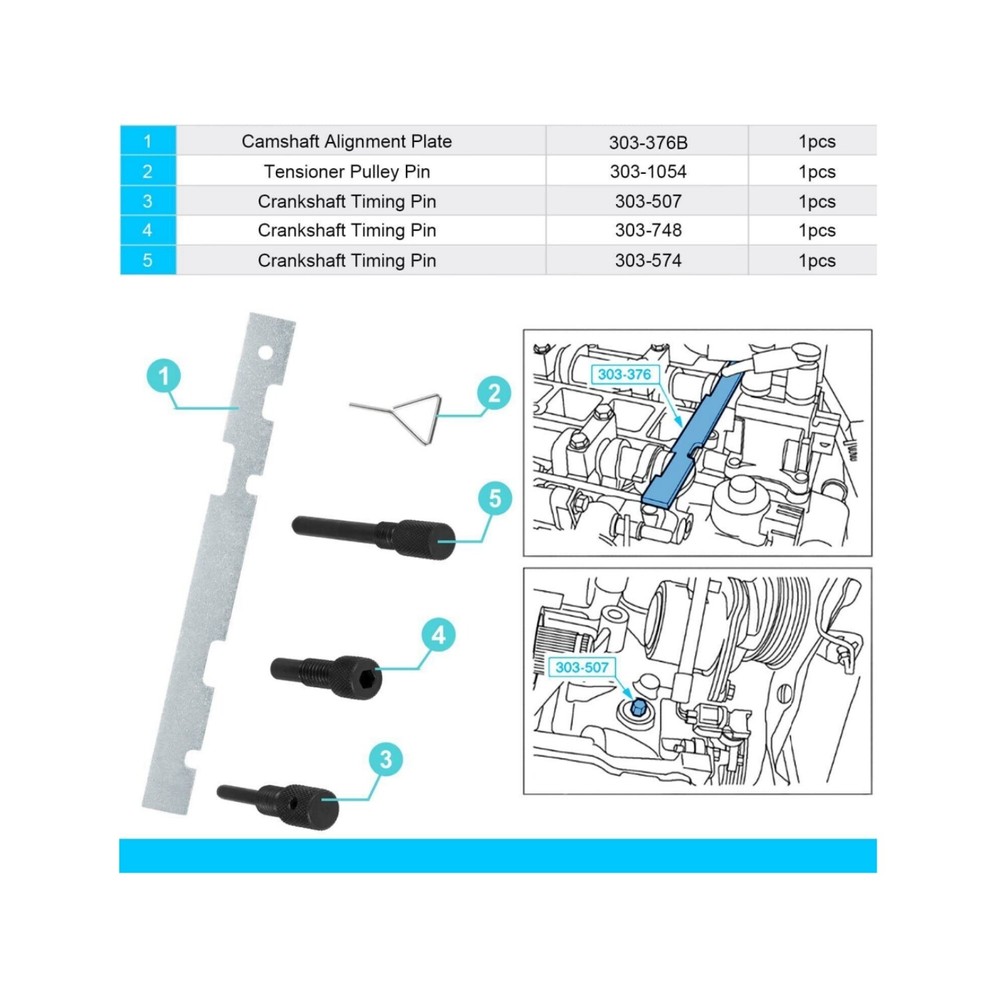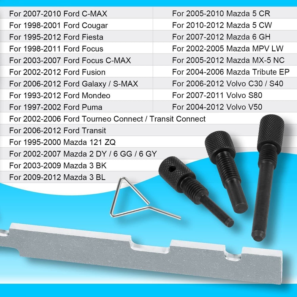 " FITMENT: Fit for Ford: C-MAX (07-10), Cougar (98-01), Fiesta (95-12), Focus (98-11), Focus C-MAX (03-07), Fusion (02-12), Galaxy (06-12), Mondeo (93-12), Puma (97-02), Tourneo Connect (02-06), Transit (06-12), Transit Connect (02-06) Mazda: 121 ZQ (95-00), 2 DY (02-07), 3 BK (03-09), 3 BL (09-12), 5 CR (05-10), 5 CW (10-12), 6 GG/GY (02-07), 6 GH (07-12), MPV LW (02-05), MX-5 NC (05-12), Tribute EP (04-06) Fit for Volvo: C30 (06-12), S40 (06-12), S80 (07-11), V50 (04-12). APPLICATION:Setting alignment tools fit for many car models of Mazda,Ford,Volvo, also works on All HWDA, HWDB, and HXDA Engines. FUNCTION:Camshaft timing tool is required for locking and setting camshafts, crankshafts and injection pump sprockets when replacing timing belts.This engine camshaft timing kit is designed to lock the camshaft during timing belt replacement over the complete range of Ford Duratec engines in both belt & chain drive variants. MATERIAL:Made of hight quality aluminum & steel. Anti-corrosion. Durable and Reliable Our Engine Camshaft Timing Kit Includes a Setting Gauge and 3 Different Locking Pins. Compatible with: FORD: Fiesta (95-12) Focus (98-11) Fusion (02-12) Galaxy (06-12) Mondeo (93-12) C-MAX (07-10) S-MAX (06-12) Cougar (98-01) Focus C-MAX (03-07) Puma (97-02) Tourneo Connect (02-06) Transit (06-12) Transit Connect (02-06) Mazda: 121 ZQ (95-00), 2 DY (02-07), 3 BK (03-09), 3 BL (09-12), 5 CR (05-10), 5 CW (10-12), 6 GG/GY (02-07), 6 GH (07-12), MPV LW (02-05), MX-5 NC (05-12), Tribute EP (04-06) Volvo: C30 (06-12), S40 (06-12), S80 (07-11), V50 (04-12). OEM Tools:: 21 162B/303 376, 21 210/303 507, 21 163/303 620, 303 748. Package Includes: 1 x Cam Timing Alignment Tool Kit "
