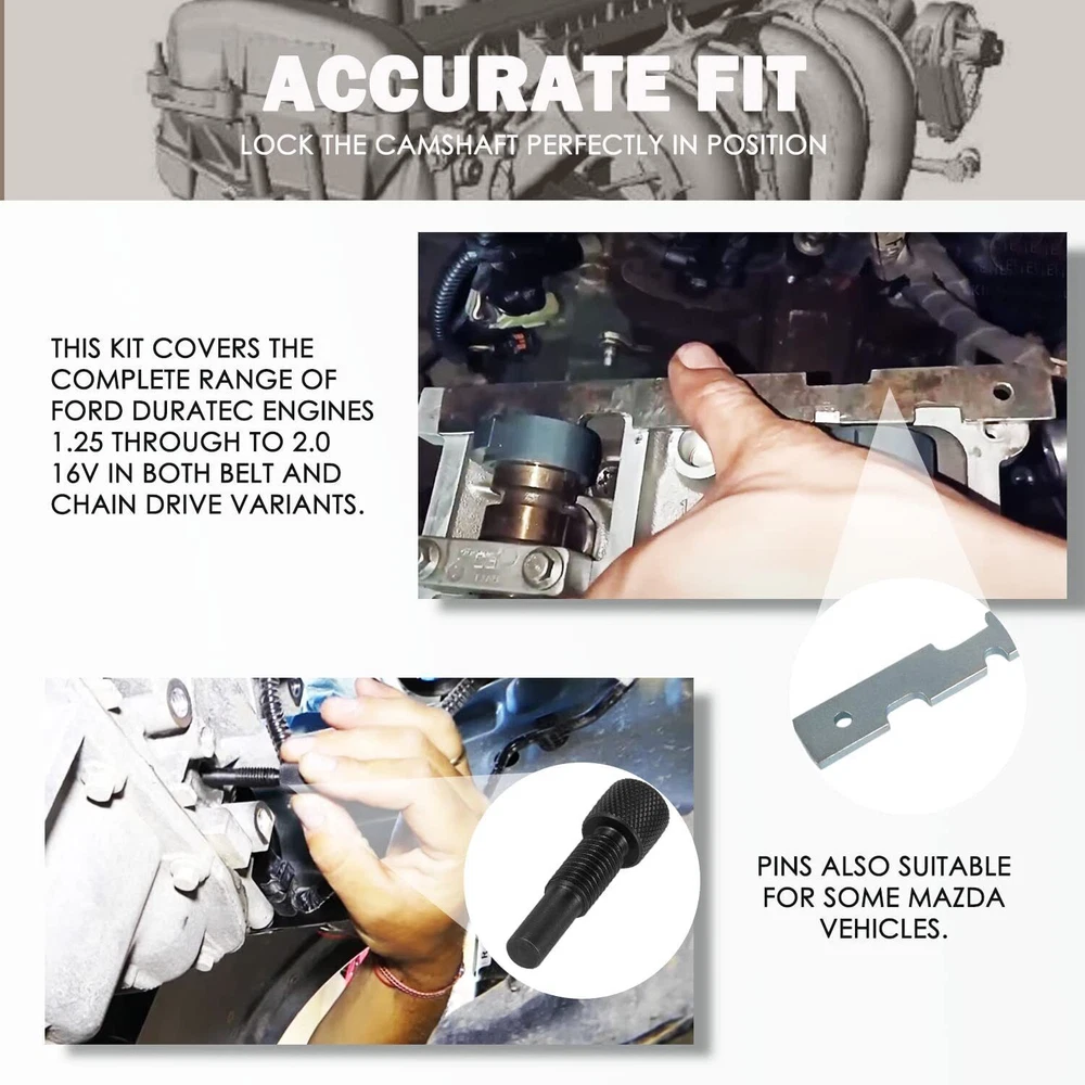 1. This cam timing alignment tool kit is a must-have for DIY mechanics working on Ford, Mazda, or Volvo engines! The precision fit makes timing belt replacements a breeze, saving time and frustration. High-quality materials ensure durability, and the wide compatibility covers multiple models. Perfect for smooth, accurate alignments—no more guessing or struggling. A game-changer for home garage repairs!