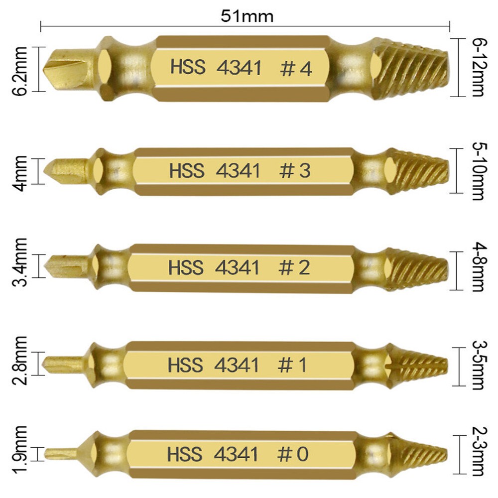 5Pcs Damaged Screw Extractor Speed Out Drill Bits Tool Set Broken Bolt Remover Feature: Extractor kit, meets the needs of different screws and bolt sizes. Quickly extract the rusty, broken screws. High strength and hardness. Easy to use. Durable and practical. Specification: Material: HSS 4341# 0#: Remove Diameter 2~3mm 1#: Remove Diameter 3~5mm 2#: Remove Diameter 4~8mm 3#: Remove Diameter 5~10mm 4#: Remove Diameter 6~12mm Package included: 5pcs x Damaged Screw Extractor Set Note: (1)Conversion:1inch=2.54cm, 1cm=0.393inches (2) All pictures are professionally colored, but due to the different ambient light and different display device settings,there may be some deviations between the pictures you see and the items themselves. Please understand. (3) The data is measured manually, and there may be some deviation, but it does not affect the use.