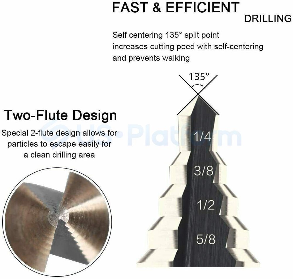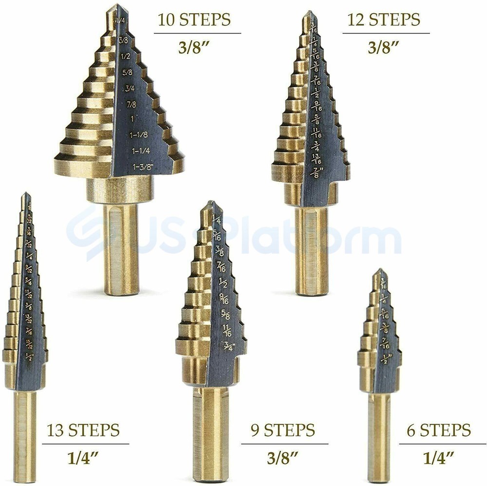 Product Description HSS 6PCS Titanium Step Drill Bit Set W Automatic Center Punch High Speed Steel Description This is the New HSS Steel Large Step Cone Drill Titanium Bit Set Hole Cutter, which is made from high quality HSS steel, and with the Titanium coated to reduce friction and heat. It is very suitable for using to cut holes in a variety of materials including steel, brass, wood, plastic, etc. Features - Color: As the picture shown. - Material: High Speed Steel with Cobalt Coated. - This set replaces 50 individual drill sets. - Made by Long life high speed steel. - Self starting - no need for a pilot hole. - Cobalt coated to reduce friction and run cooler. - Automatically deburrs holes as you drill. - Includes protective padded aluminum case. Specifications - 1/4'' to 1 3/8'' Drill Bit: 10 Steps (1/4'', 3/8”, 1/2'', 5/8'', 3/4'', 7/8'', 1'', 1 1/8'', 1 1/4'', 1 3/8''). - 3/16'' to 7/8'' Drill Bit: 12 Steps (3/16'', 1/4'', 5/16'', 3/8'', 7/16'', 1/2'', 9/16'', 5/8'', 11/16'', 3/4'', 13/16'', 7/8''). - 1/4'' to 3/4'' Drill Bit: 9 Steps (1/4'', 5/16'', 3/8'', 7/16'', 1/2'', 9/16'', 5/8'', 11/16'', 3/4''). - 1/8'' to 1/2'' Drill Bit: 13 Steps (1/8'', 5/32'', 3/16'', 7/32'', 1/4'', 9/32'', 5/16'', 11/32'', 3/8'', 13/32'', 7/16'', 15/32'', 1/2''). - 3/16'' to 1/2'' Drill Bit: 6 Steps (3/16'', 1/4'', 5/16'', 3/8'', 7/16'', 1/2''). Package includes 5 x Drill Bits 1 x Aluminum Case Product Highlights This set replaces 50 individual drill sets. |Made by Long life high speed steel. |Self starting - no need for a pilot hole. |Cobalt coated to reduce friction and run cooler. |Automatically deburrs holes as you drill. |Includes protective padded aluminum case. powered by