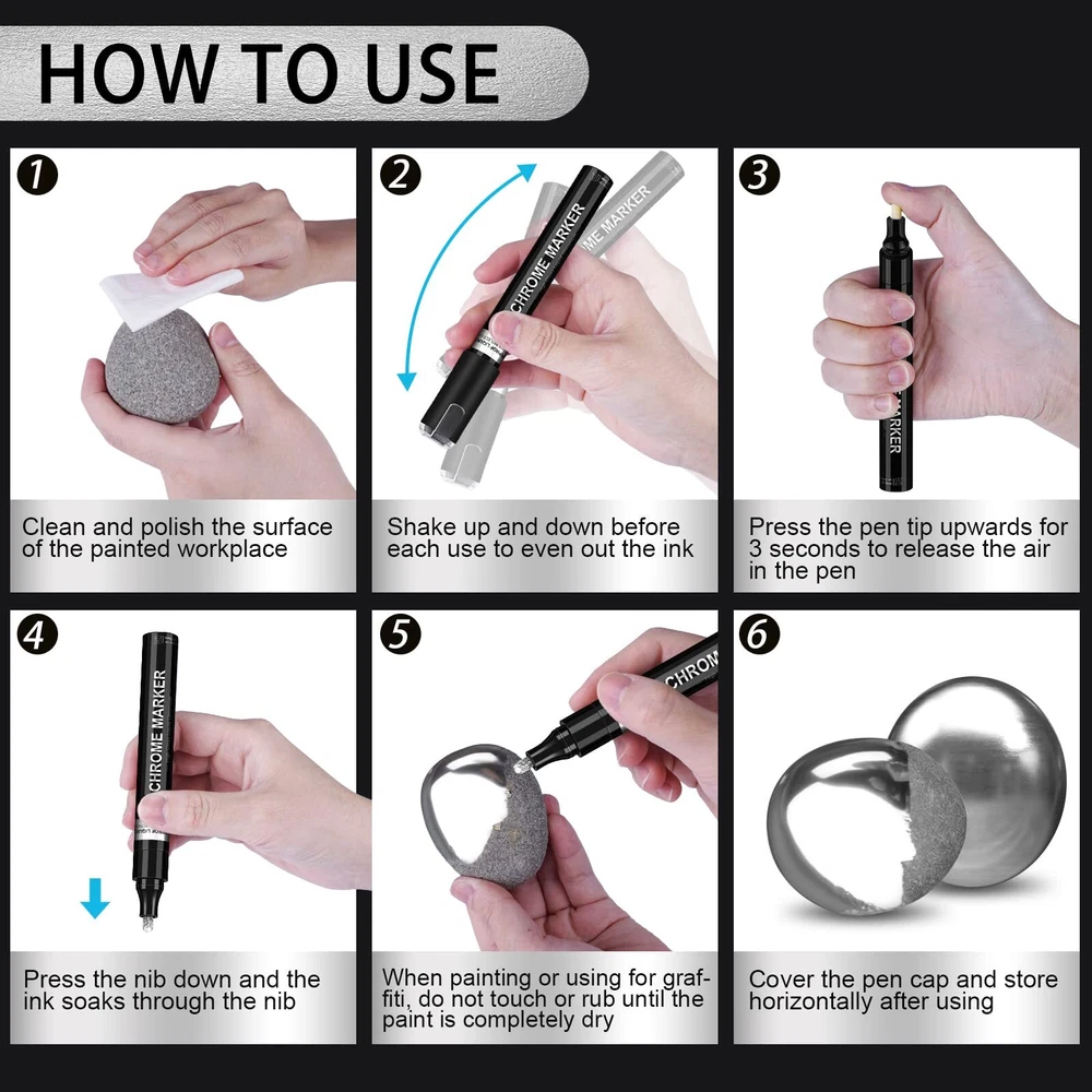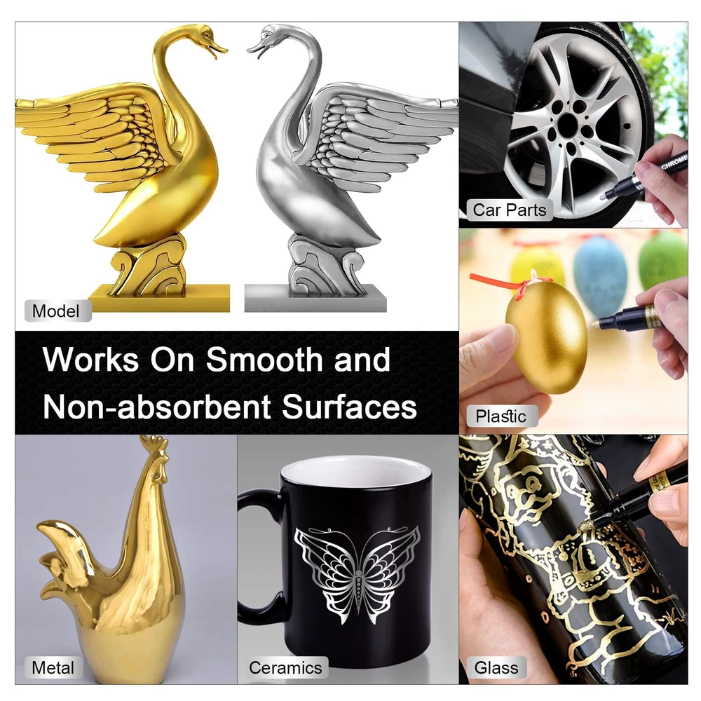 Safe & Durable Ink: Our mirror repair paint pens are made of unique oil-based inks that provide strong coverage. They are non-toxic, low-odor, xylene-free, and meet safety standards, making them safe for children and adults. They also have UV and weather resistance, maintaining a permanent long-lasting mirror effect on the surface of objects for a long time. Additionally, they effectively prevent surface oxidation and provide a protective layer against rust 3 Sizes Tips: The chrome marker set includes 5 silver Pens in 3 sizes to meet your creative needs, 0.7mm & 1mm nylon tip are suitable for Model Tracing or details working, 3mm medium fiber tip is suitable for large area graffiti, covering the unsightly scrape and provided a layer of protection against rust Mirror Chrome Effect: This highly pigmented marker creates a high-gloss real mirror effect in almost all smooth surfaces like plastic and glass. Chrome mirror pens are easier to work with than spray paint, great for DIYers or beginners. Perfect for detailing trim or coloring model cars, and add character to daily creations like illustrations, custom paintings, signature Wide Application: High gloss reflective chrome paint pens can be created on most smooth surfaces (such as plastic, glass, metal, clay, foam, black paper, canvas, gypsum, fiber, crafts and more ). It can be used for rocks painting, Easter plastic eggs, Christmas ball ornaments, wooden sign crafts, ceramic flower pots, photo frames, glasses, mugs, phone cases, shoes DIY, etc. The art chrome markers set is ideal present for beginners, professional artist or graffiti lover Easy to Use: Designed with innovative valve, the ink flows smoothly with no stops, leaks, or bleeding. After completely dry, it will water-resistant, anti-scratch, anti-ultraviolet and longer-lasting display. Shaking WITH THE CAP ON several times make the ink more even before each use. (Warm tips: For maximum luster, Do not touch your painted parts for at least 12 hours, it takes a while to dry and cure)